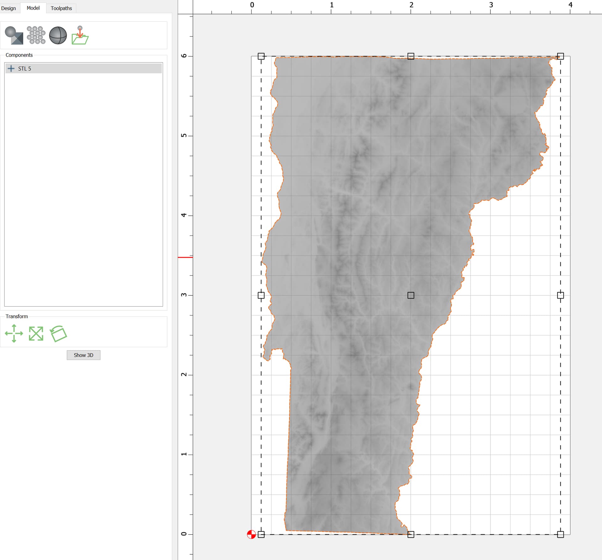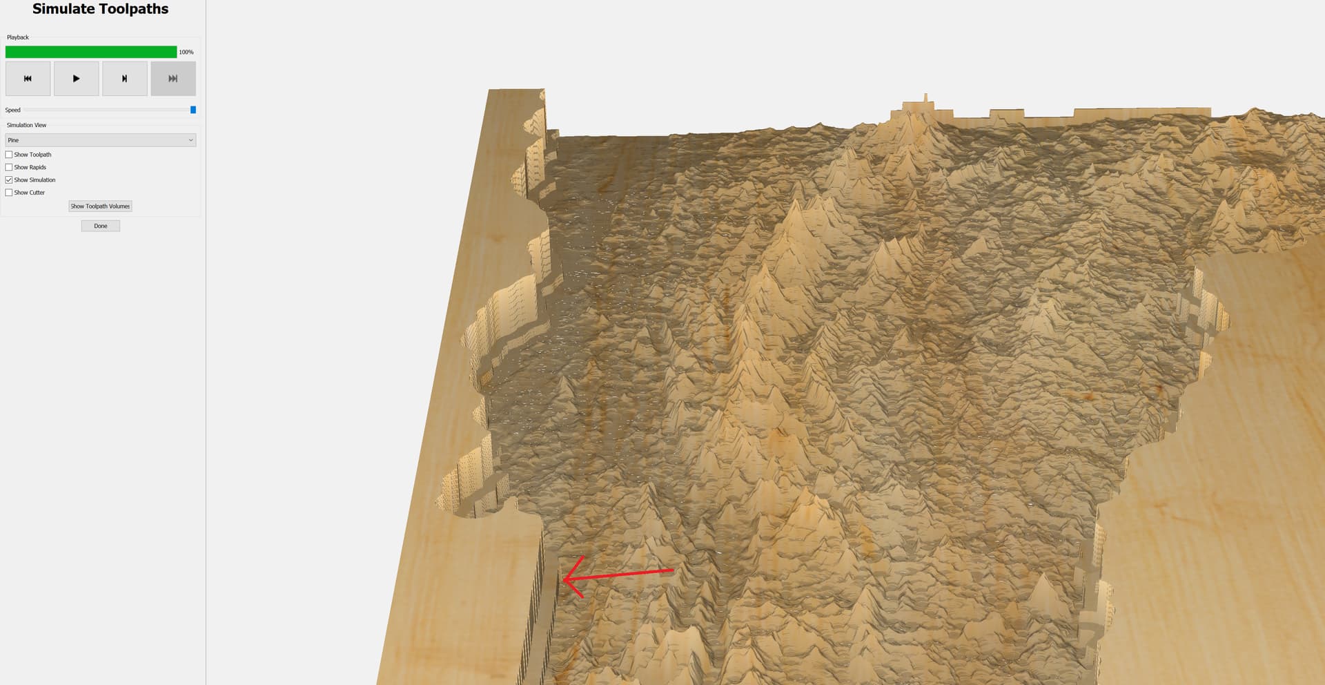 I’m very new to 3D toolpathing but consistently running into a weird issue. I created a 3D rough toolpath using a 1/8" endmill selecting my 3d object (topographical map of Vermont), then selected the same 3d object for a finish toolpath using a 1/32" endmill. The simulated result is leaving a significant “shelf” around the perimeter of the cut out, any ideas what’s going on?