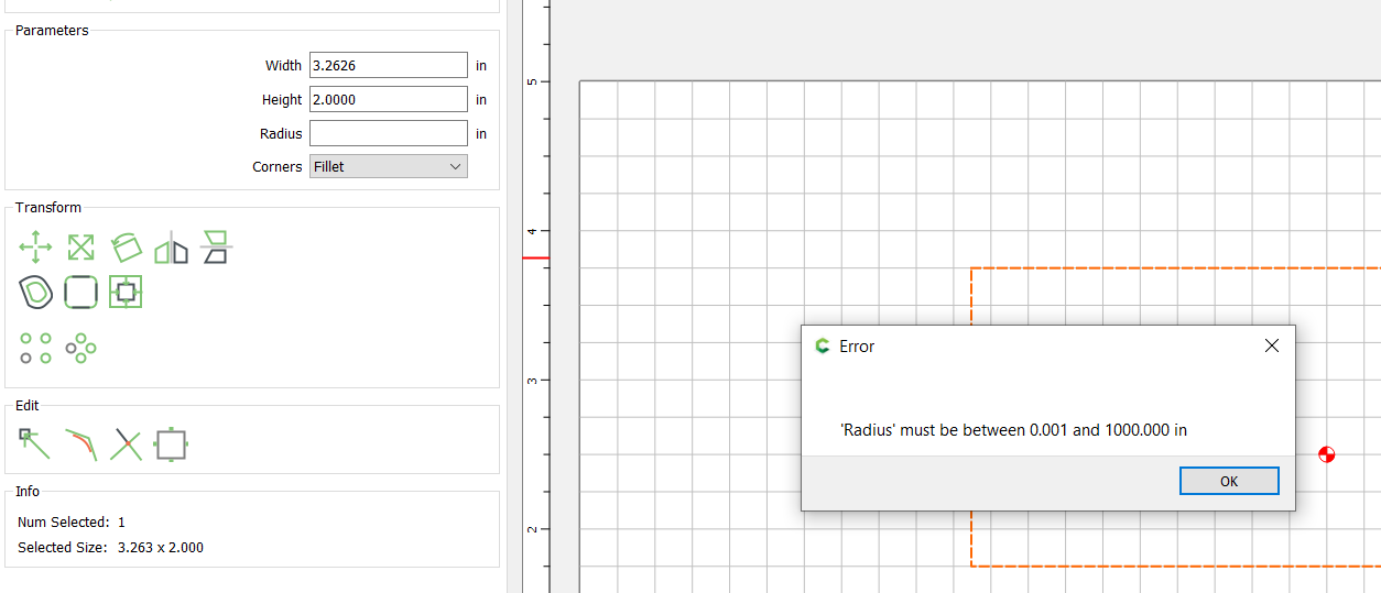 Make a rectangle. Select, and change height. I get a message indicating the radius must be within a range even though the rectangle has square corners. Clicking around eventually removes the message.