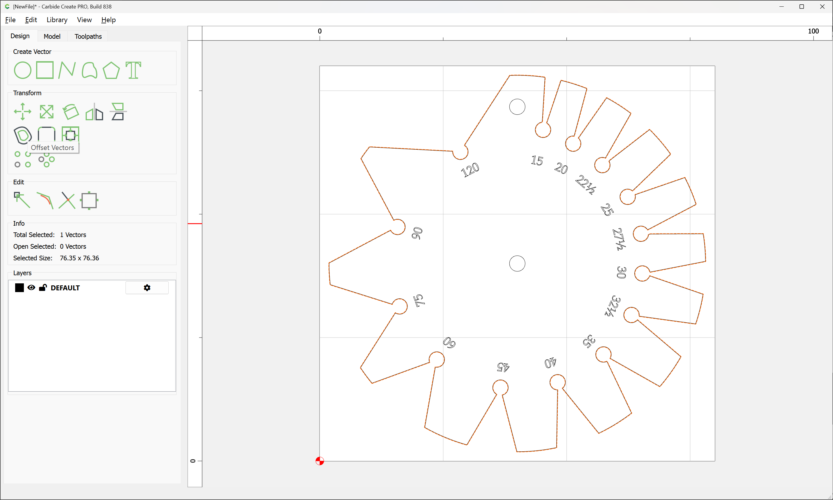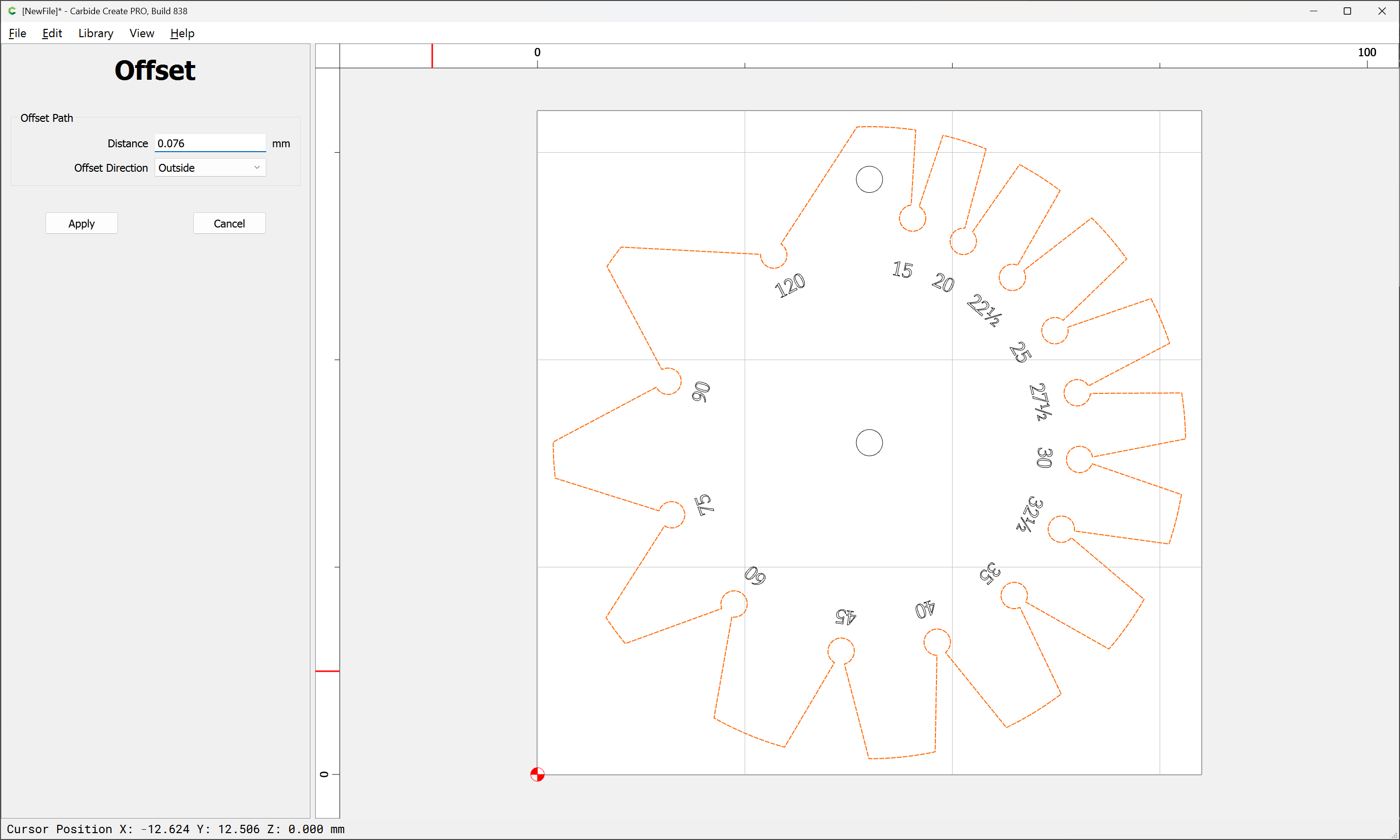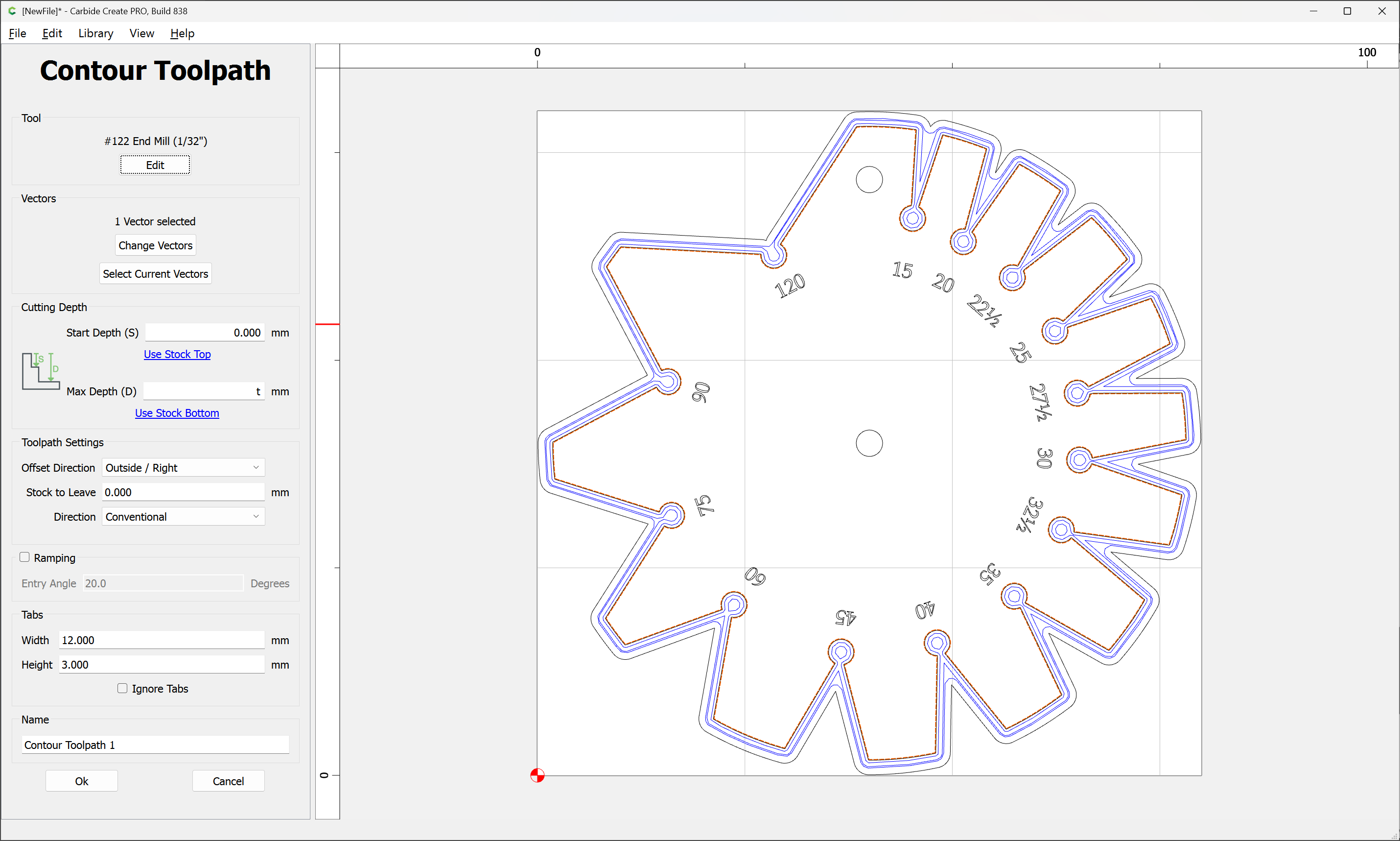 Due to the narrowness of the angles, an 0.03125" endmill has to be used, so after importing and scaling the file (we will be cutting out one which is 3") we select the perimeter and offset it twice, once by the desired chipload (0.01") and again by half again the endmill diameter: