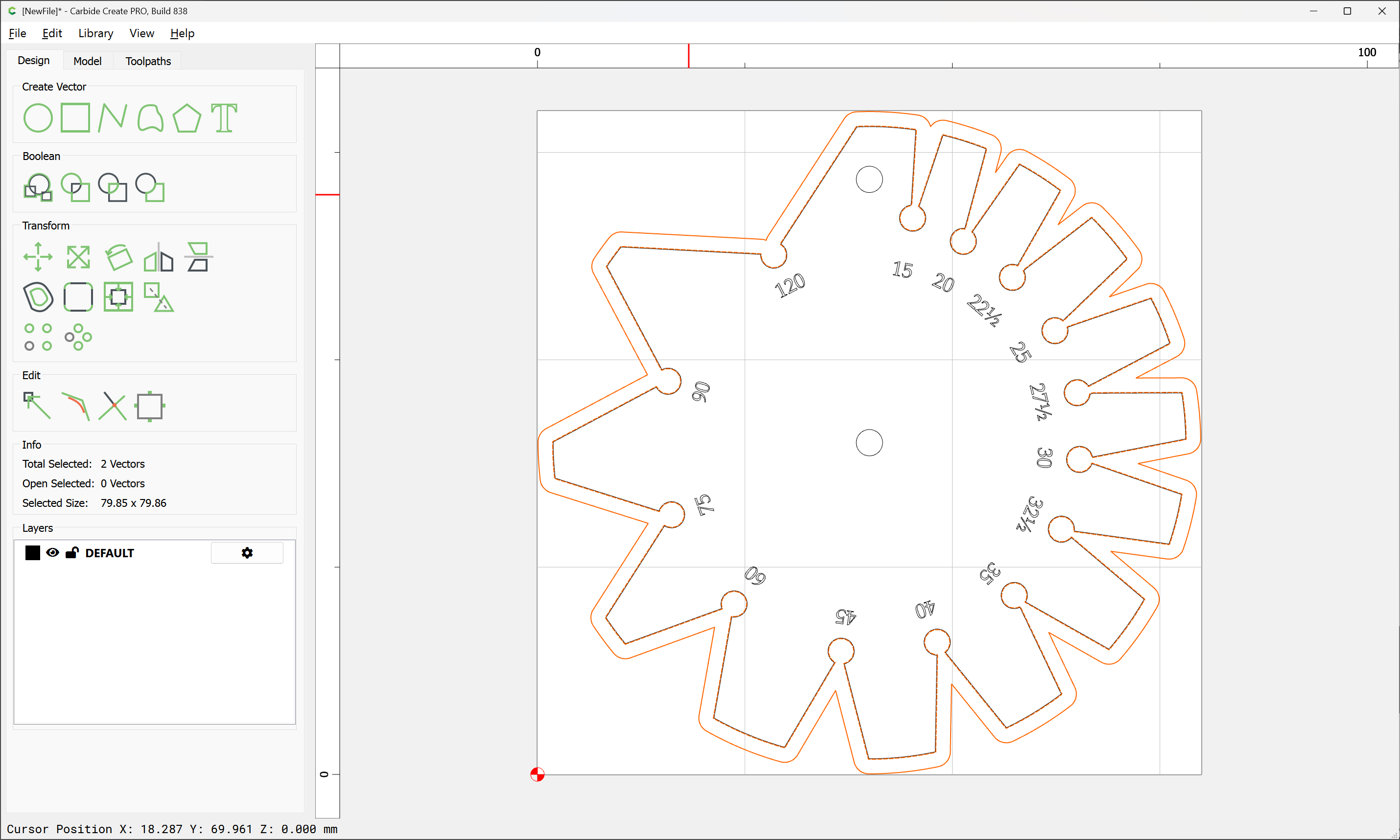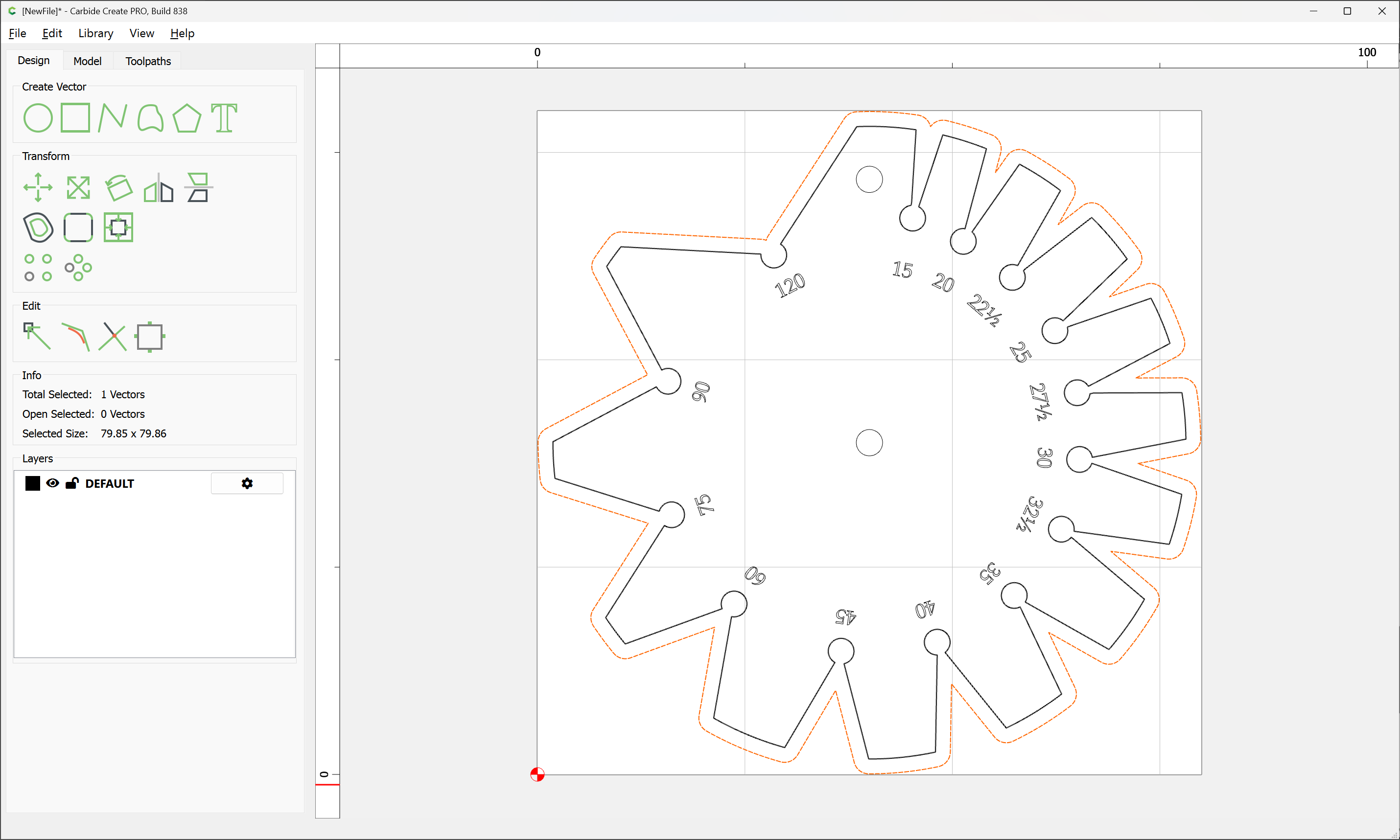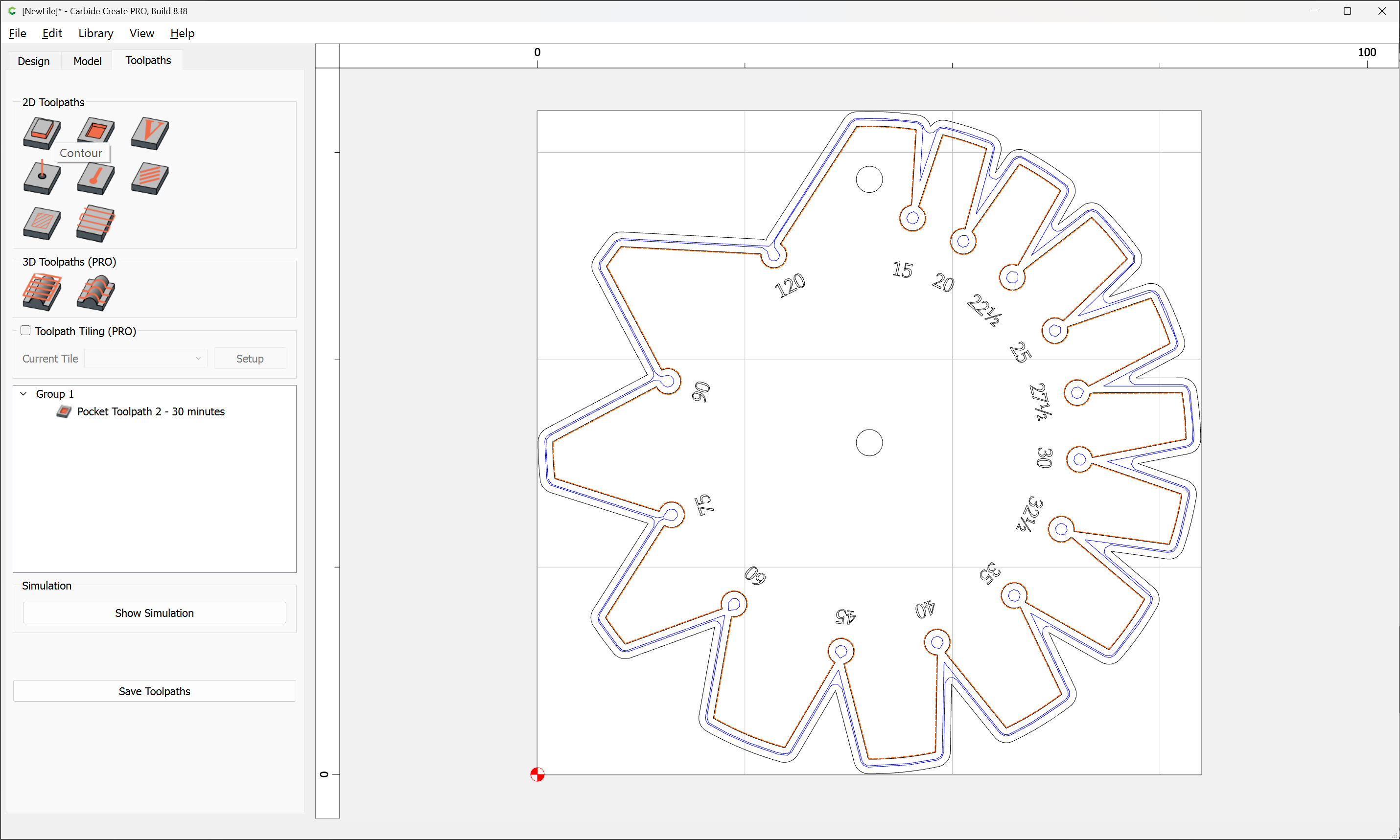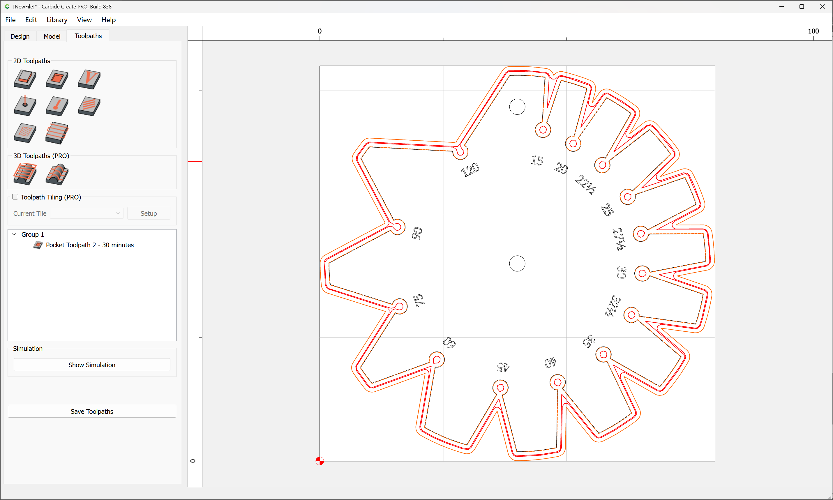 Due to the narrowness of the angles, an 0.03125" endmill has to be used, so after importing and scaling the file (we will be cutting out one which is 3") we select the perimeter and offset it twice, once by the desired chipload (0.01") and again by half again the endmill diameter: