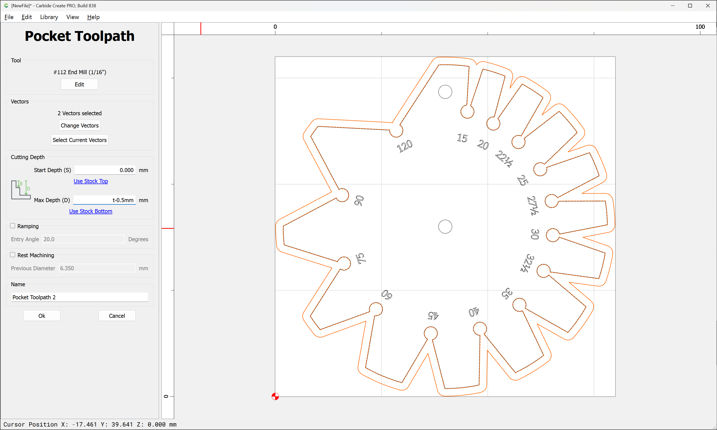 I wasn’t for a moment suggesting one should make the first counter cut the depth of the stock. Let it do its normal thing of taking small depth cuts on that pass. The pocket suggested in the first post would look much like this, except mine wouldn’t take a second pass to bring the pocket to its full width. The second, finish pass would be offset inward to the work by the given offset and the engagement would then be only to take off the thickness of the offset, whether you choose to go full depth at that point or not.