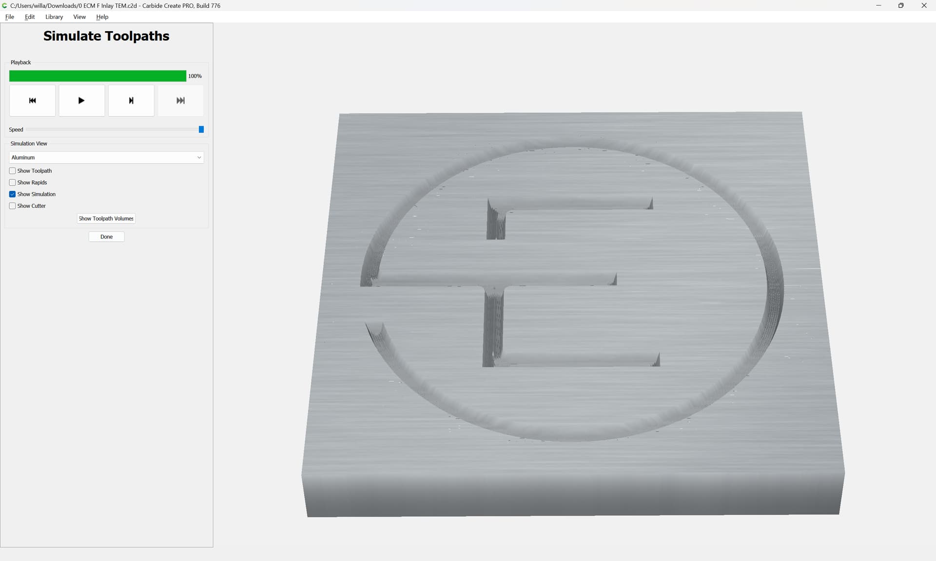 I am finding this very odd. When I download and open the file in CC757, the simulation does not match the tool path. The simulation is too shallow. If I replace the v tool with my own tool, the simulation matches the toolpath. I can fiddle with tool geometries, but I am still unable to force the simulation to not match the toolpath (the behavior of the file as downloaded). Is anyone else seeing this? I feel like I am missing something obvious. Here is my file where I have added a small rectangle, the toolpath generated for the small rectangle for my 30 degree bit. 0 ECM F Inlay TEM_bozod.c2d (56 KB)