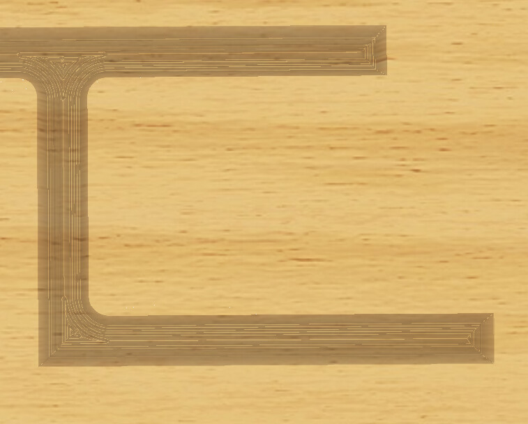 Dogbones and rounded inside corners will result when the true bit angle is less than the angle of the bit defined in CC. Rounded inside corners ( but no dogbones) will occur when zero is set above the stock. See the next pic. All toolpaths were for a 60 degree v bit defined in CC.