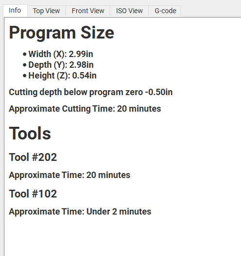 I set the same in Kiri. When I get the summary, it shows it is cutting below zero. The program size appear to be correct and unsure why it is cutting so low. Attached is the Program Summary and a zip of the Kiri:Moto file and gcode generated the kmz file will load all my settings into Kiri:Moto @ Kiri:Moto . Any help would be appreciated. TESTKIRI.zip (571.7 KB)