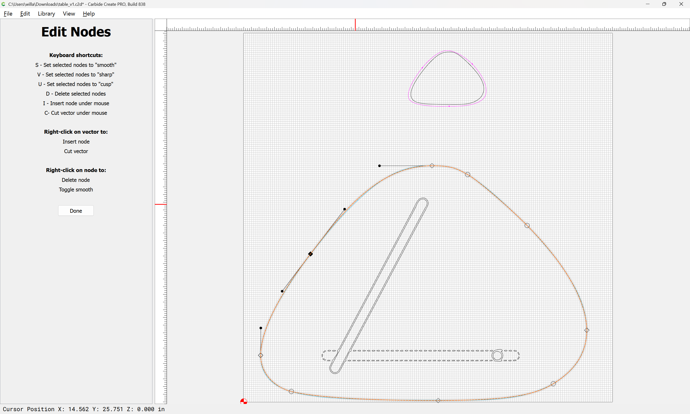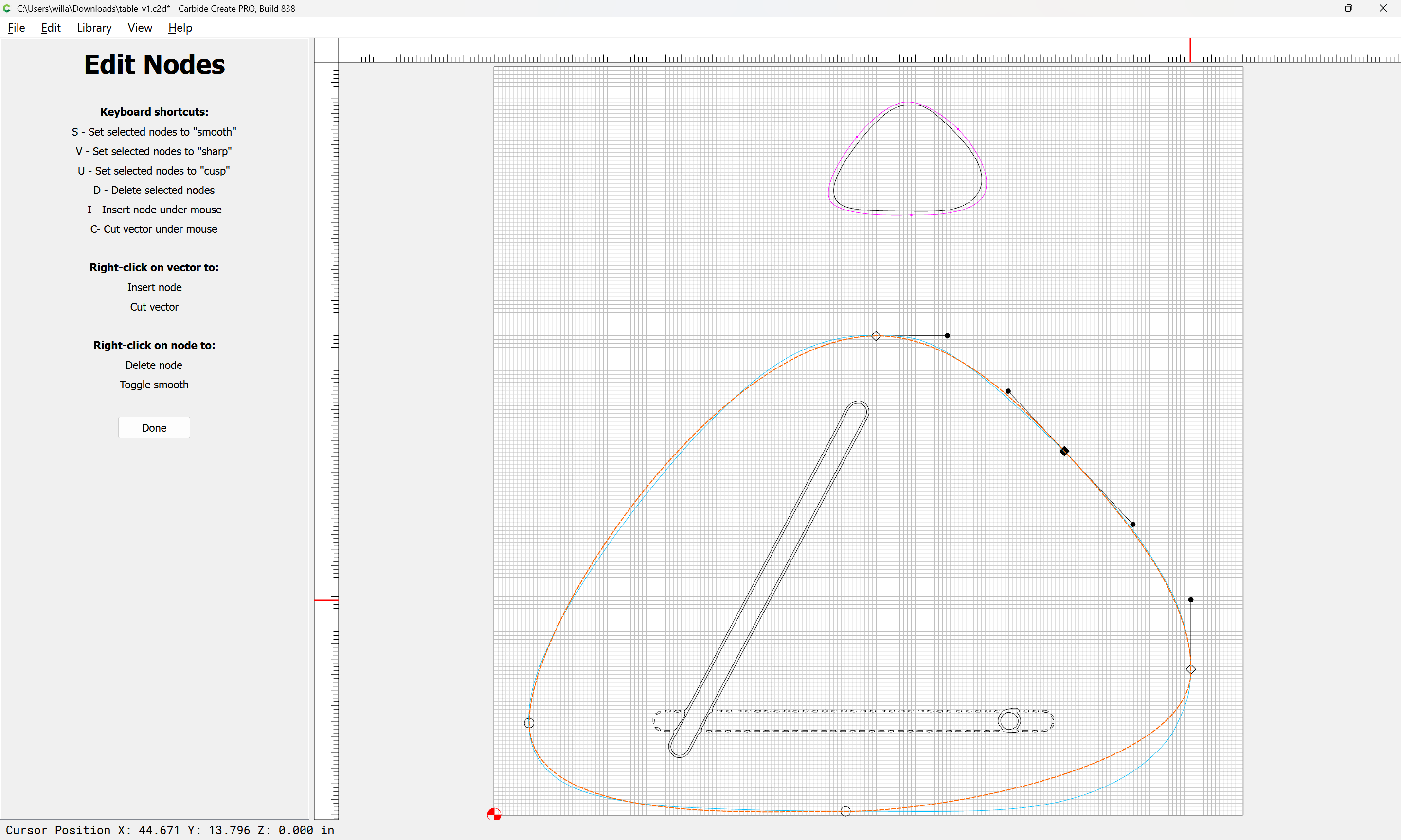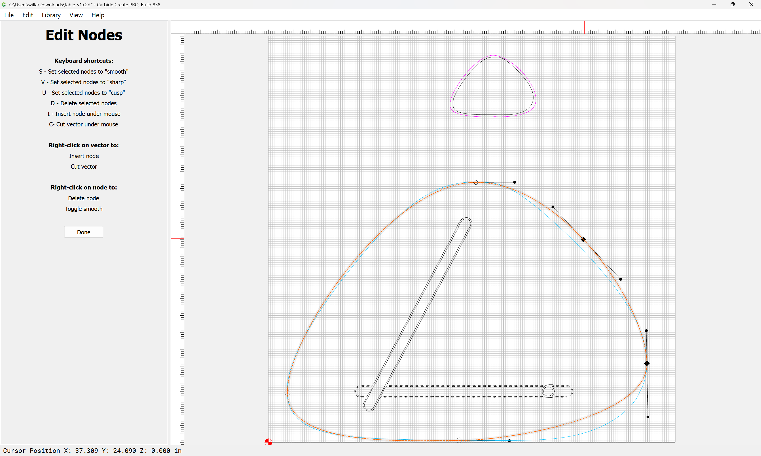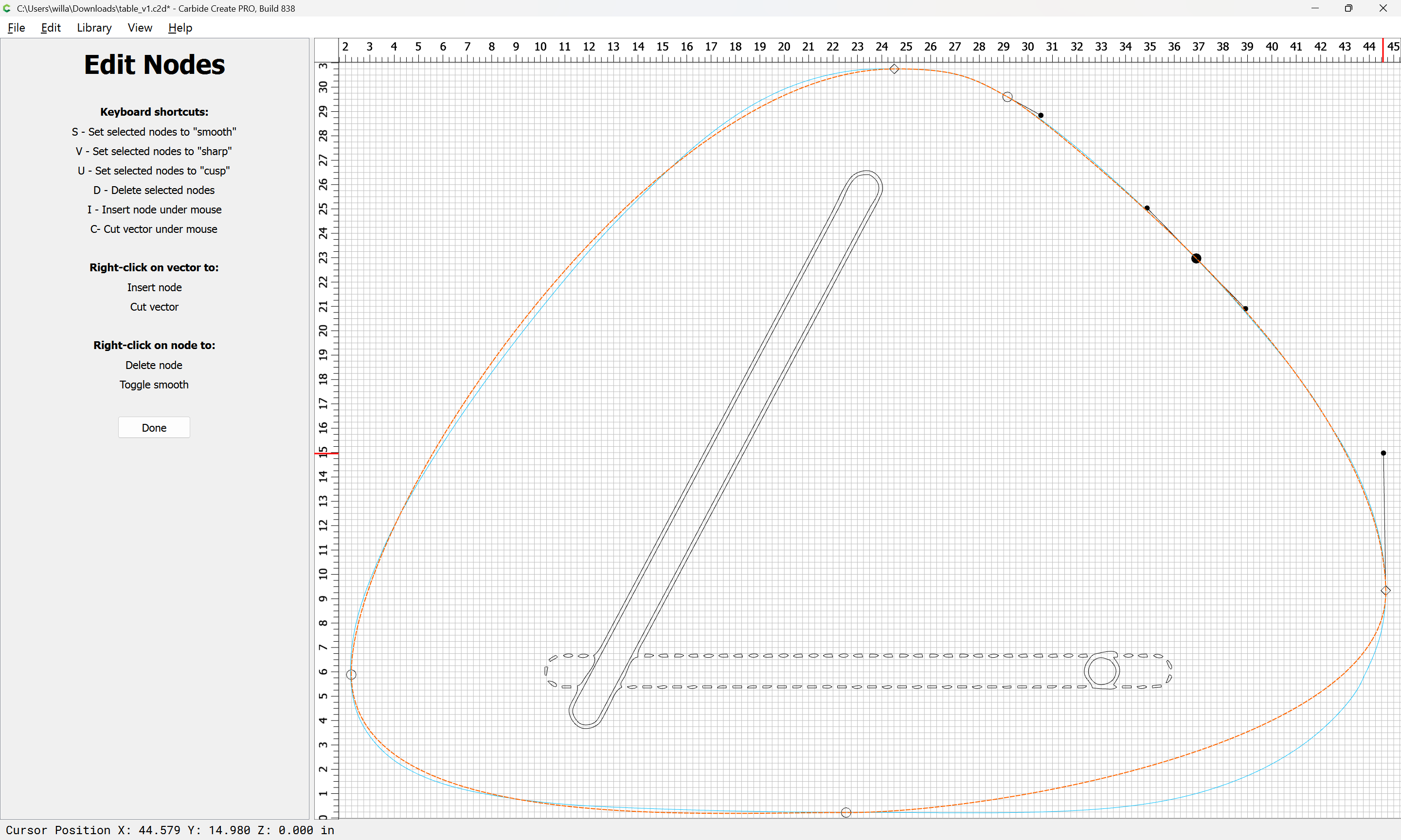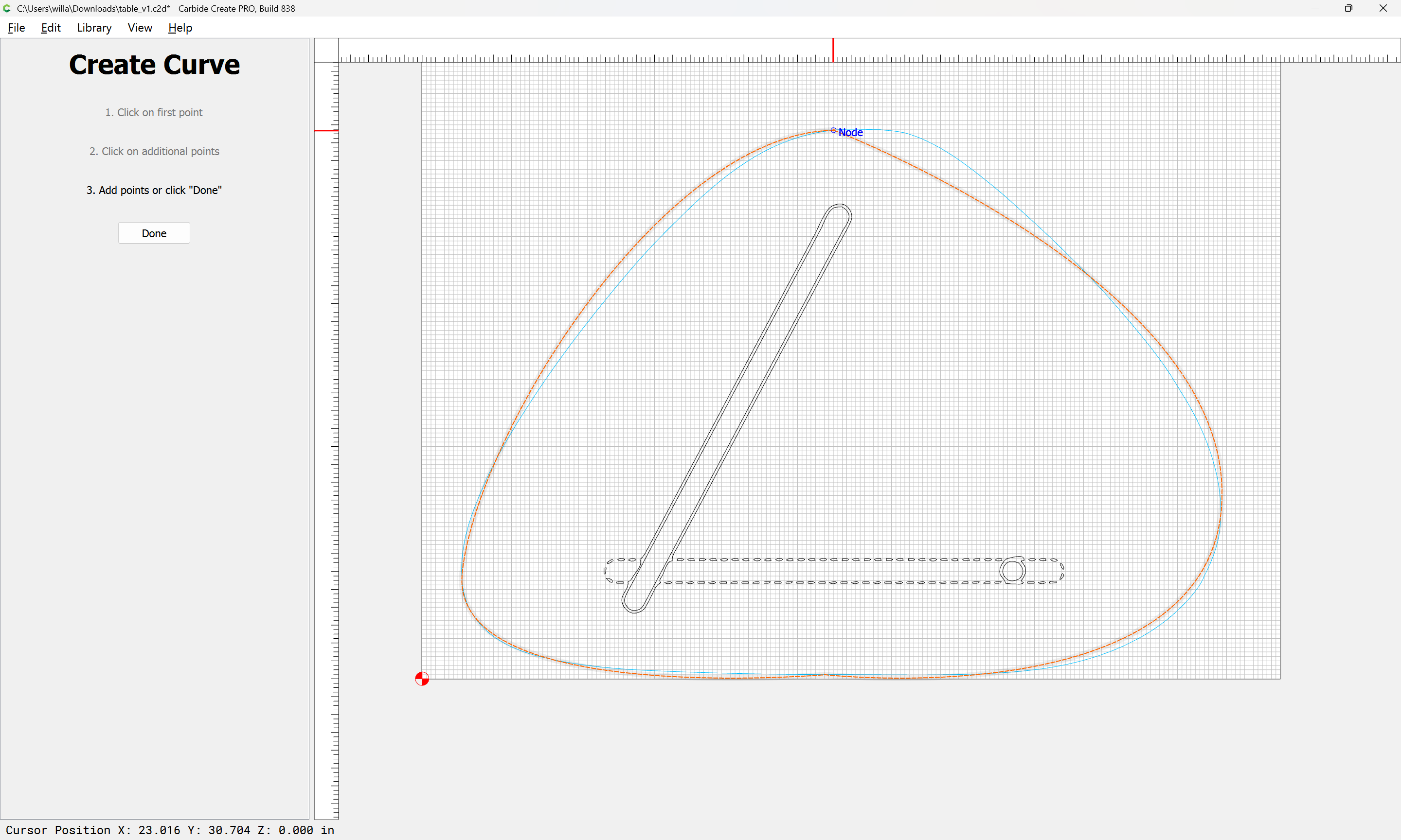 I am looking to create a similar table to the iconic Noguchi coffee table that features a triangular shape with differing rounded corners. That shape lends itself to the Curve tool very well, but I cannot for the life of me create a completely convex (no inward facing edges/nodes) shape using the curve tool alone. I always end up with one concave node. I’ve tried this in Carbide Create as well as the Bezier tool in Inkscape. Inkscape offers a little more flexibility in editing and rearranging the nodes as well as some “Simplify” tools to smooth things out, but in the end the shape ends up still having odd bumps, lumps, or other imperfections.