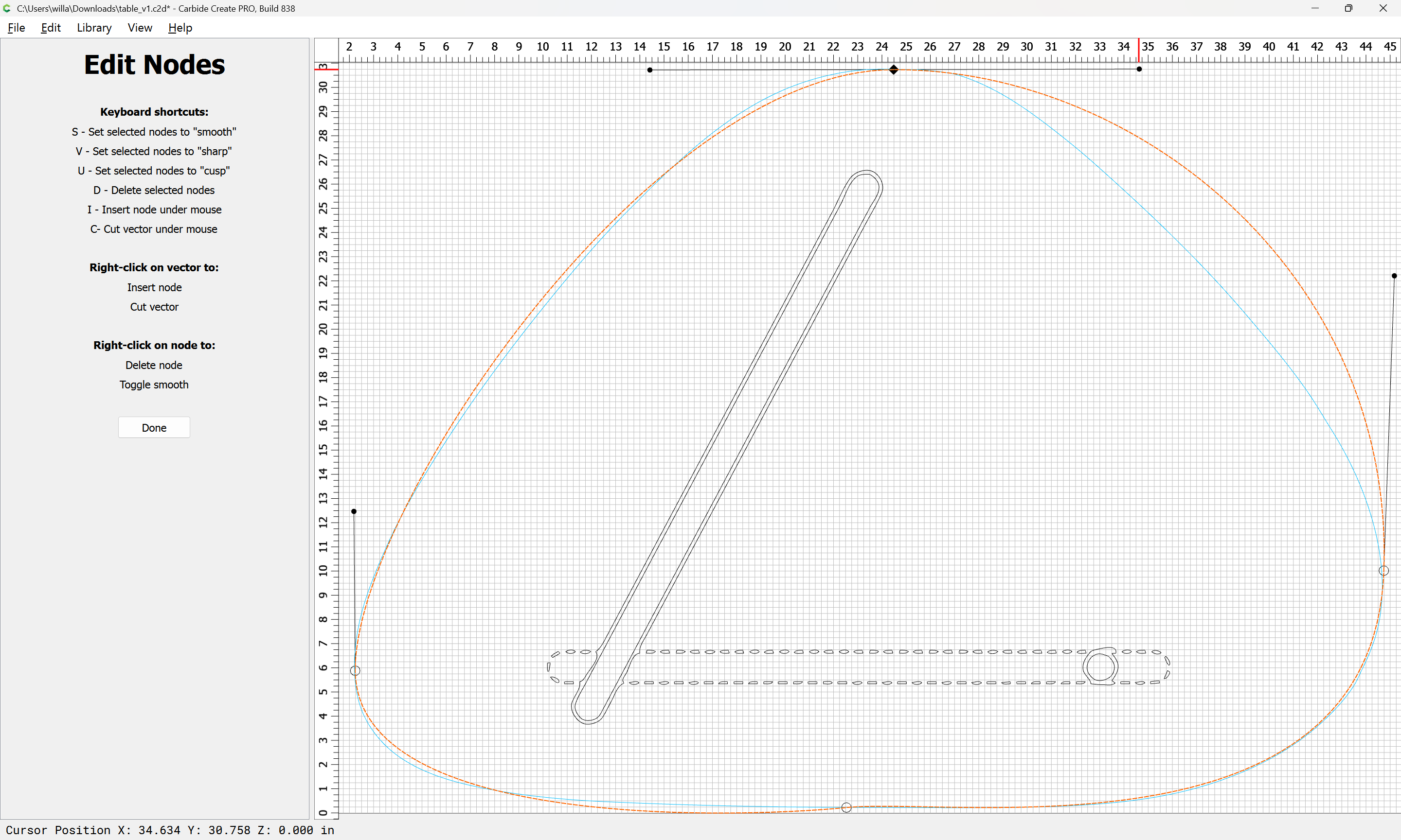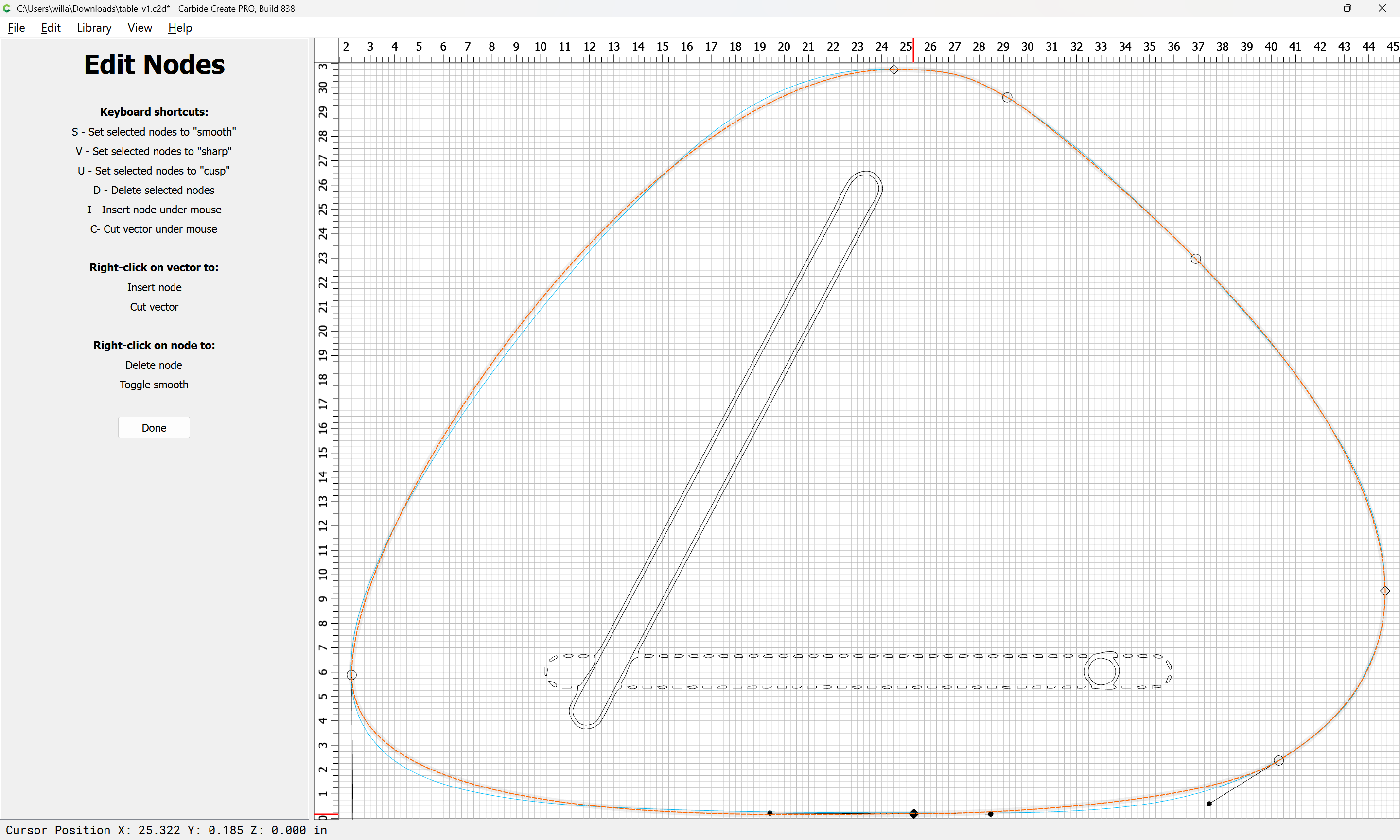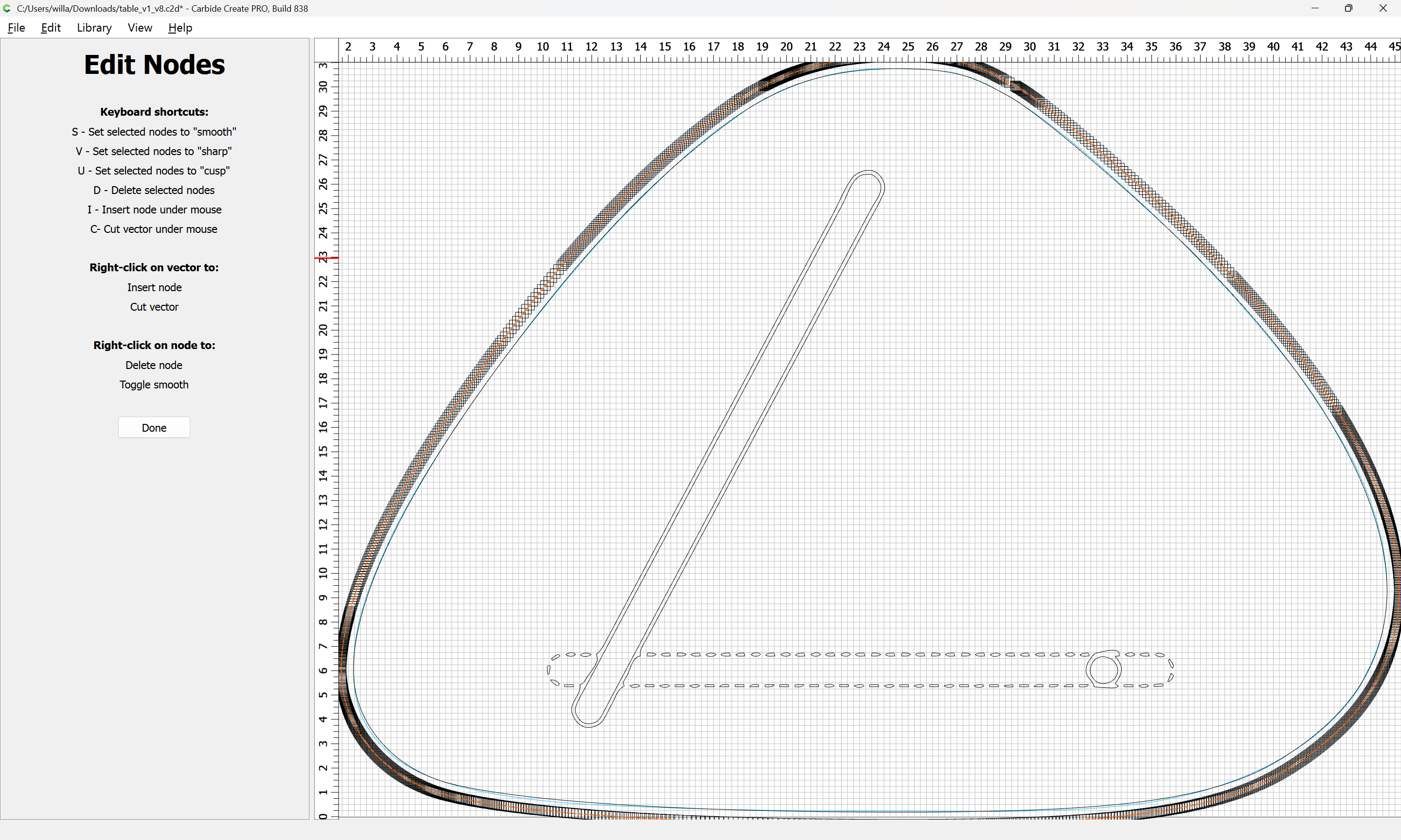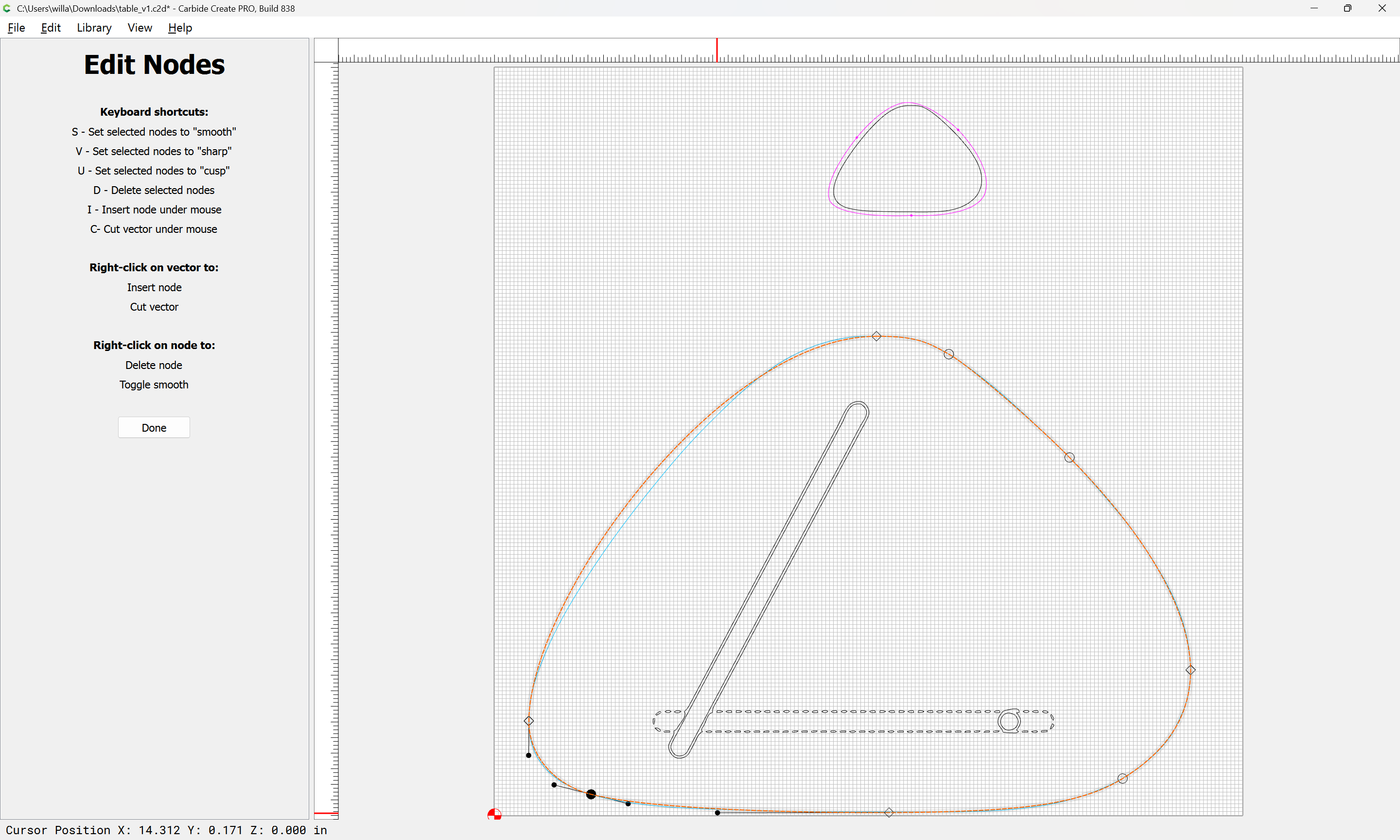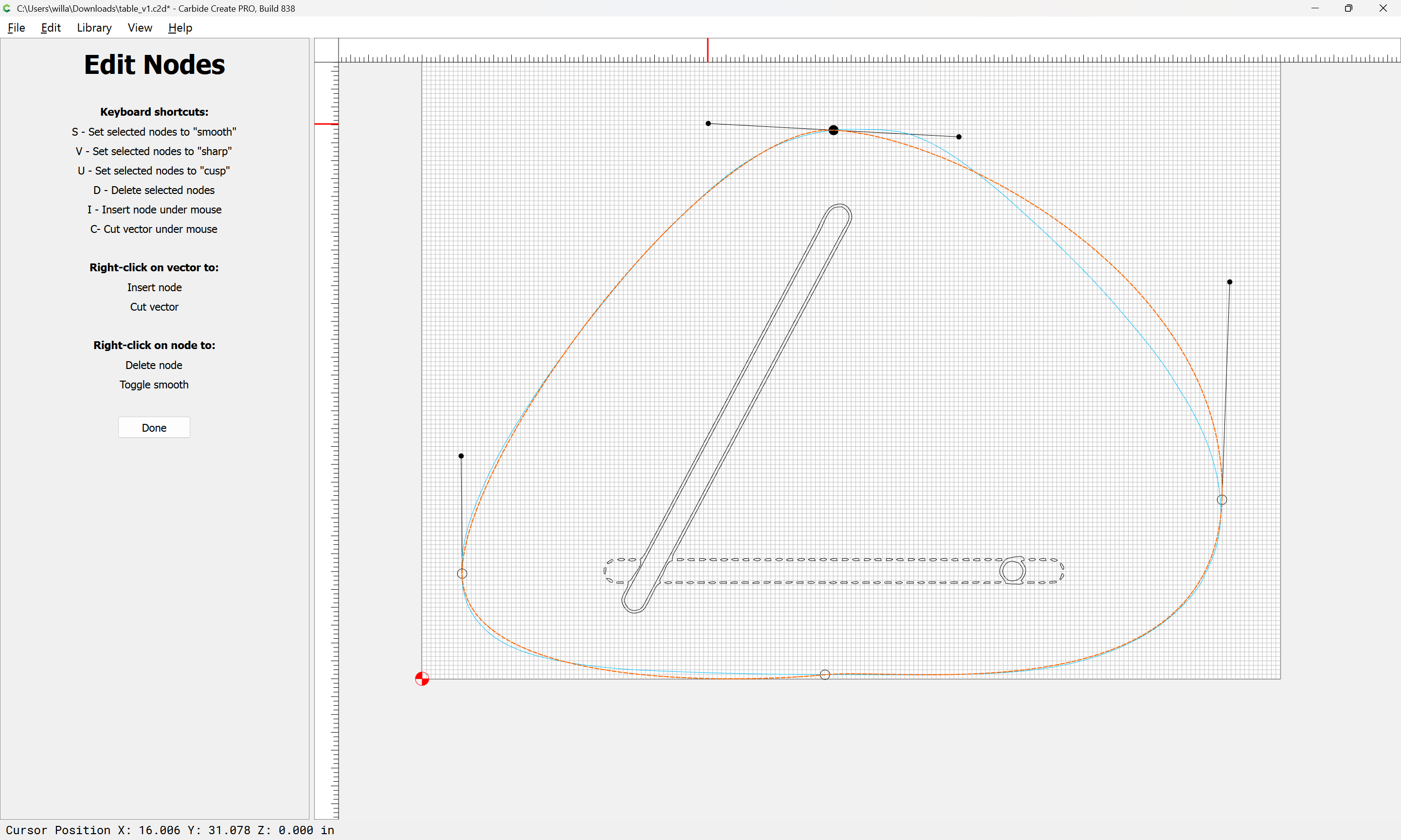 I am looking to create a similar table to the iconic Noguchi coffee table that features a triangular shape with differing rounded corners. That shape lends itself to the Curve tool very well, but I cannot for the life of me create a completely convex (no inward facing edges/nodes) shape using the curve tool alone. I always end up with one concave node. I’ve tried this in Carbide Create as well as the Bezier tool in Inkscape. Inkscape offers a little more flexibility in editing and rearranging the nodes as well as some “Simplify” tools to smooth things out, but in the end the shape ends up still having odd bumps, lumps, or other imperfections.