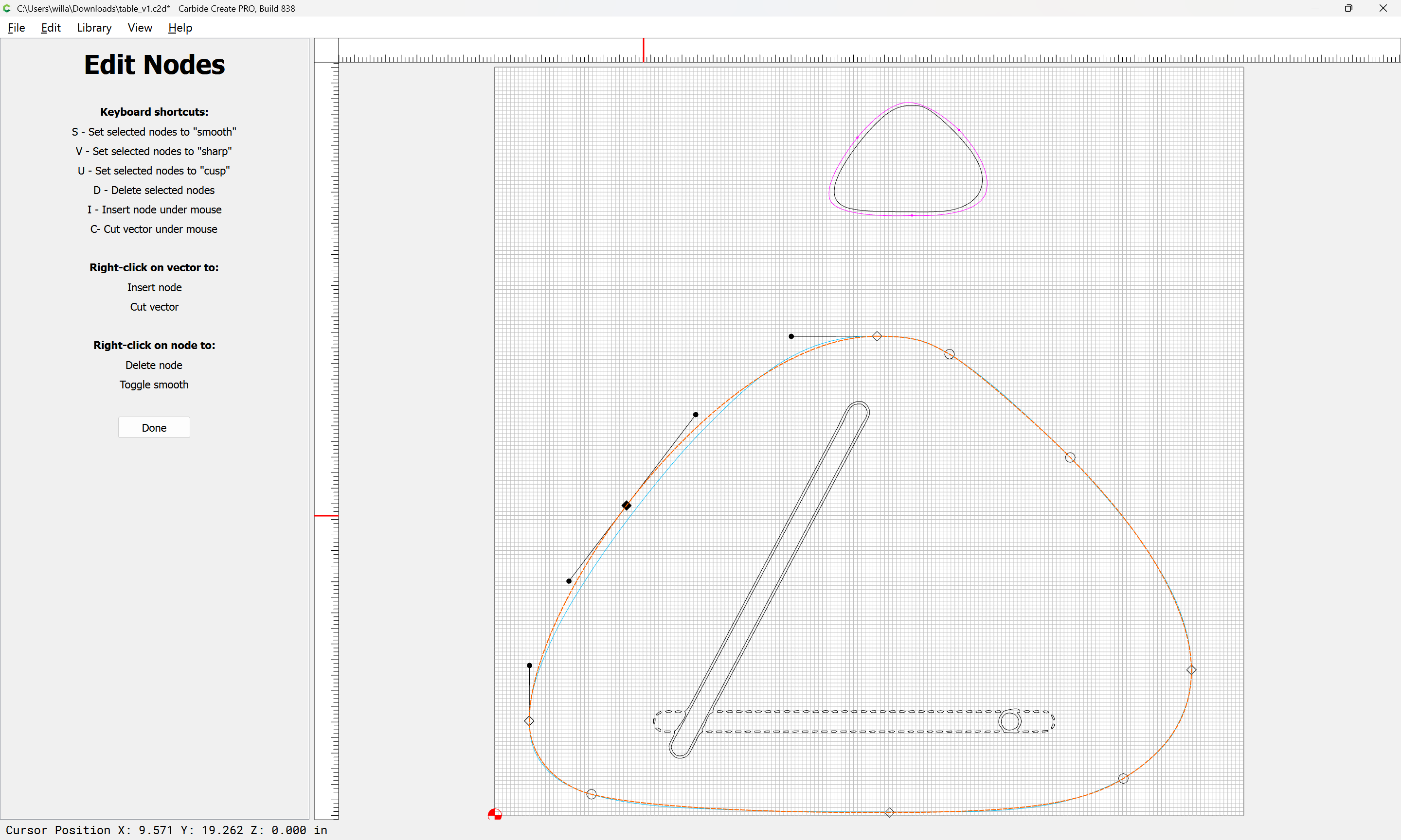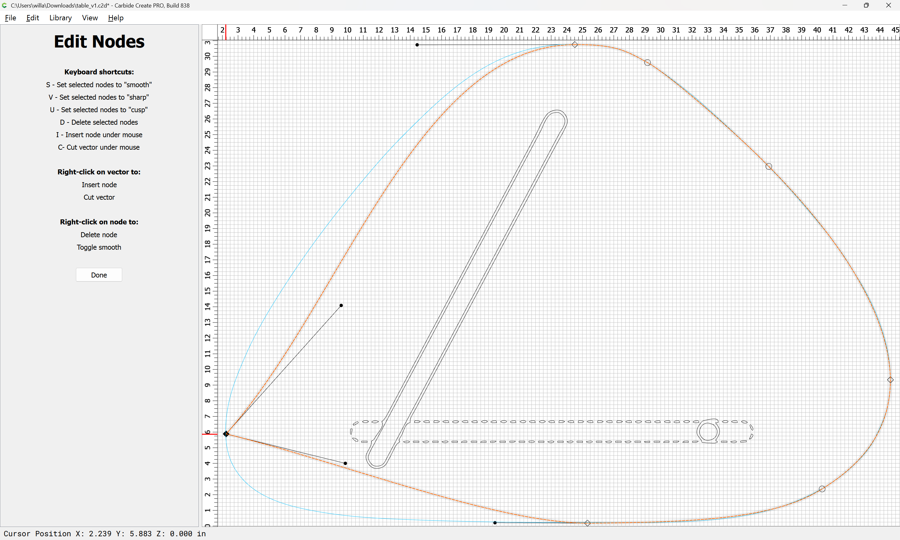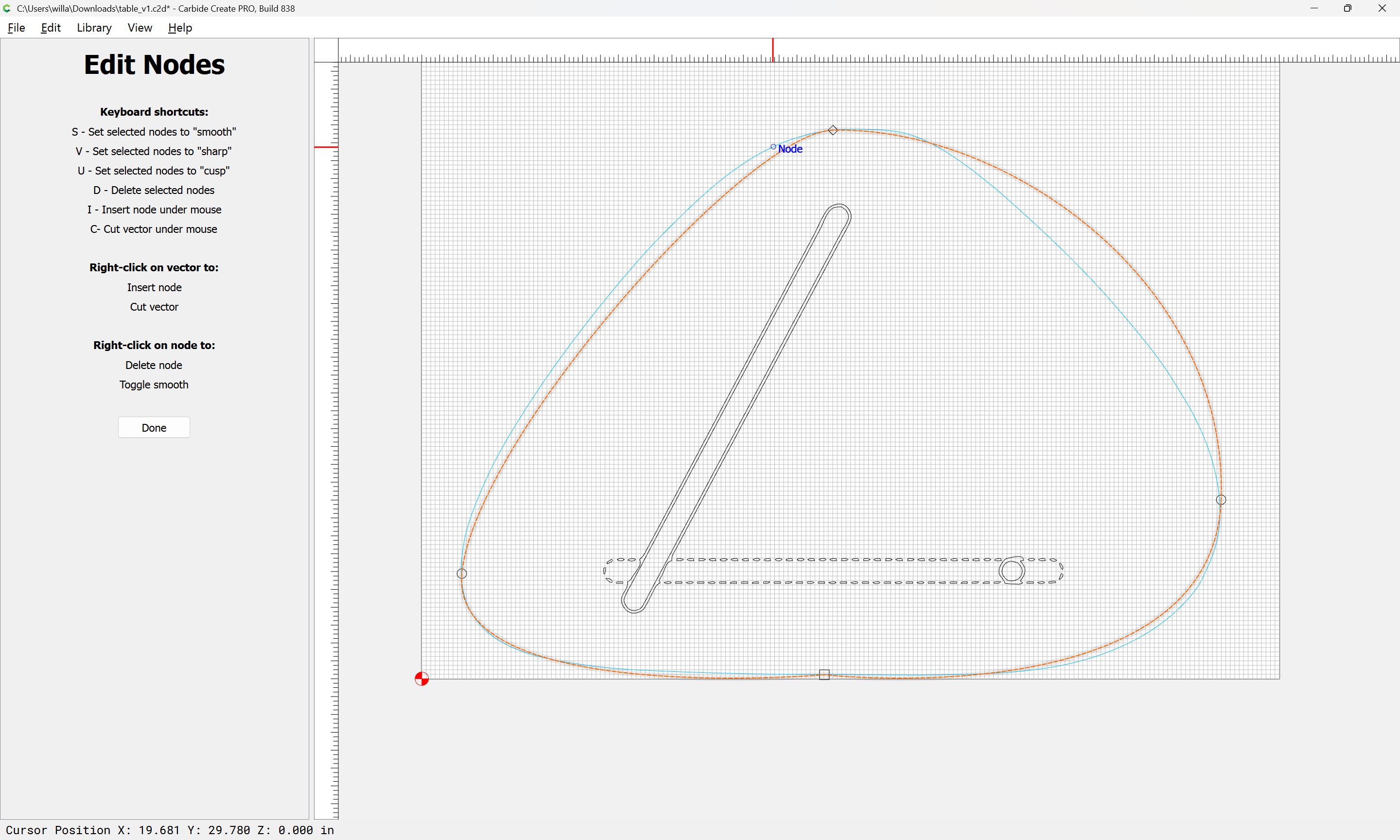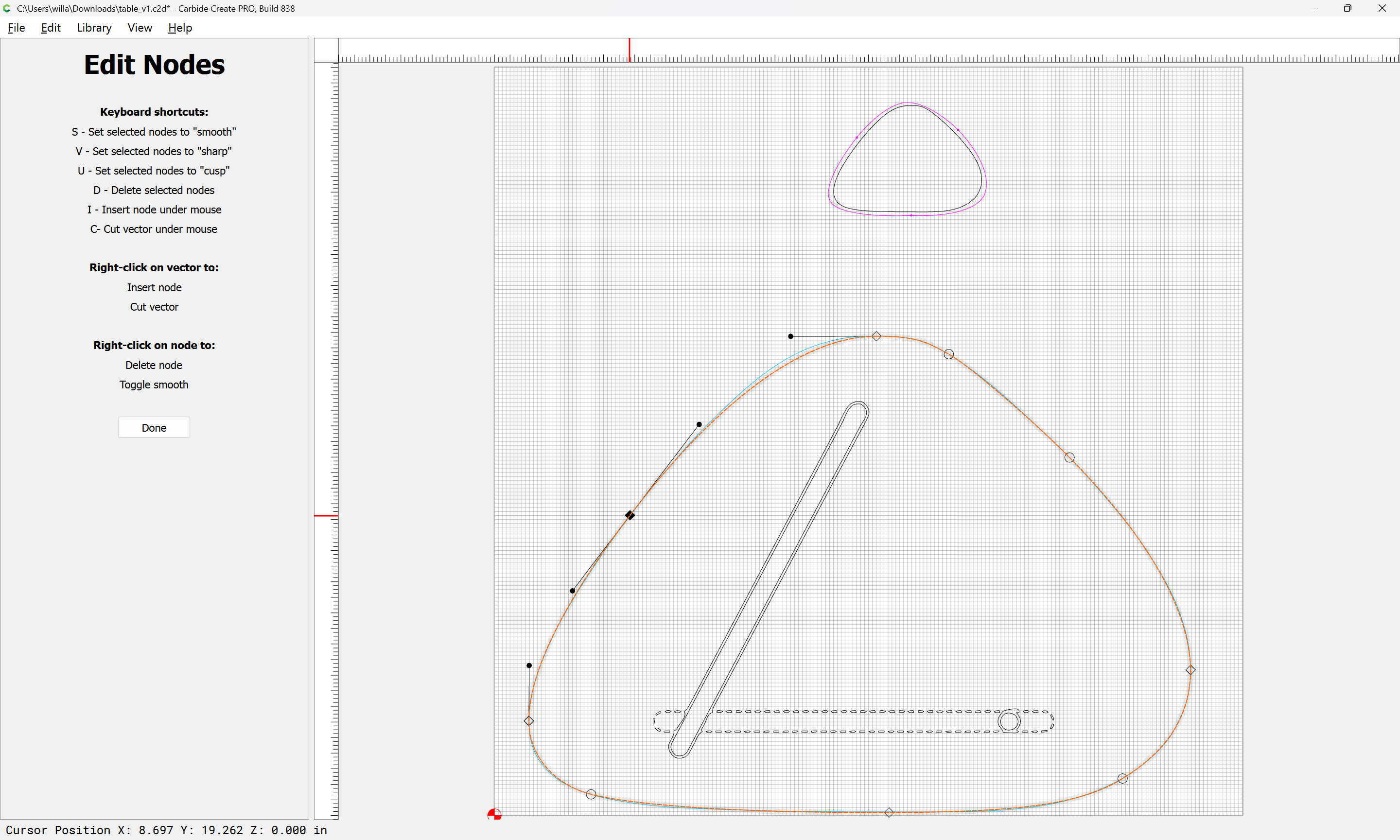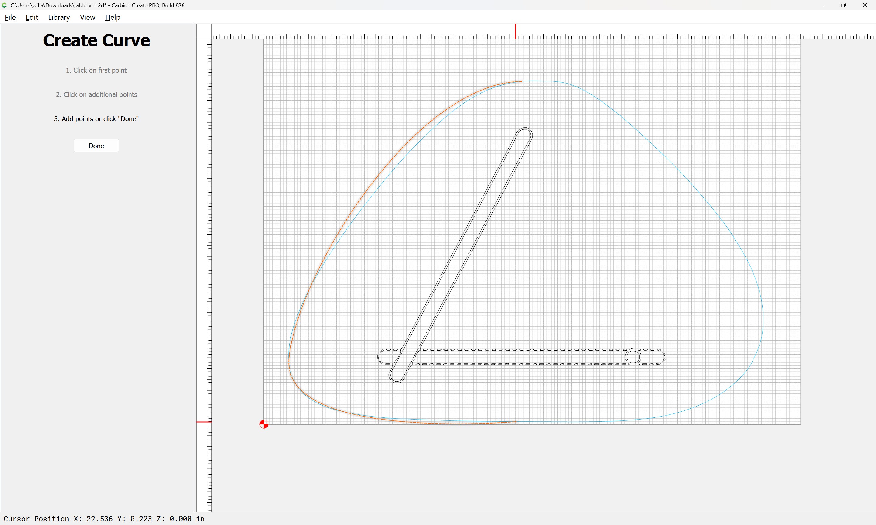 I am looking to create a similar table to the iconic Noguchi coffee table that features a triangular shape with differing rounded corners. That shape lends itself to the Curve tool very well, but I cannot for the life of me create a completely convex (no inward facing edges/nodes) shape using the curve tool alone. I always end up with one concave node. I’ve tried this in Carbide Create as well as the Bezier tool in Inkscape. Inkscape offers a little more flexibility in editing and rearranging the nodes as well as some “Simplify” tools to smooth things out, but in the end the shape ends up still having odd bumps, lumps, or other imperfections.