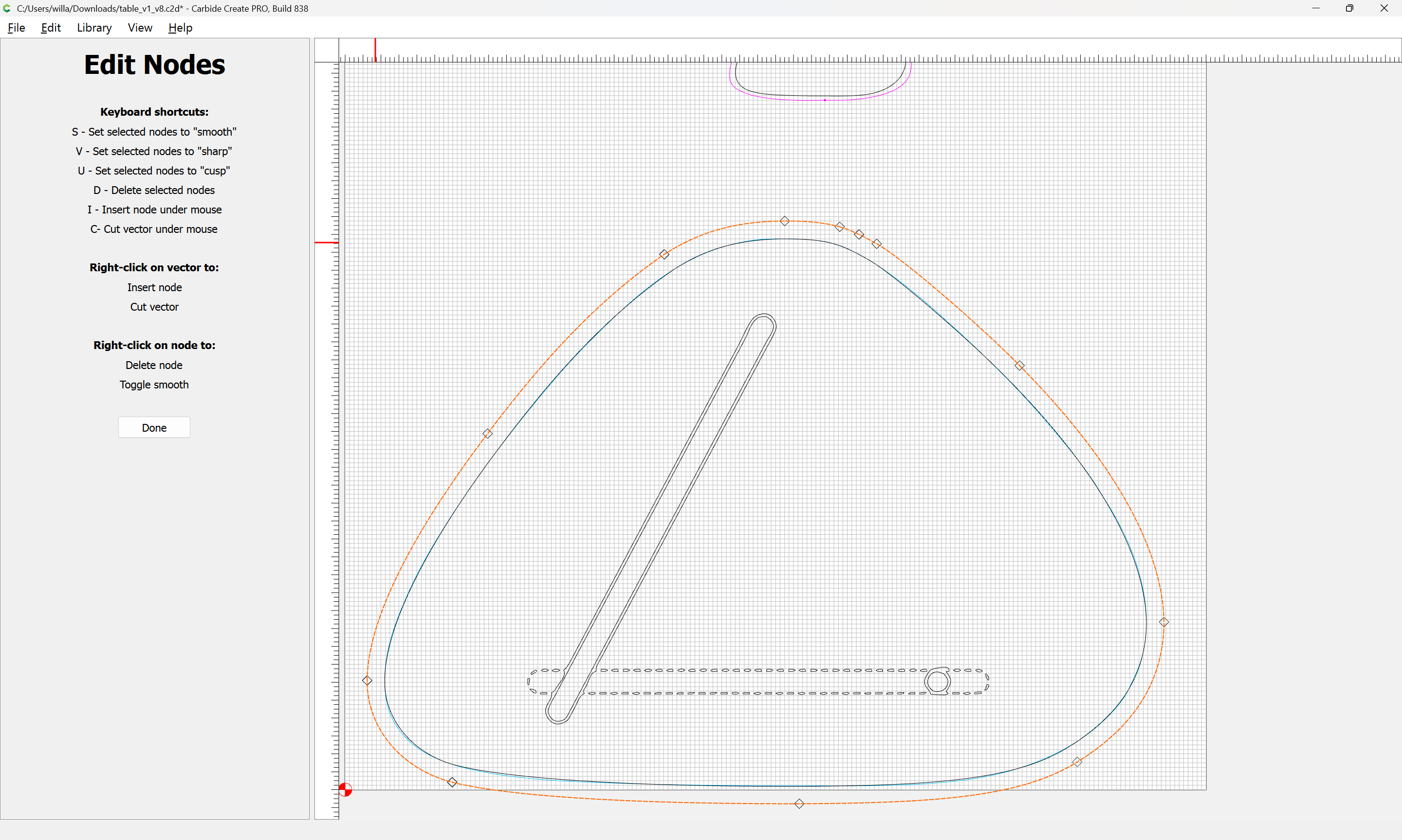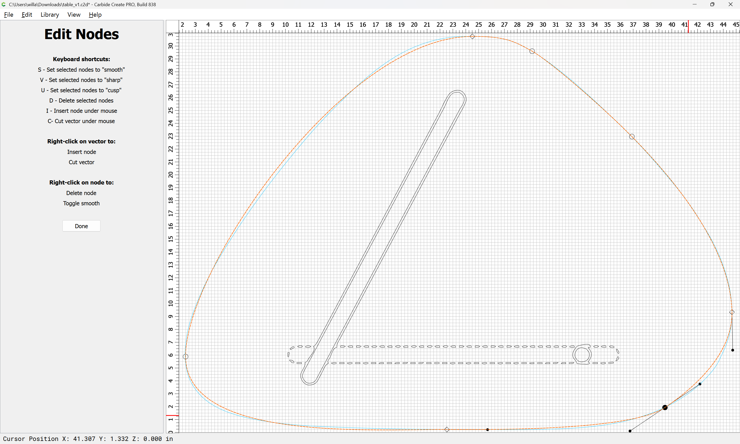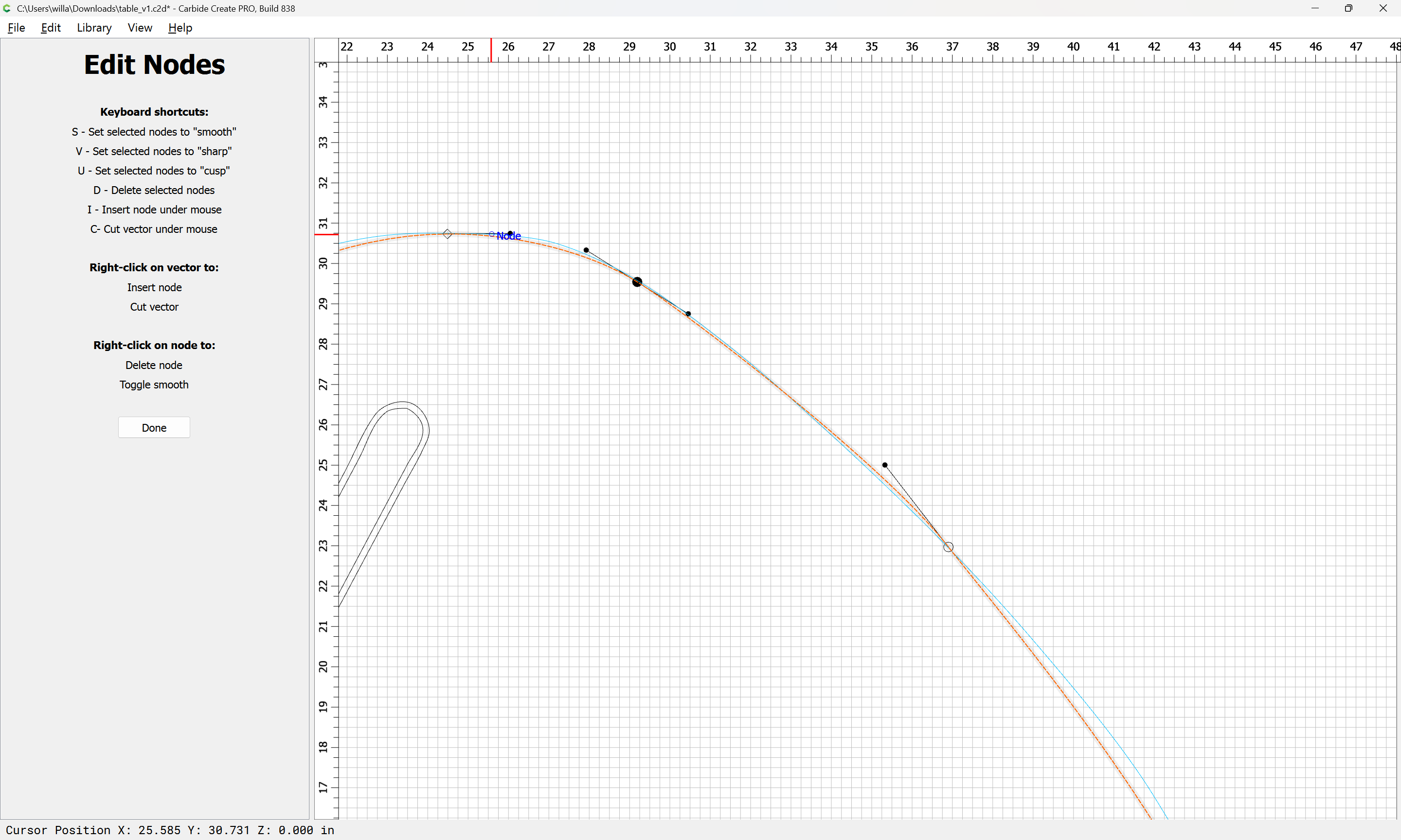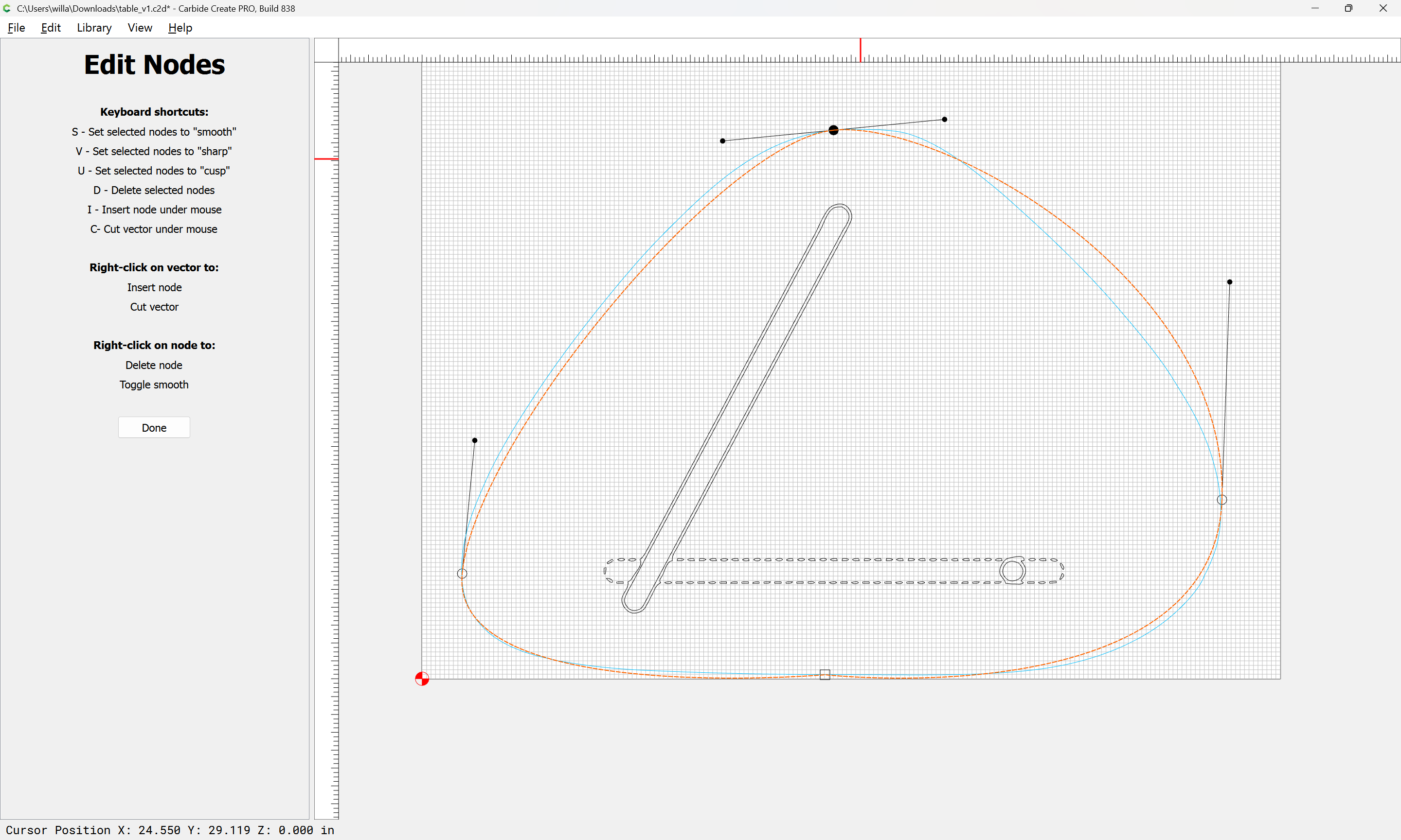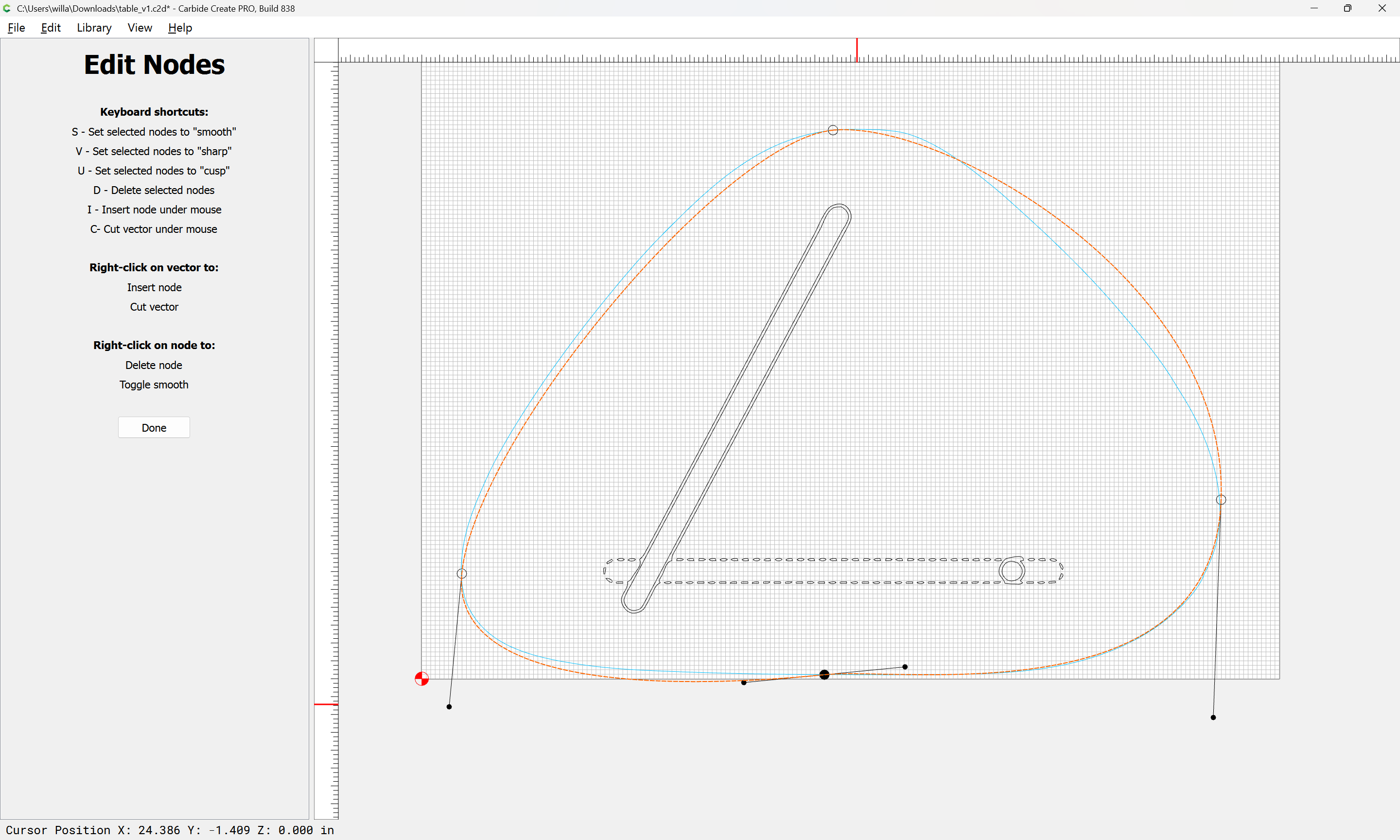 I am looking to create a similar table to the iconic Noguchi coffee table that features a triangular shape with differing rounded corners. That shape lends itself to the Curve tool very well, but I cannot for the life of me create a completely convex (no inward facing edges/nodes) shape using the curve tool alone. I always end up with one concave node. I’ve tried this in Carbide Create as well as the Bezier tool in Inkscape. Inkscape offers a little more flexibility in editing and rearranging the nodes as well as some “Simplify” tools to smooth things out, but in the end the shape ends up still having odd bumps, lumps, or other imperfections.