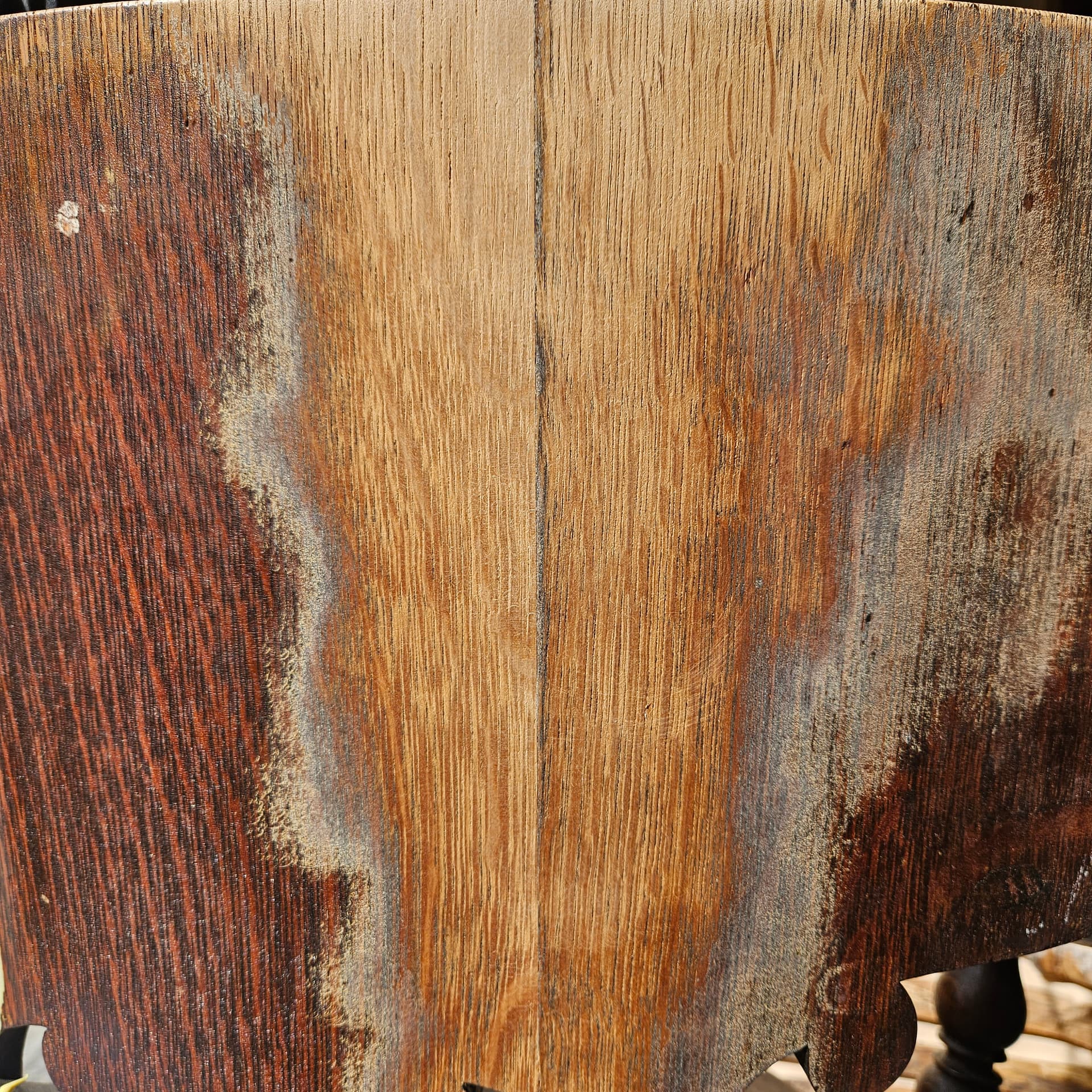 People did not always stain oak but rather fumed it in an ammonia chamber. Plus UV light tends to turn most wood darker over time. So if it was fumed the ammonia reacts with the tanic acid in the oak and turns it darker. If that was the case the dark part is just on the surface as you can see by the worn arms.