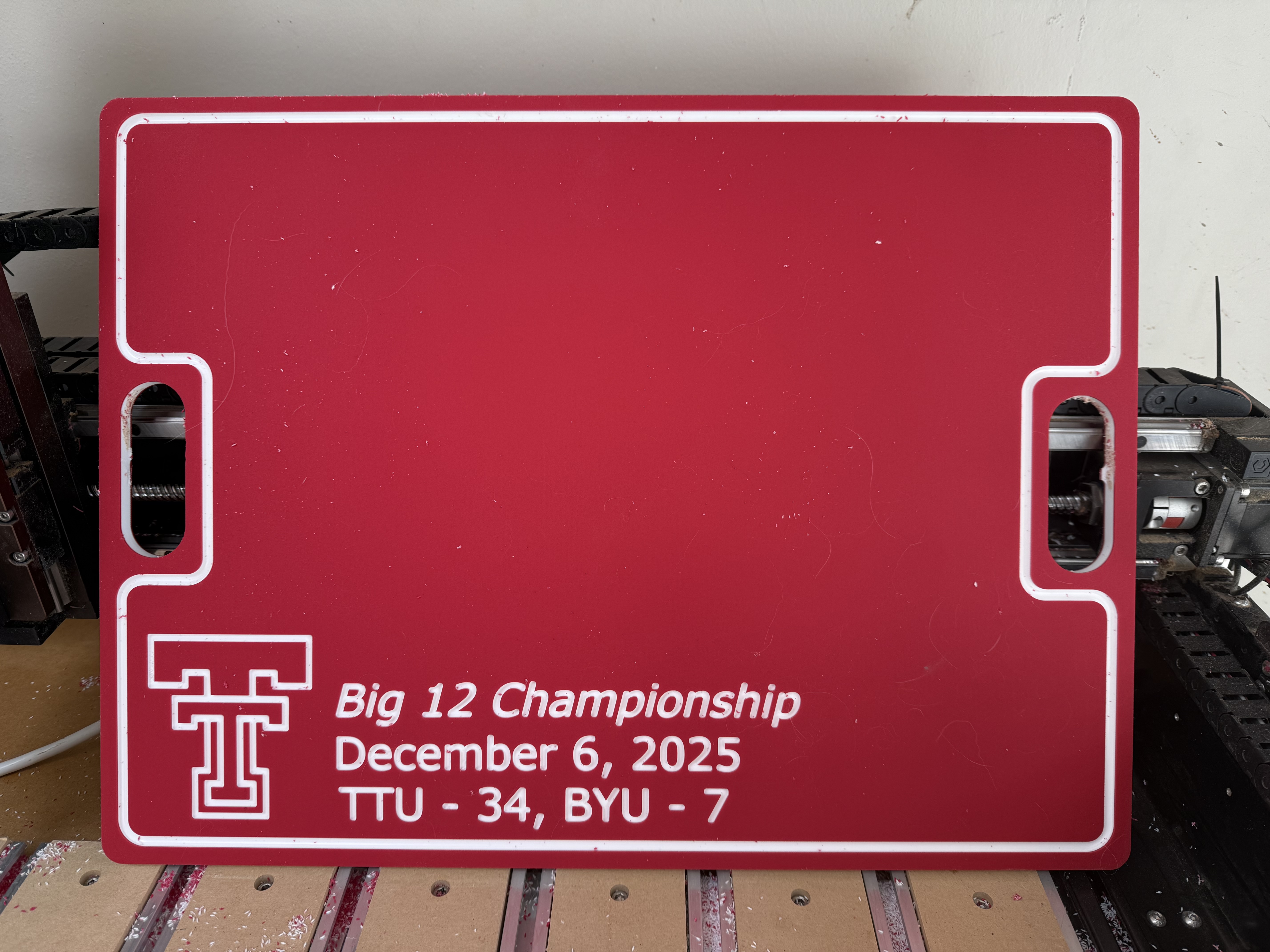 Made some HDPE serving/cutting boards to celebrate Texas Tech’s first Big 12 Championship. Material is 1/2 Color Core and board size is 18x24. Made two for gifts and would up selling a couple. Also made one at 24x36 (the largest size I get from the supplier I use) for serious tailgating.
