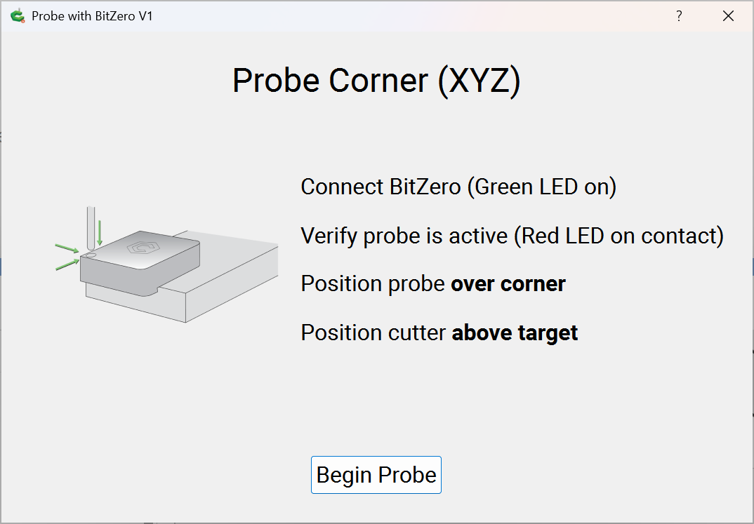 The probe signal is recognized when I touch the wire to the block. It’s functioning properly for probing Z, but, something is wrong when corner is selected. After touching to measure Z, it doesn’t move to the side of the block to measure X or Y. It just drives the bit back down into the block and doesn’t stop until the motor stalls for 2-3 seconds. Then the error comes up. I’ll try to get a video of what’s happening later today.