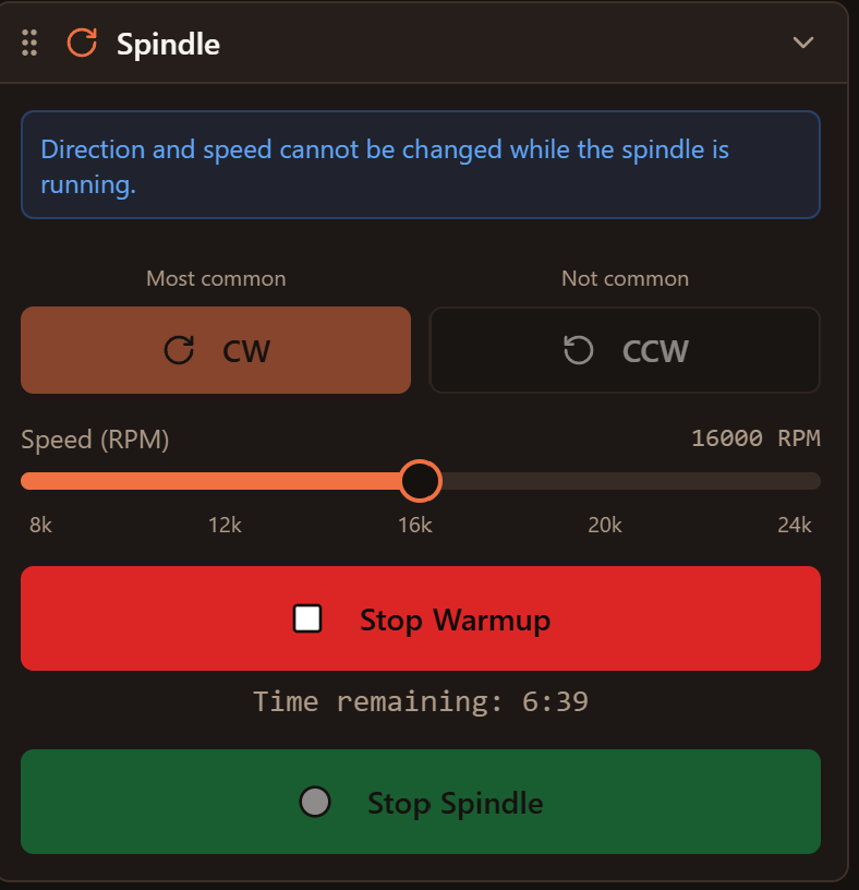 But when you go into Warmup mode, I hide the stop spindle button. To stop the spindle in warmup mode, you push “Stop Warmup”