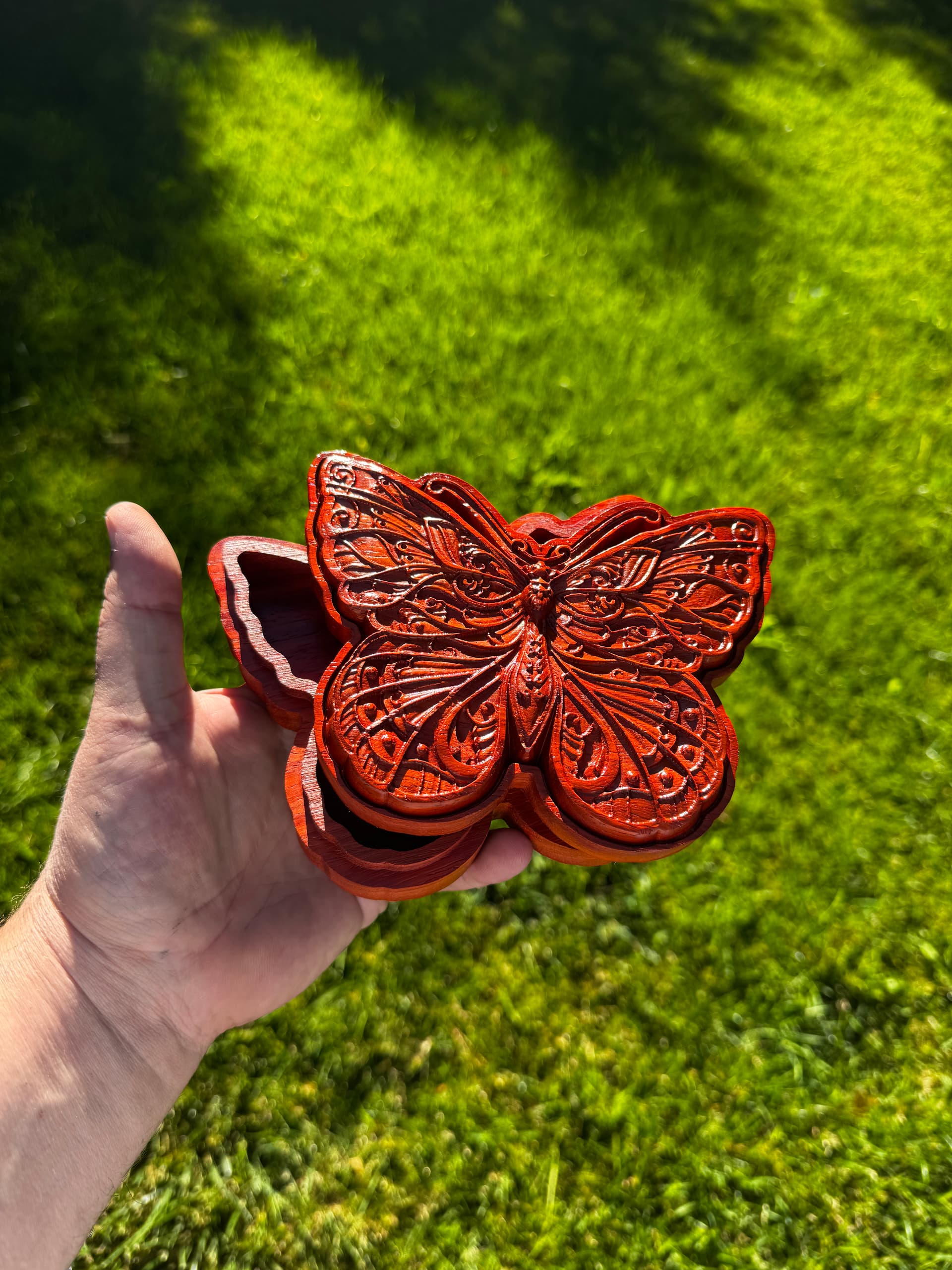 I have been practicing doing 3d model carving on the CNC. I recently purchased a ShapeOKO 5 Pro XXL and registered for the Carbide Create Pro software. I can’t believe how easy it was to get a .stl model downloaded and carved using the Carbide Create software. It takes about 45 minutes start to finish to make one of these butterfly boxes. I have made several of them now that I have the file created with the kinks worked out. I had practiced 3 times until I finally got a design file created that could be repeated without flaws. Everyone I have gifted them to absolutely loves this finished box. I use Mohawk spray lacquer to finish them because it only takes about 15-20 minutes to dry. I start with a 6.5" X 6.5" blank.
