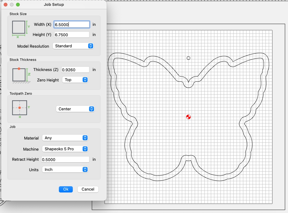- Make the Toolpath Zero Center. Work with the outline of the image (stl) that you imported. In this case it was a butterfly stl file.