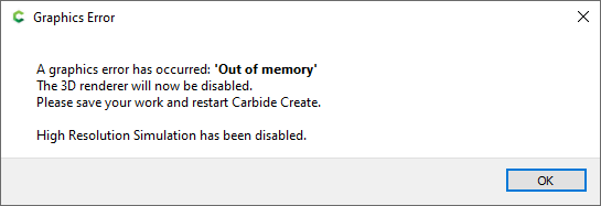 That popup is due to the GPU not being able to allocate enough memory to show the 3D mesh that’s been calculated, both simulation and CC Pro heightmaps. In the last release we managed to track down where it happened and issue that popup. Catching the error and then reducing resolution eliminated all of the crashes due to the GPU that we were able to replicate. Before this change, the GPU running out of memory caused a hard crash.
