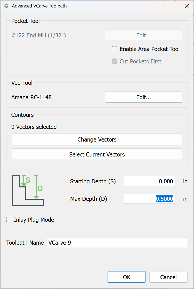 The tool at it’s deepest point is in the center of the star, and the cutting edge of the tool is touching all the inside points on the star. At this point, it needs to be 0.262" deep. The vector will prevent it from going any deeper, so you can set the max depth to anything larger than 0.262"