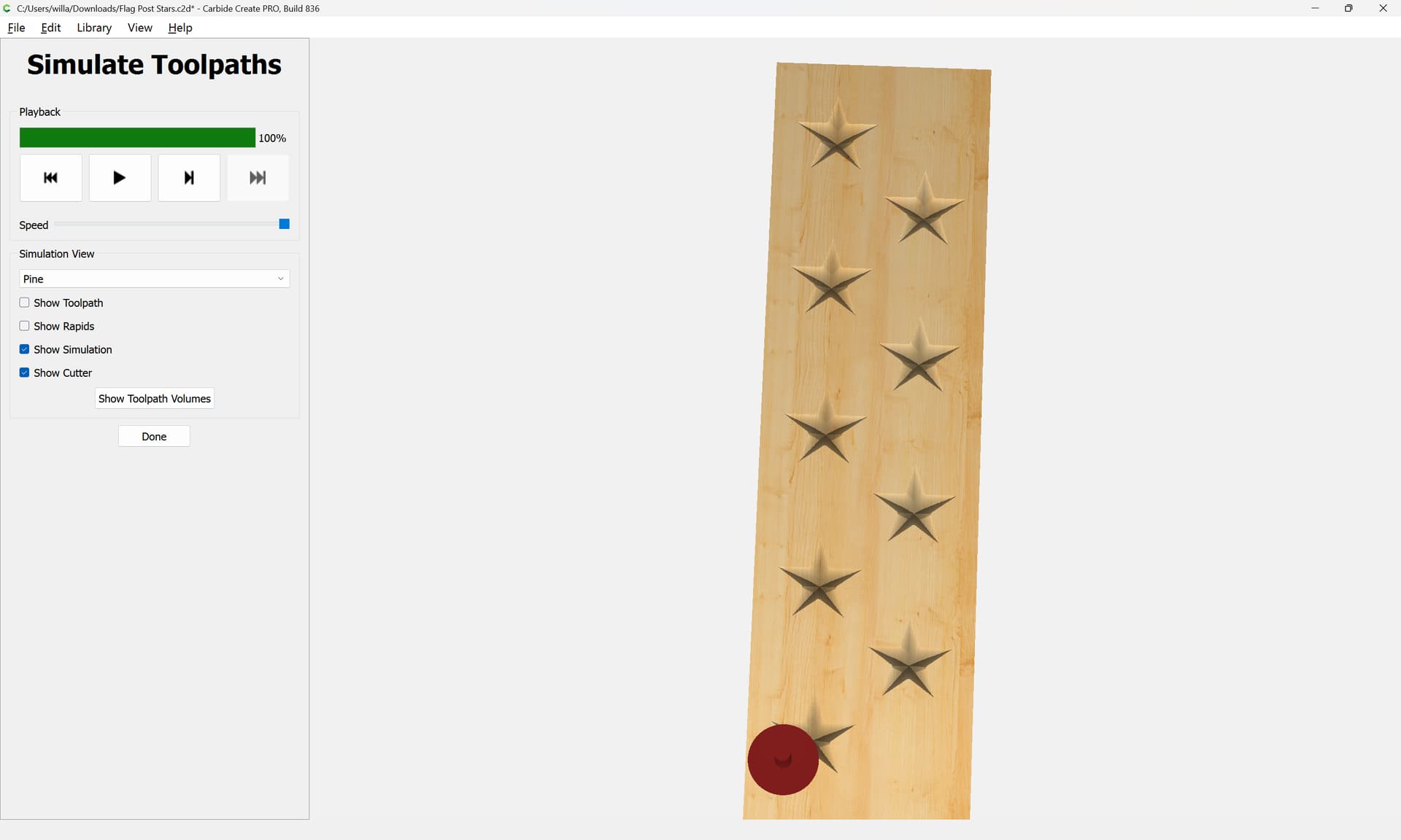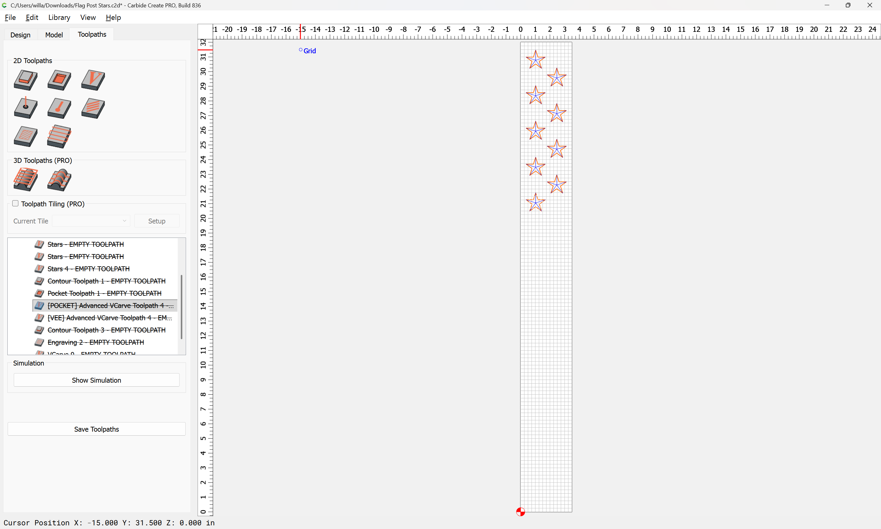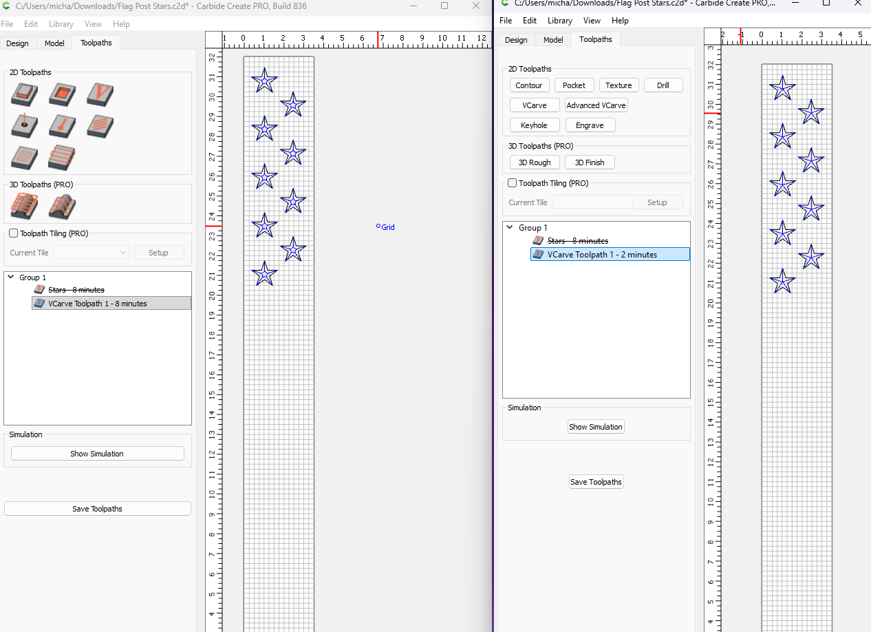 The tool path for making basic stars is NOT the same which is understandable as the new V8 seems to be more precise with what you may choose. The issue is I used a Vee 90 or 60 in the past and VCarved the stars to depth. It was a very simple process and looked good. Now the new version always leaves a CENTER area as the Vee cut not does not make a GRADUAL Cut to the center but just goes to depth and cuts.