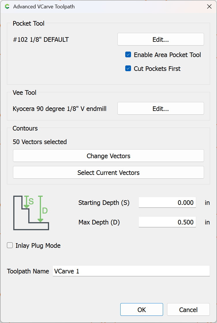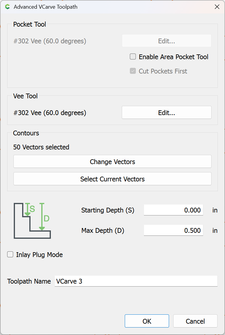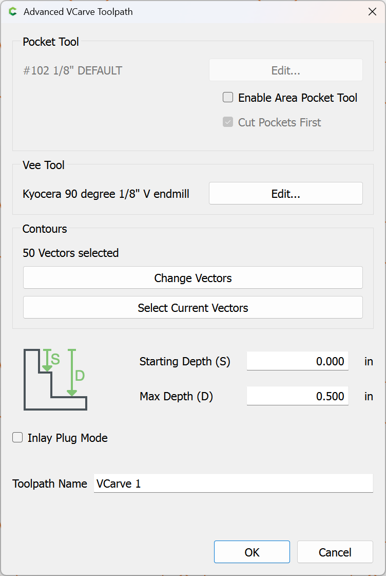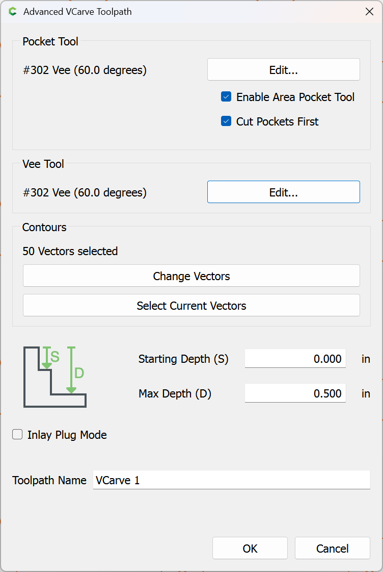 Edit the associated tool, selecting the same V tool which will be used for V carving: