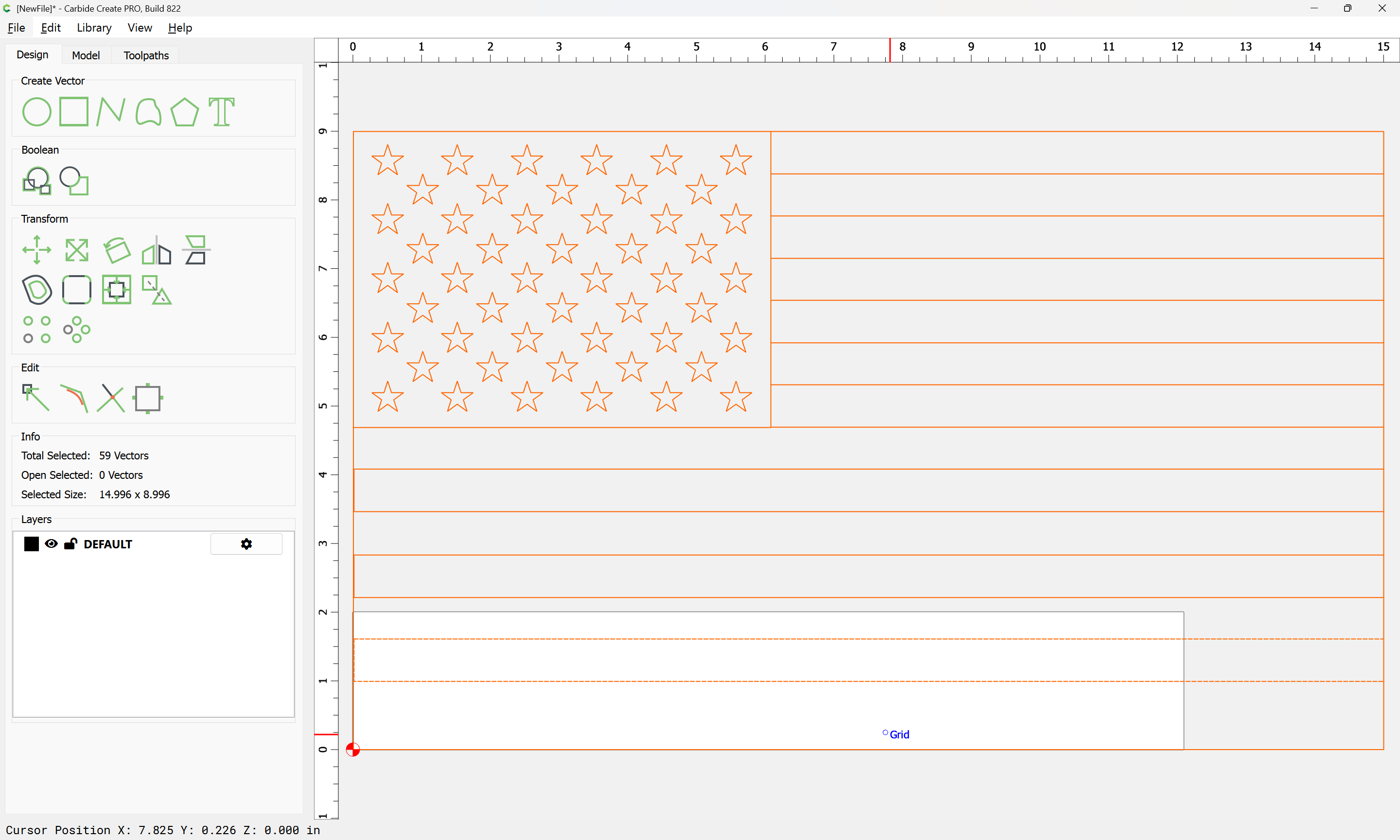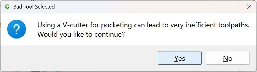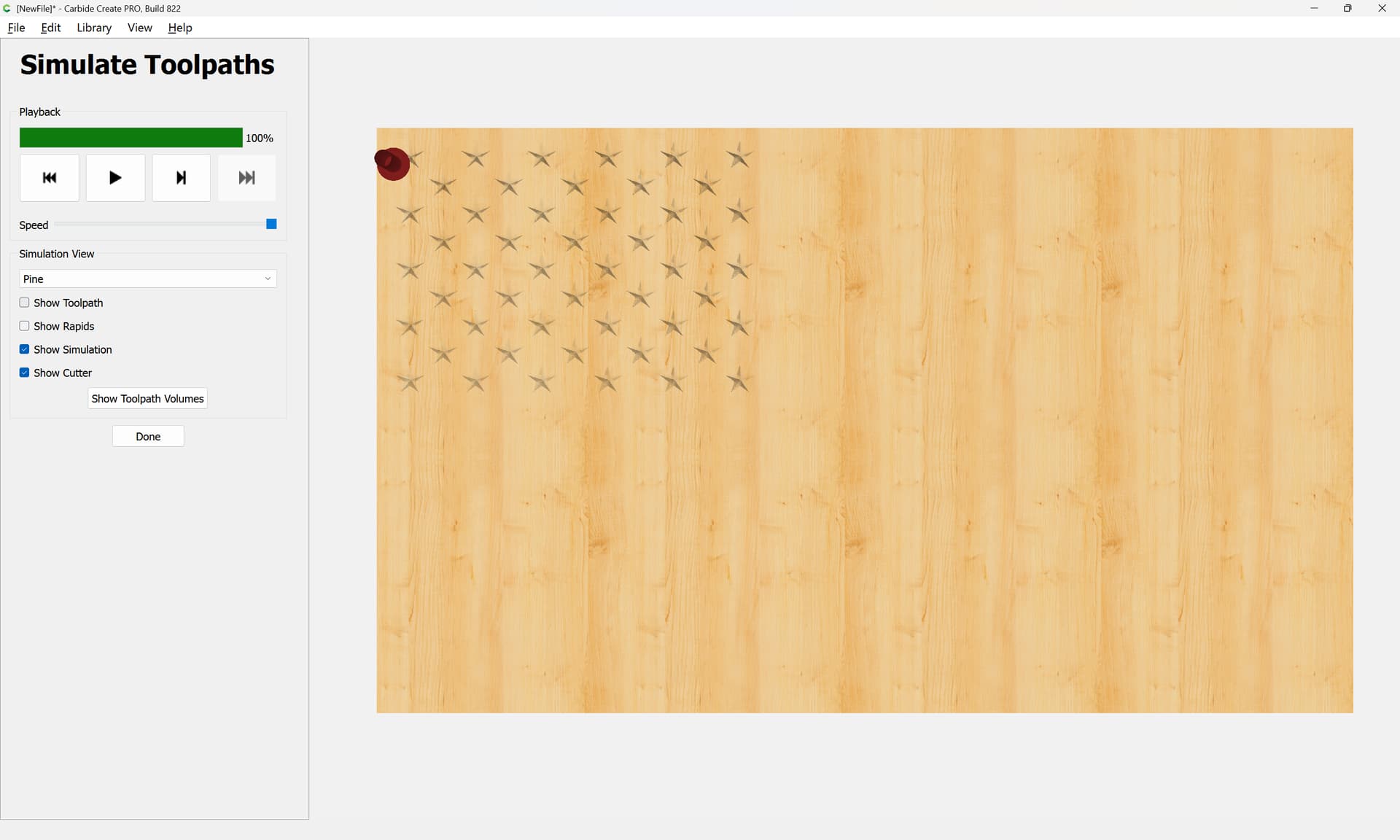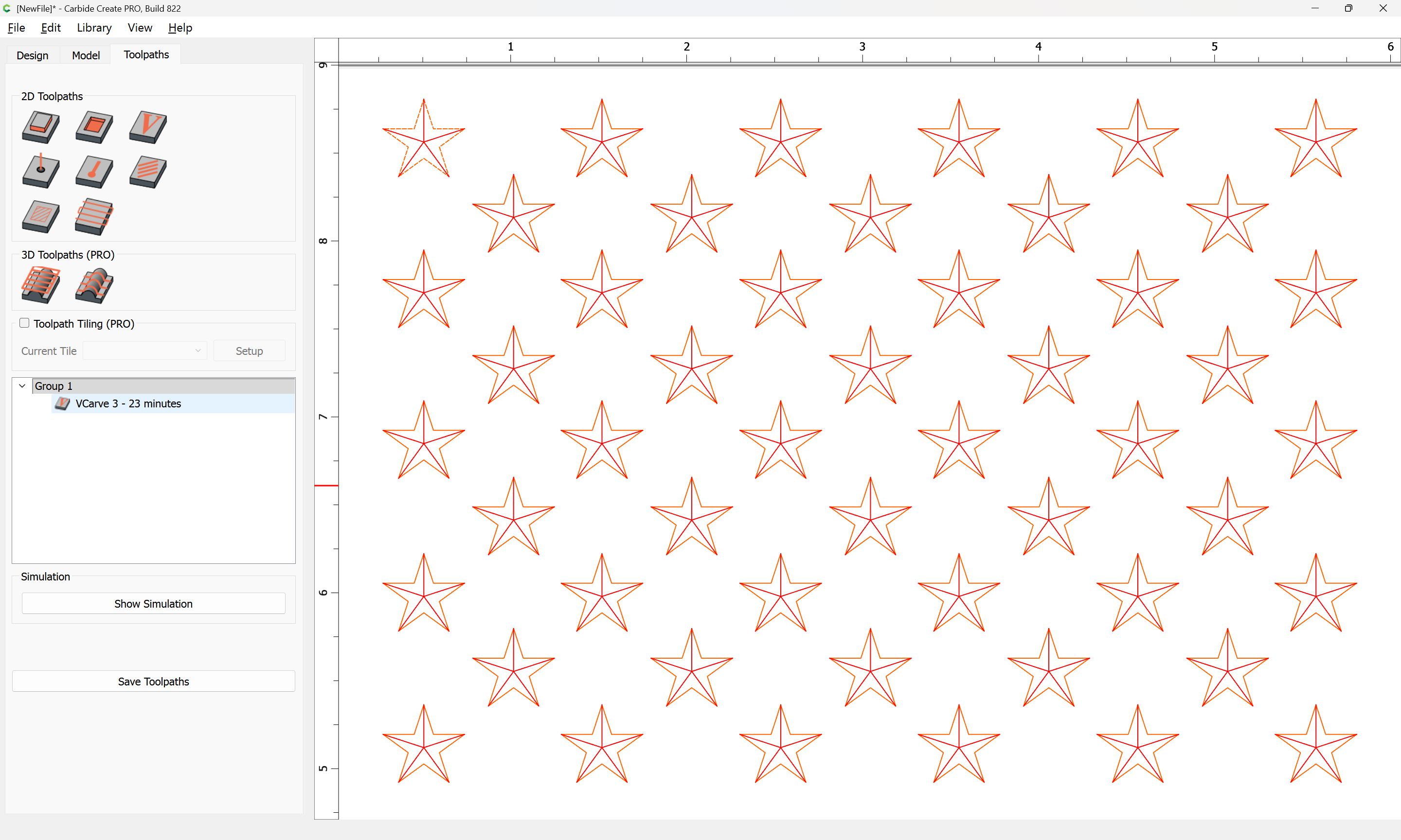 In 815: Load US flag from library, stock set to .5" thick, create vcarve, it works as expected. In 822 same process results in Empty Toolpath even after waiting a full minute and hovering over the toolpath repeatedly. Also, when hovering, it says the tool is a 1/8 in both versions even though the pocket tool is not enabled.