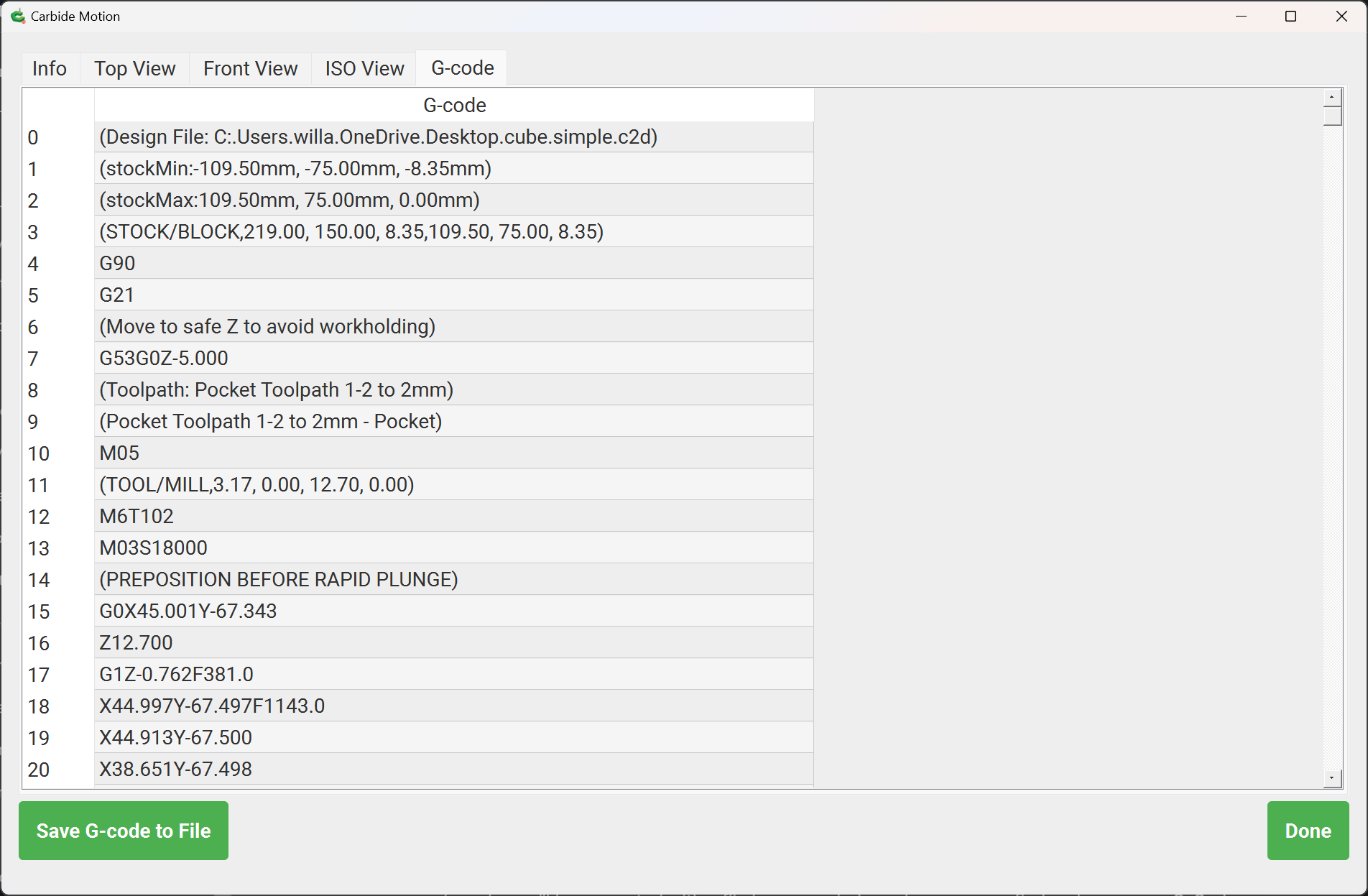 Thanks Will, I use Carbide Create Build 815 to create my content and in the case of today call it up in Motion. Is there a “window” or drop down in either of the 2 softwares where I could edit the g-code? If its really easy I’d be open to learning but all the same I can re-load Motion Build 622 just the same. tnx.