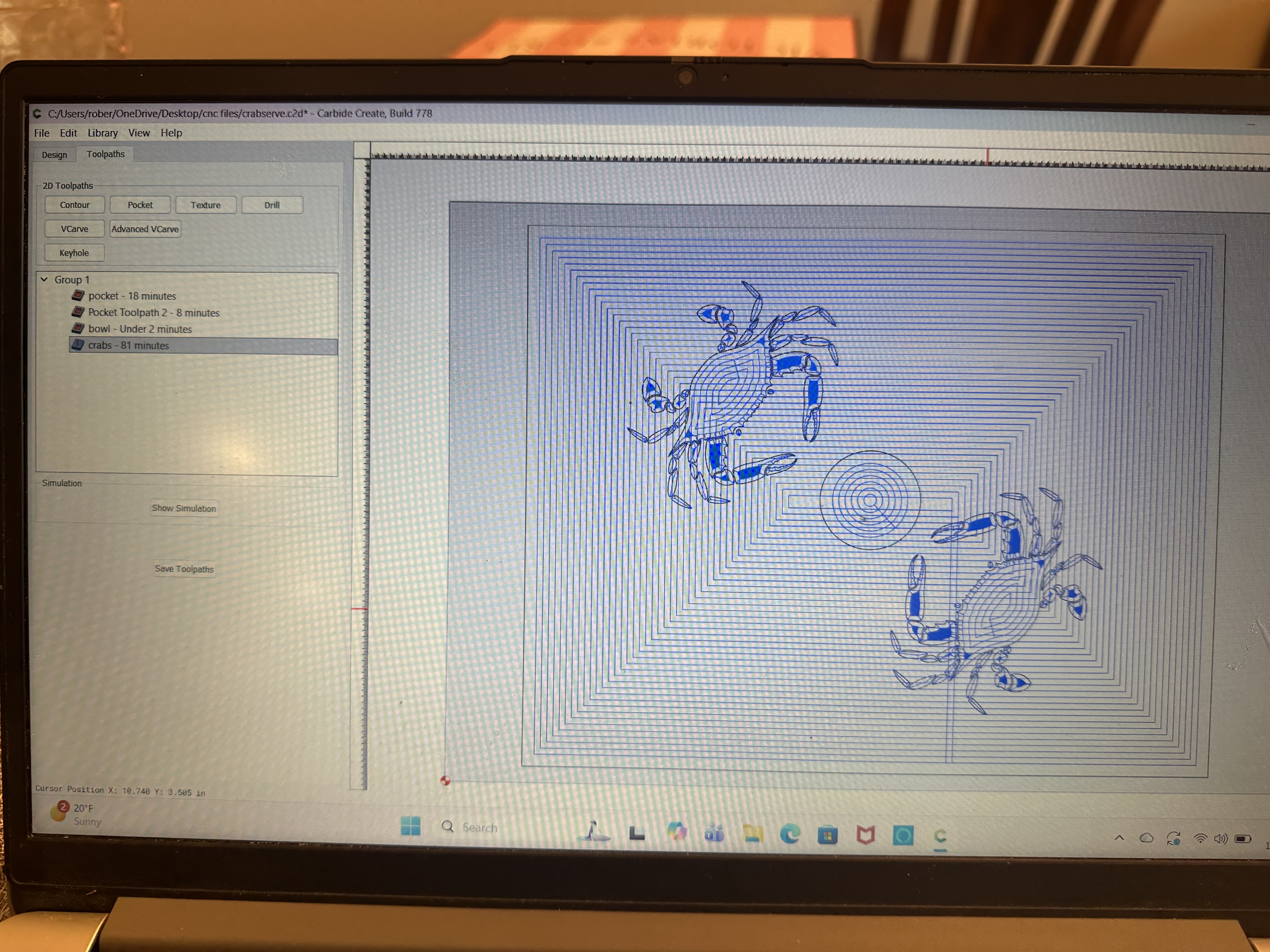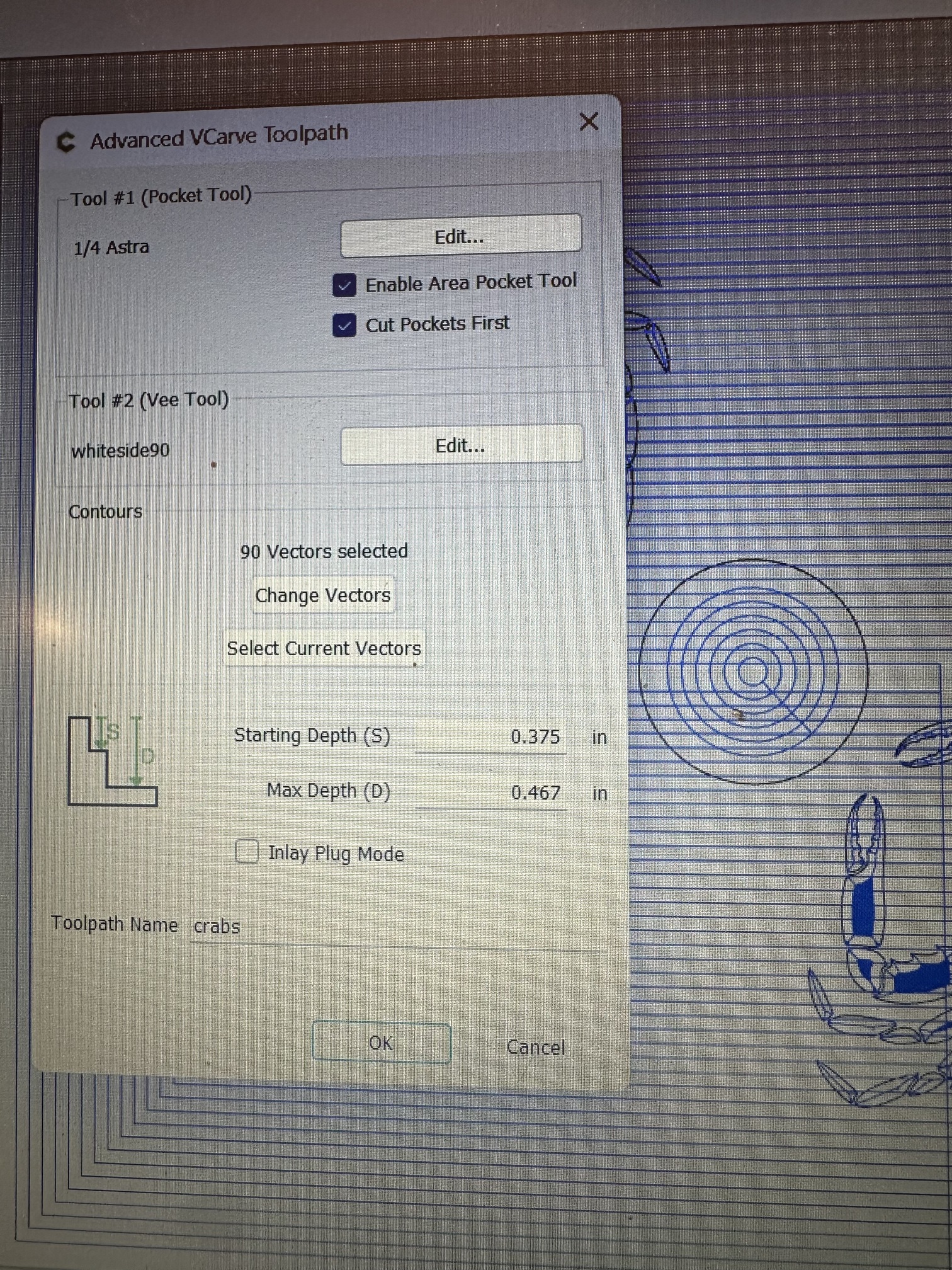 1.3 inch thick board w/a .375 deep pocket. Carving 2 crabs and a small circle with a starting depth of .375 down to .467. The small circle is not a problem. The crabs however are showing an 81 minute carve time, these take 8 minutes each in any other advanced Vcarve operation. When you do the quick math it’s as though carbide create is regenerating the crab carve from a starting depth of zero to a final depth of .467 instead of a .375 starting depth down to .467. Finally if I input a starting point of zero down to .094 each grab takes 8 minutes. Picks included to see if I’m missing something
