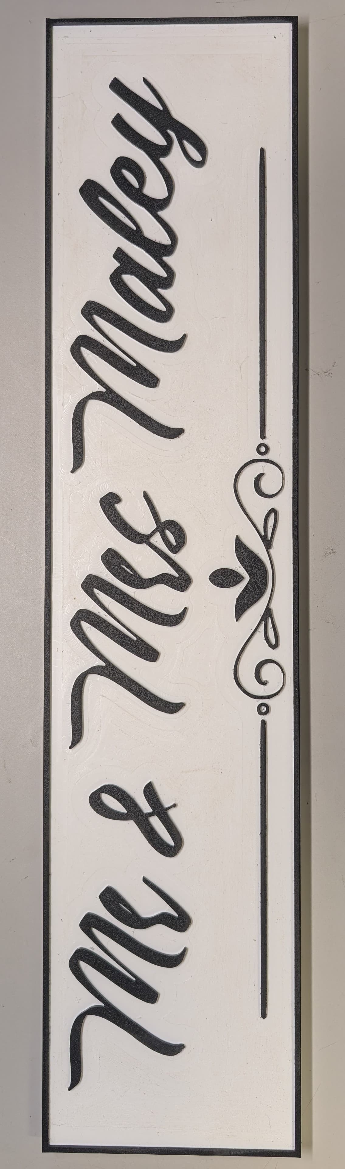 I recently did a sign for a coworker’s daughter that is getting married. I have a shapeoko 5 4x4, it is trammed, the spill board has been surfaced and I was using O flute bits at the recommended feeds and speeds when selecting the tools. The depth was set to 0.08 in. The material has held down by 2 sided tape. The finished size of the piece was 5.25"x23.25".