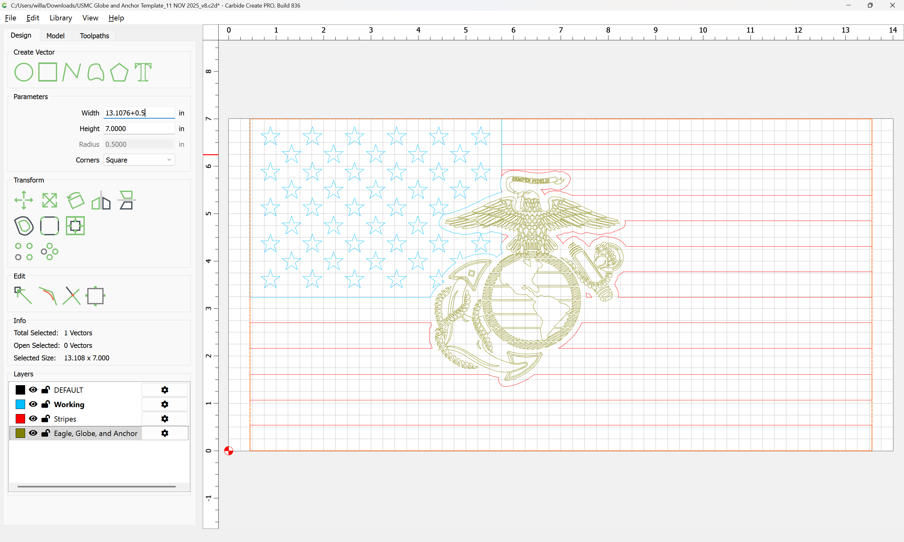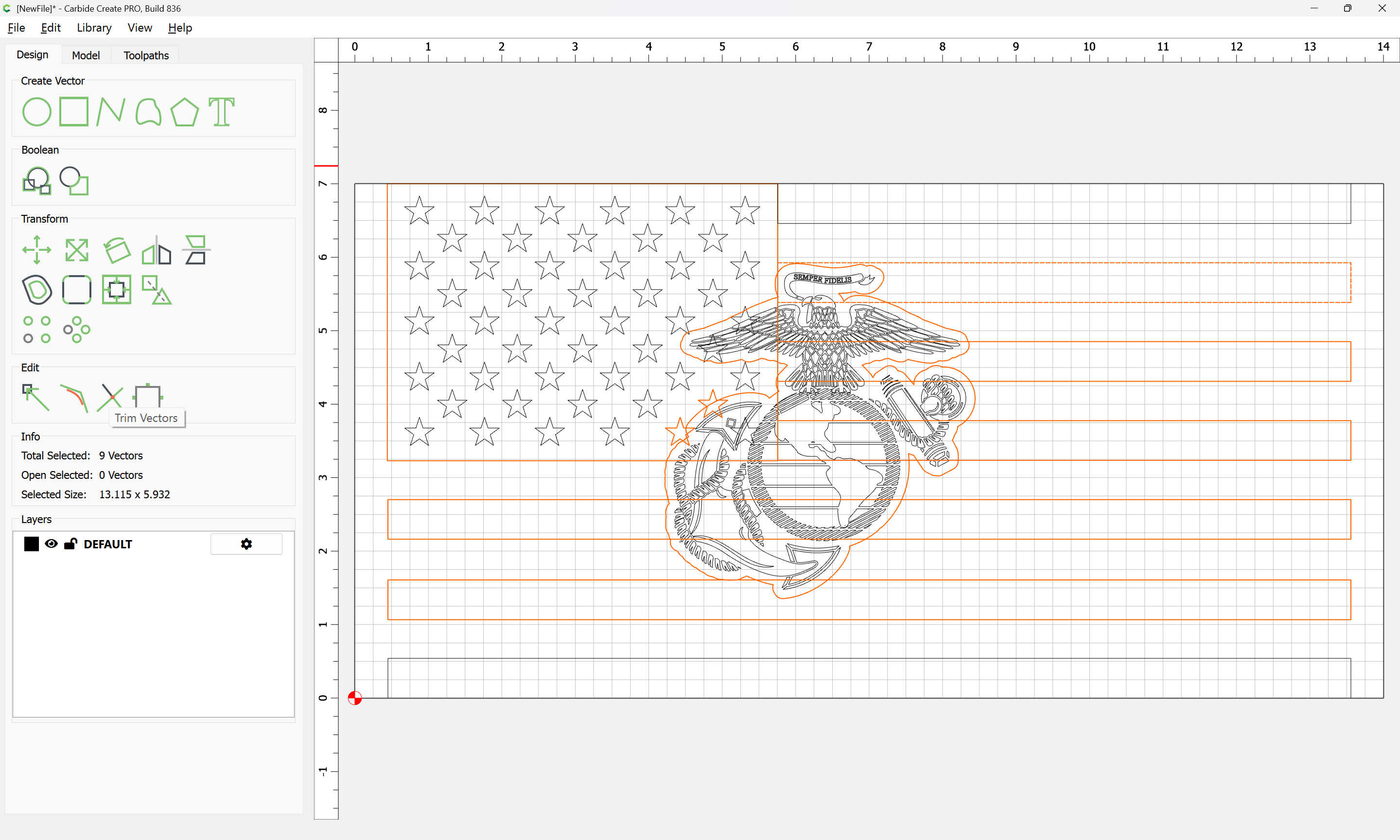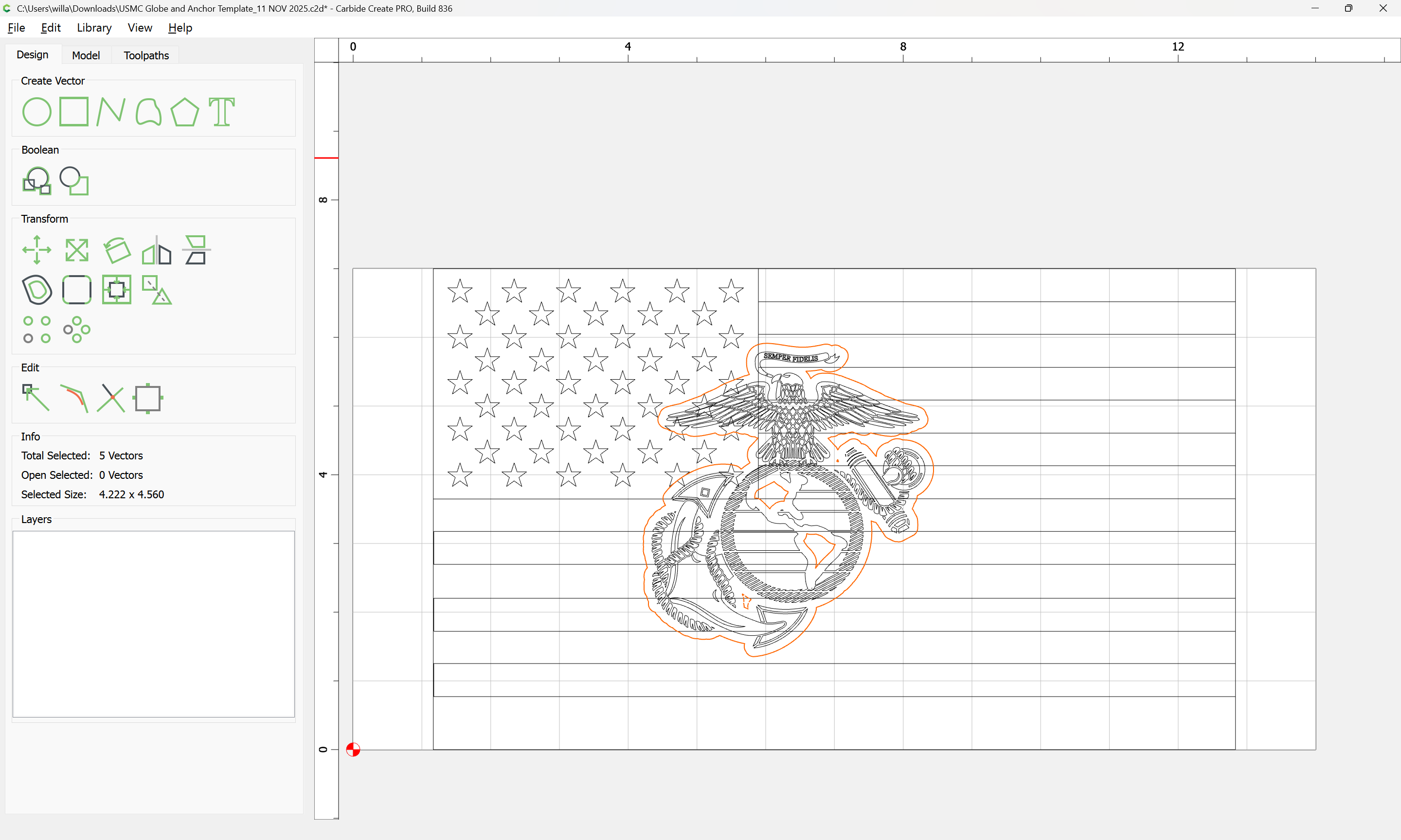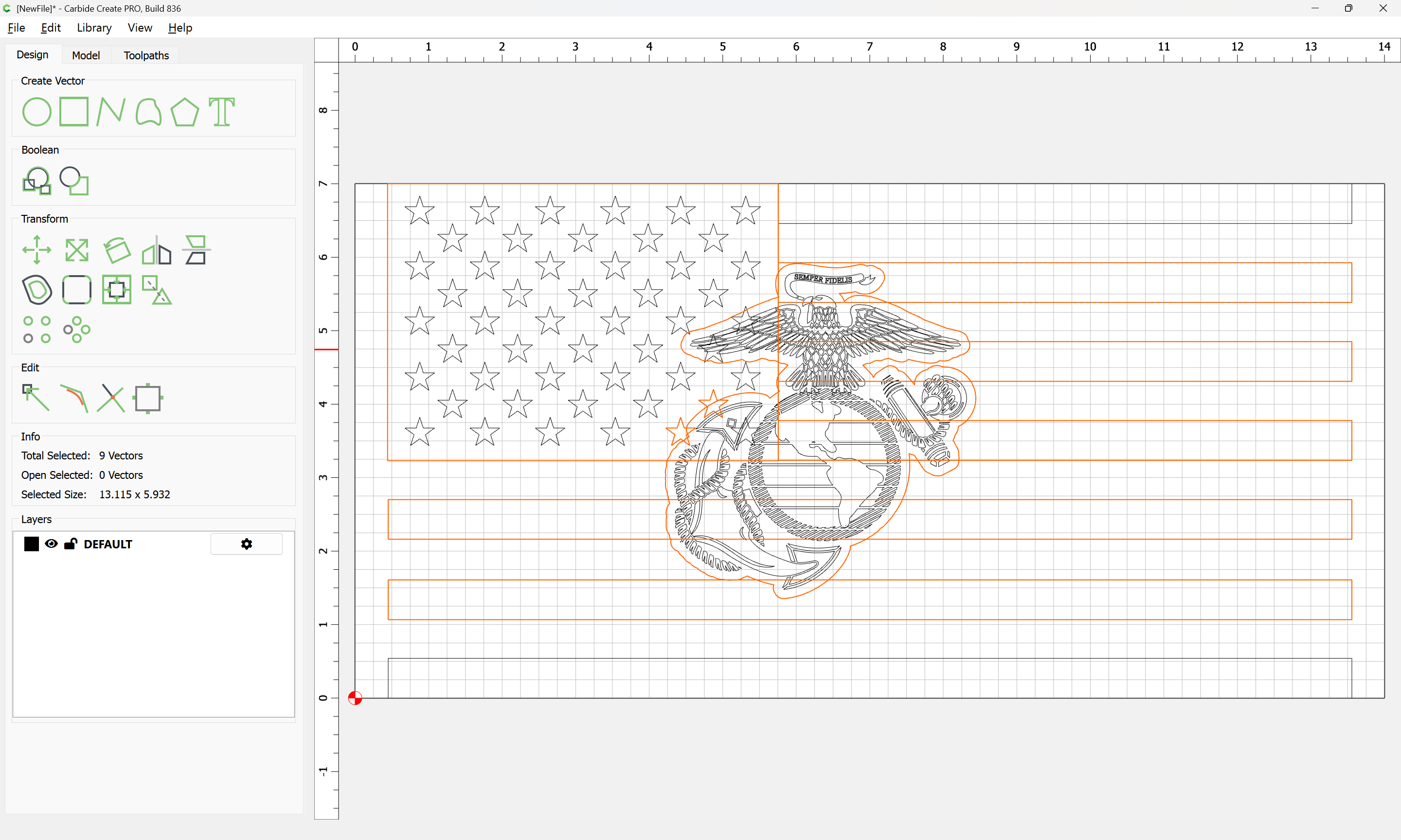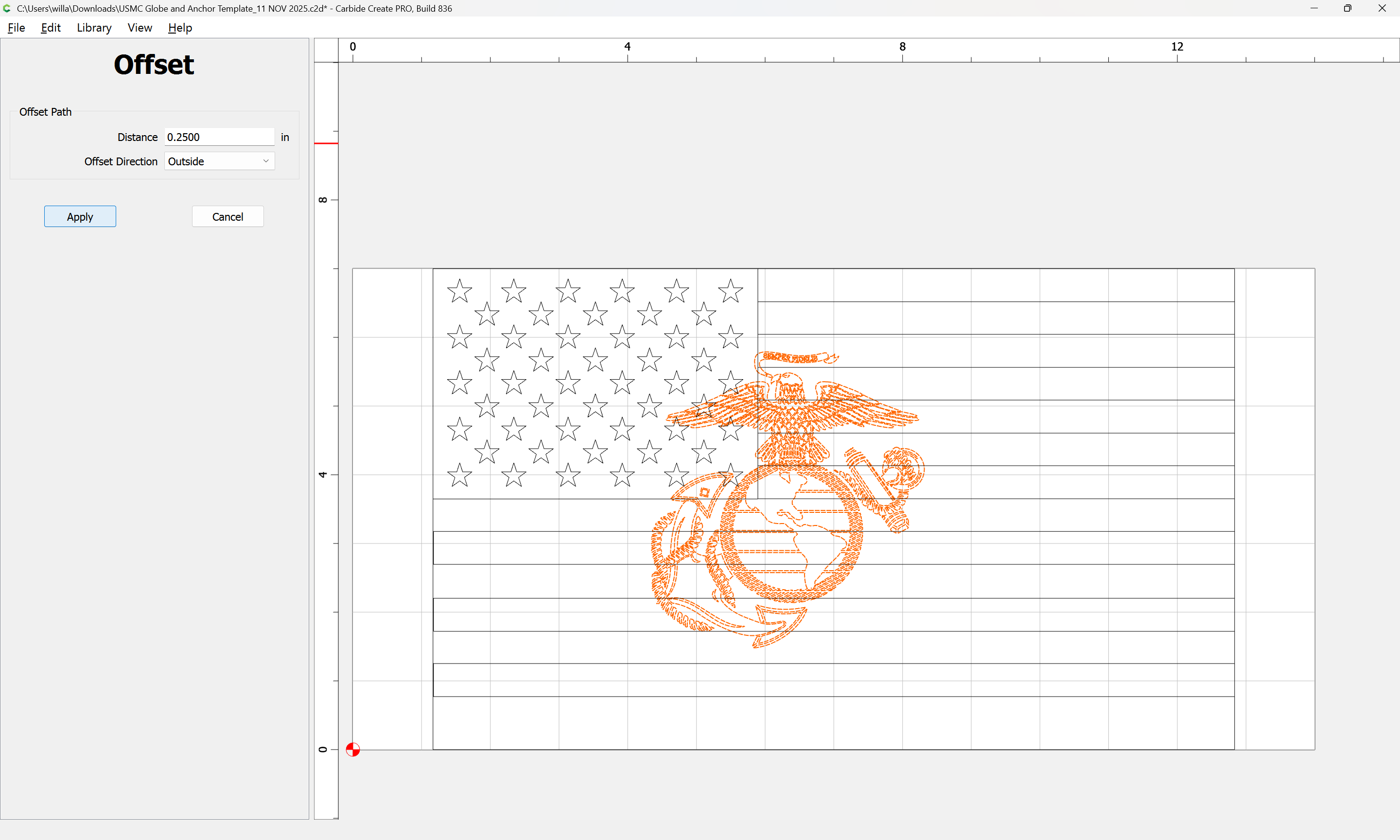 I’m trying to add the USMC Globe and Anchor to the US flag tray. The art work I have doesn’t have a border around it and I want the stripes in the flag to start and stop as shown in the Carbide Create Boolean video. I understand the process of the Boolean, but I’m having big issues with creating a border around the globe and anchor.