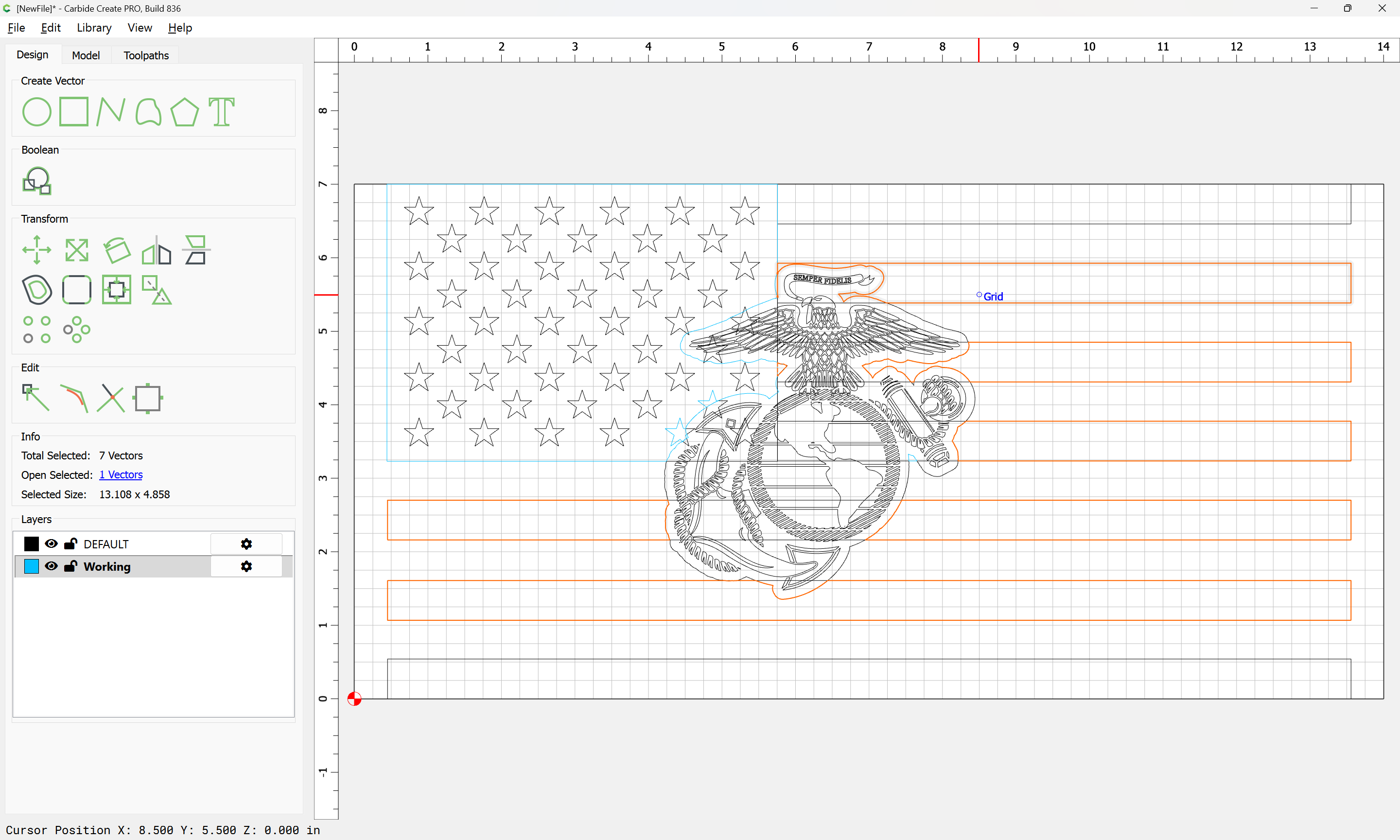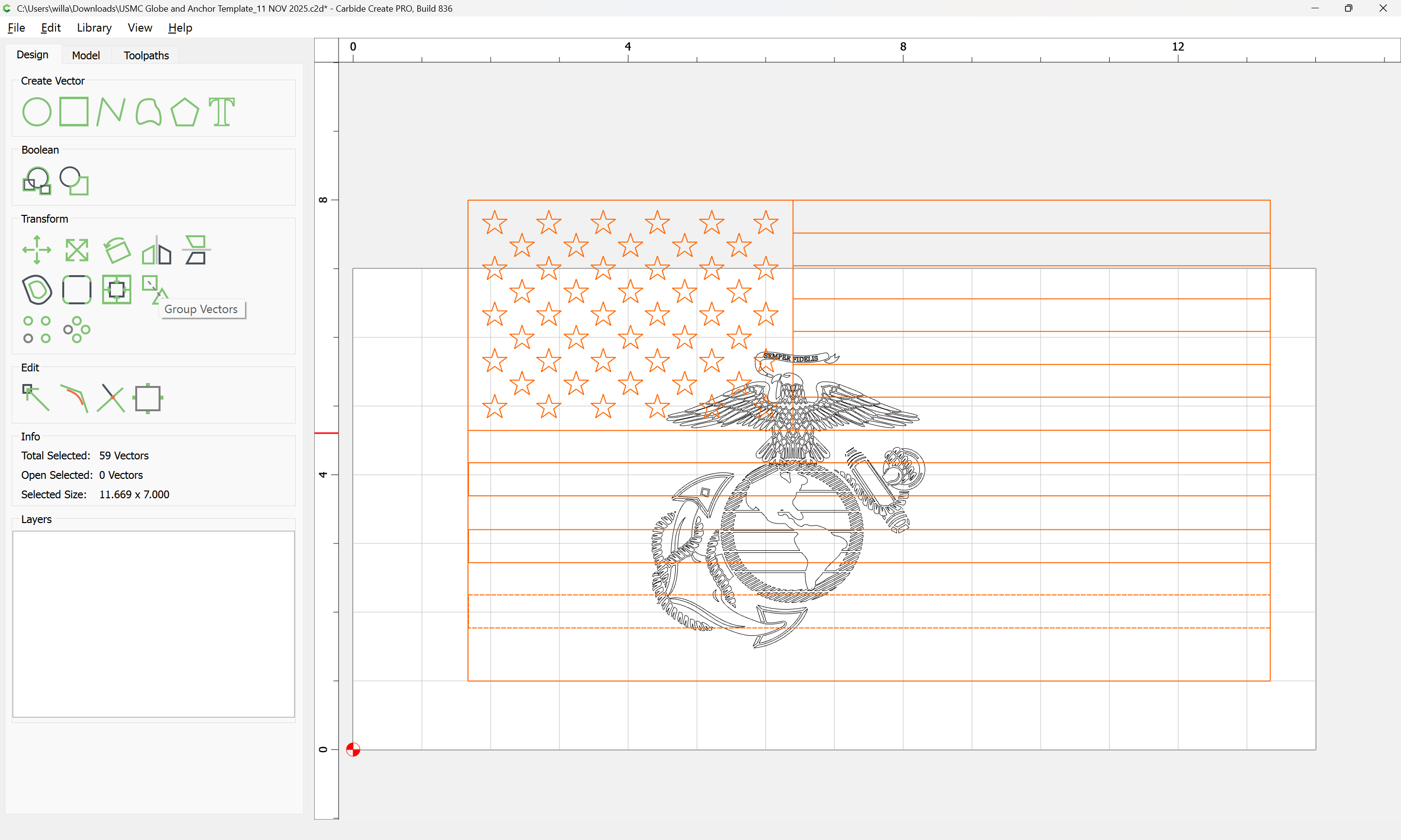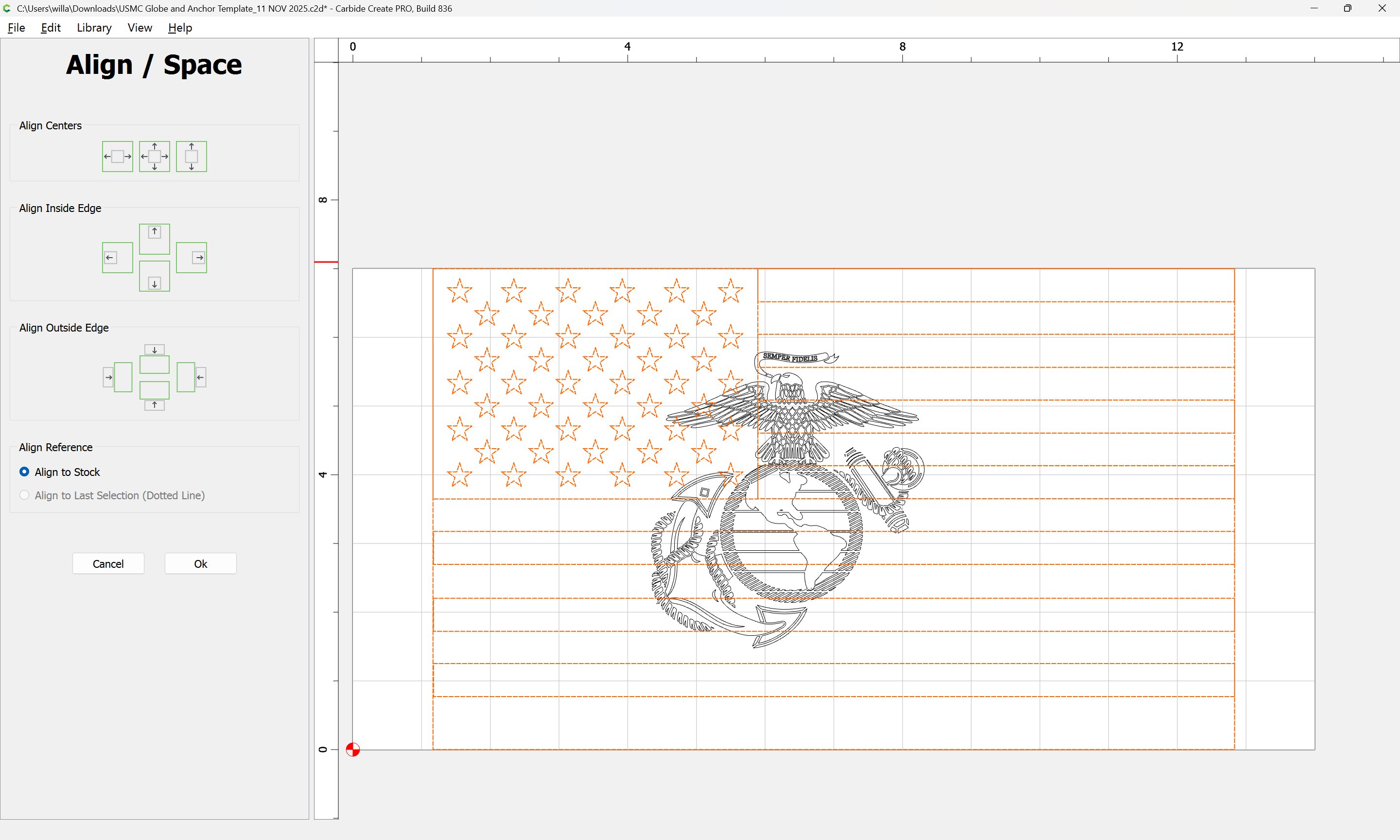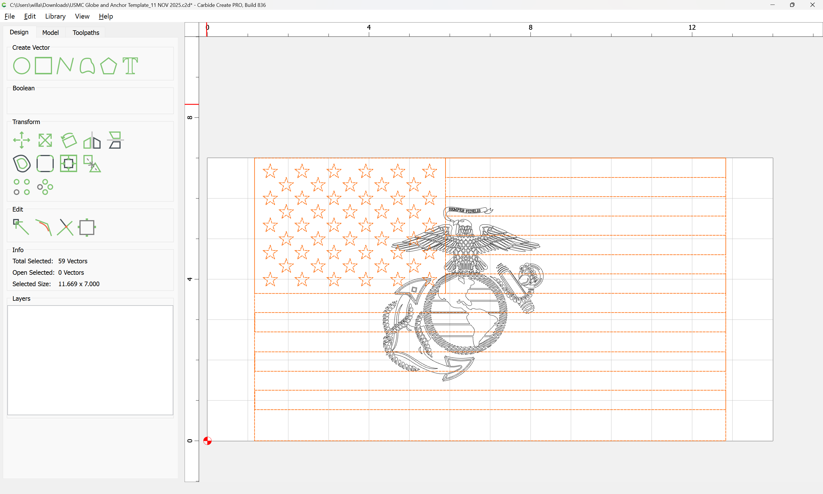 I’m trying to add the USMC Globe and Anchor to the US flag tray. The art work I have doesn’t have a border around it and I want the stripes in the flag to start and stop as shown in the Carbide Create Boolean video. I understand the process of the Boolean, but I’m having big issues with creating a border around the globe and anchor.