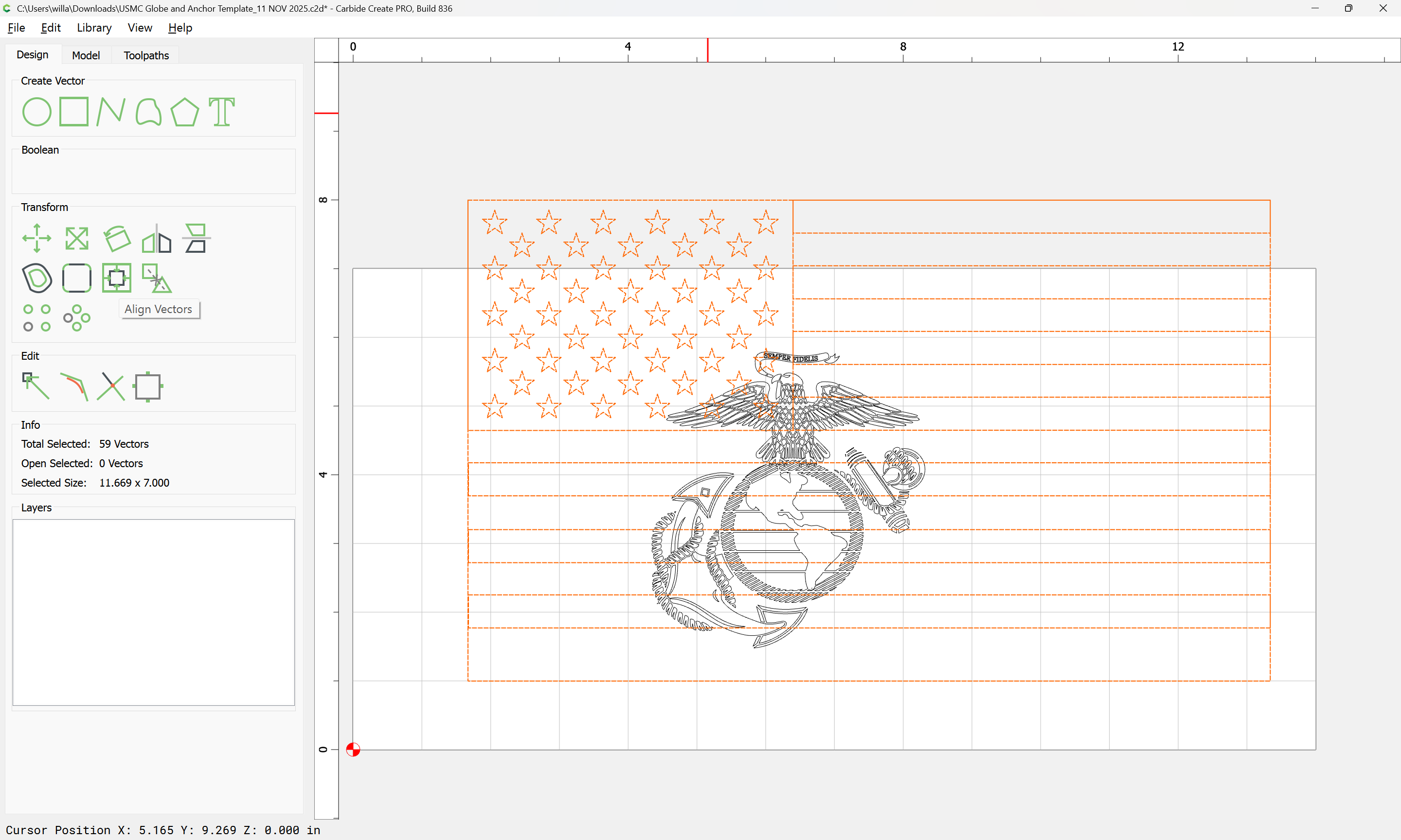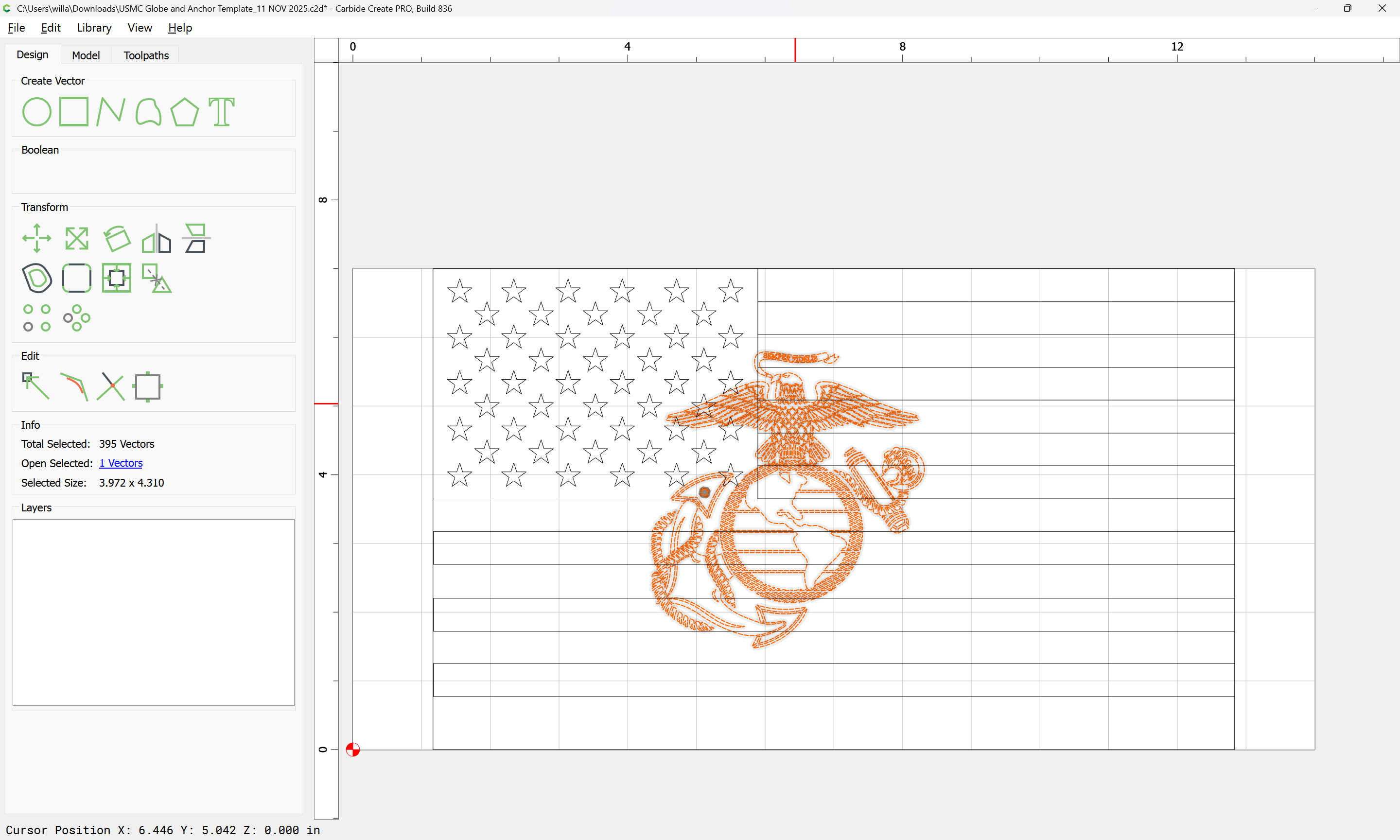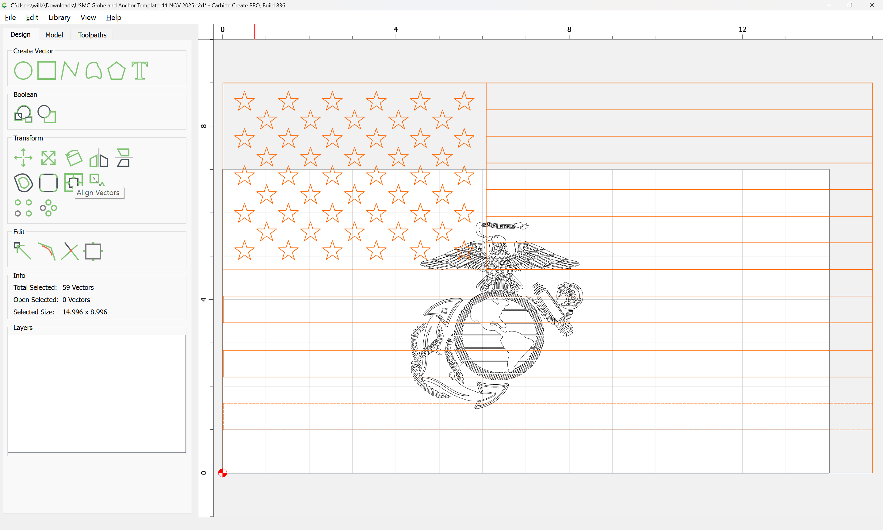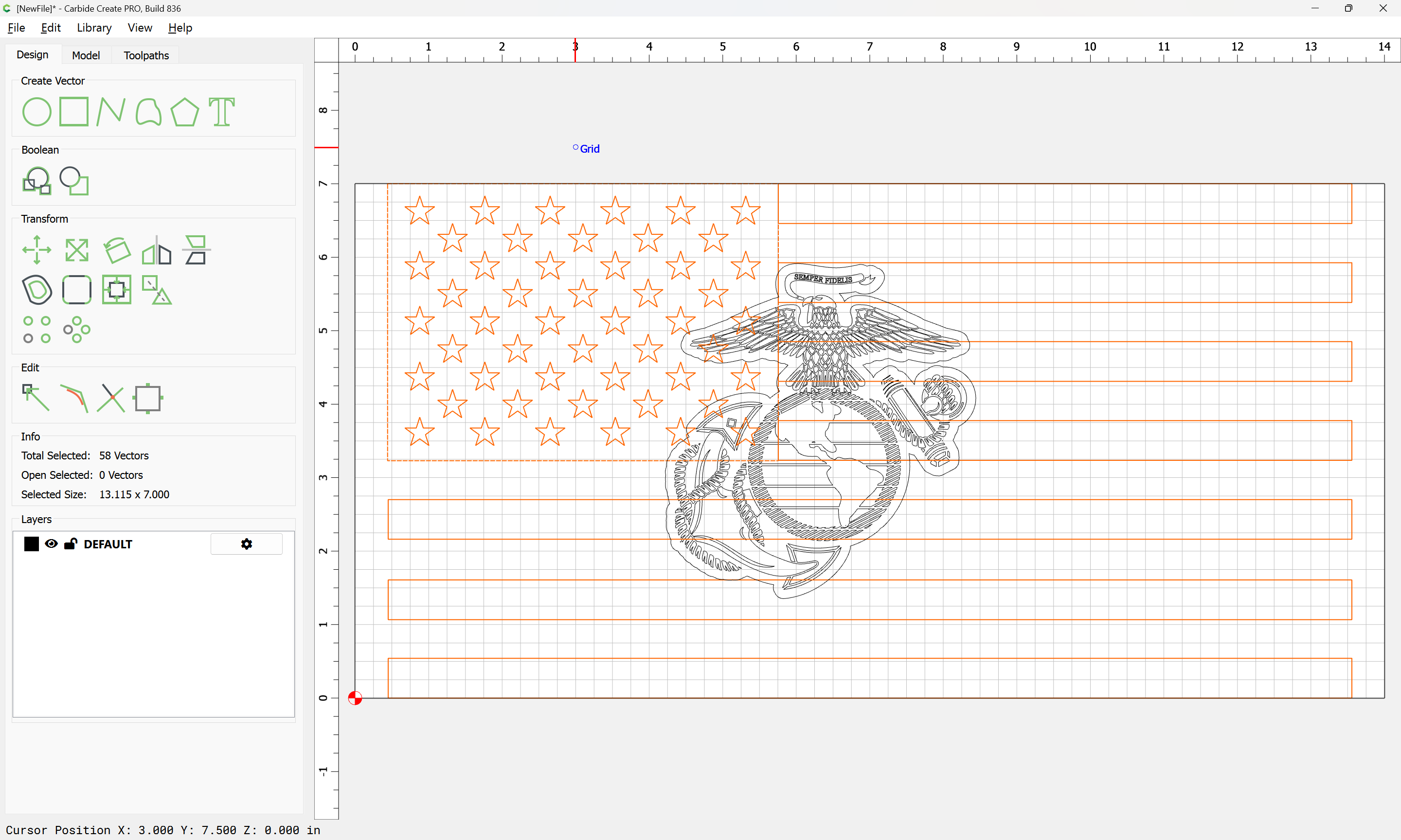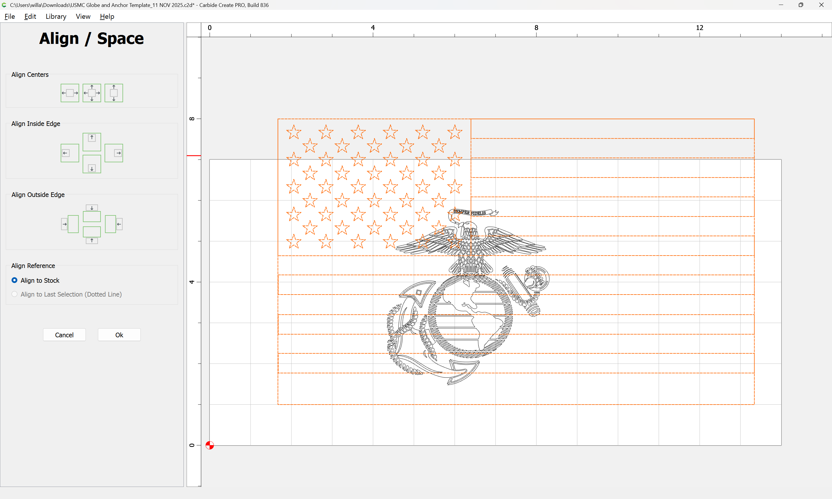 I’m trying to add the USMC Globe and Anchor to the US flag tray. The art work I have doesn’t have a border around it and I want the stripes in the flag to start and stop as shown in the Carbide Create Boolean video. I understand the process of the Boolean, but I’m having big issues with creating a border around the globe and anchor.