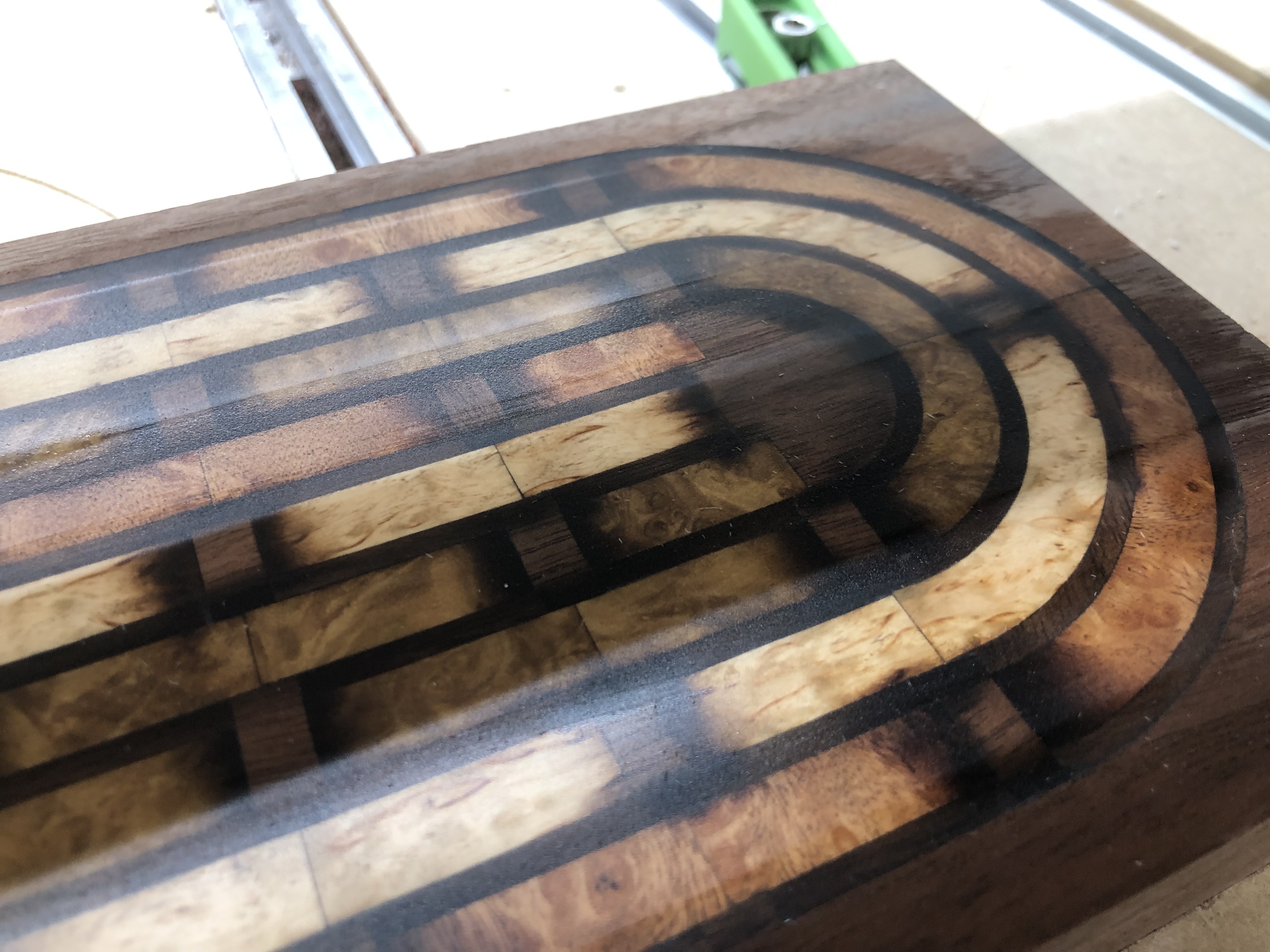 I started the weave patterned cribbage board this weekend. Needless to say, this is definitely a pain in the behind. There’s around 200ish individual pieces that I’m sand shading.