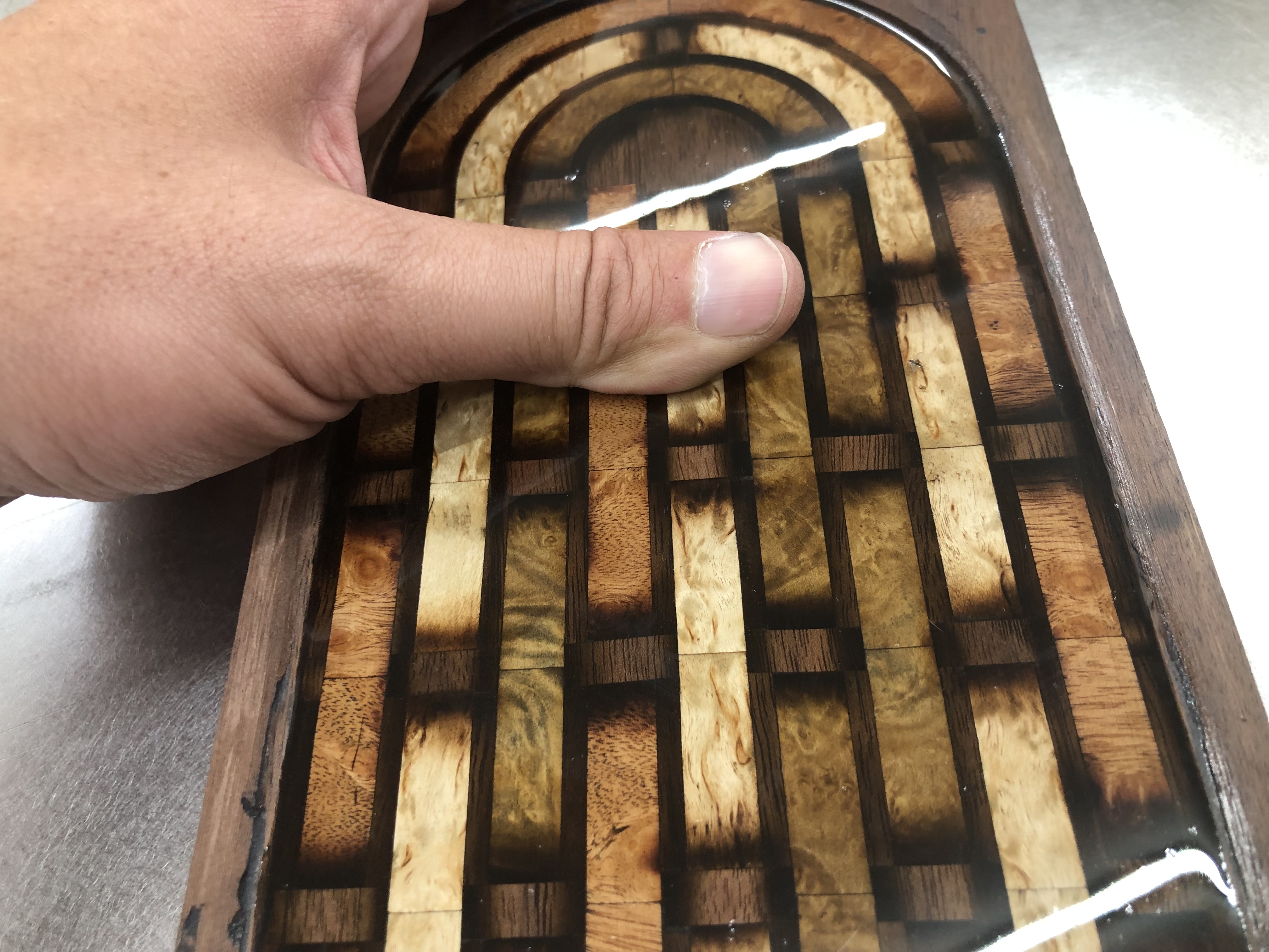 Early design work, but essentially this will be a 3D weave pattern, made out of veneer inlays with black epoxy. I’m going to sand shade the veneer so it will blend into the epoxy and give the effect of going under and over the walnut base. For reference, those bigger black lines in the middle are a 1/8th thick.