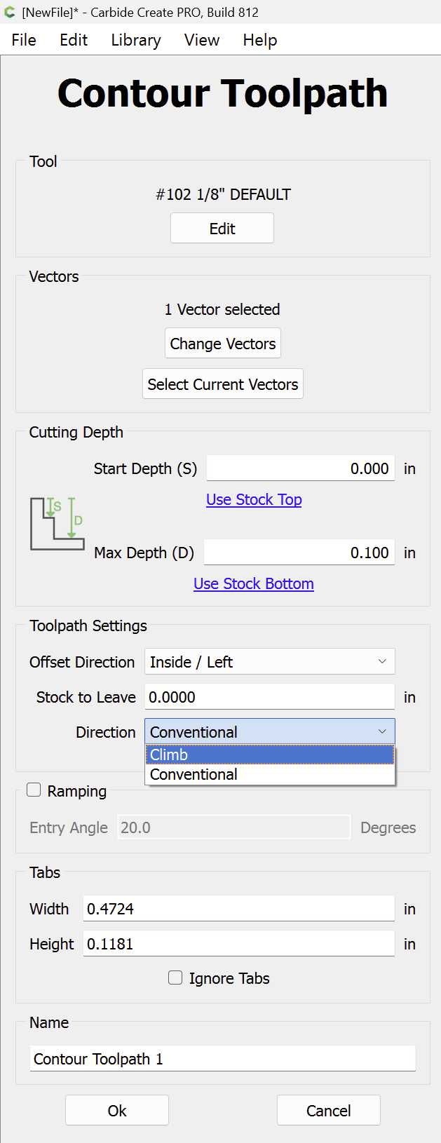 Climb/Conventional is not available with No Offset. It could be, and the default conventional could cut the curve start to end, and changing it to climb would cut end to start. (?)