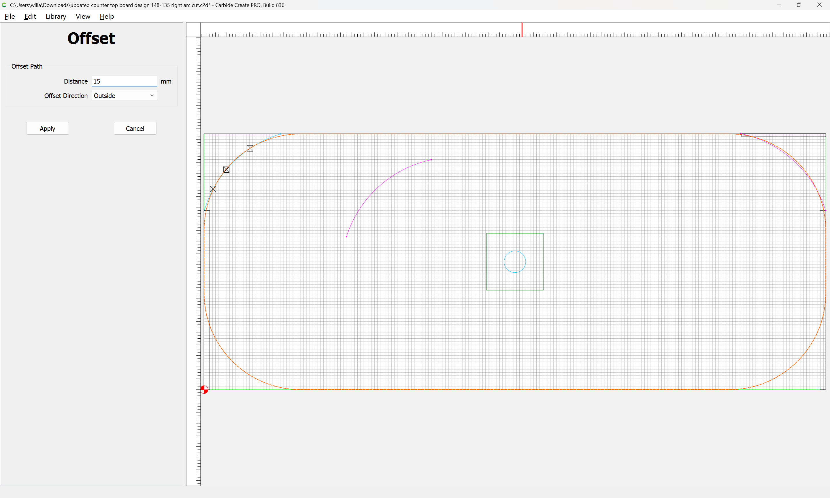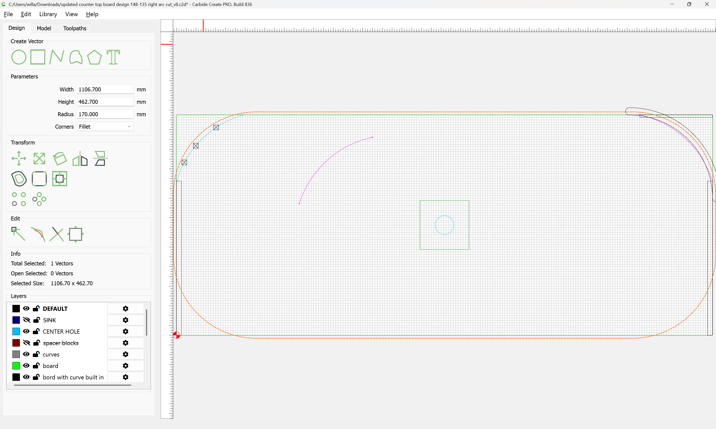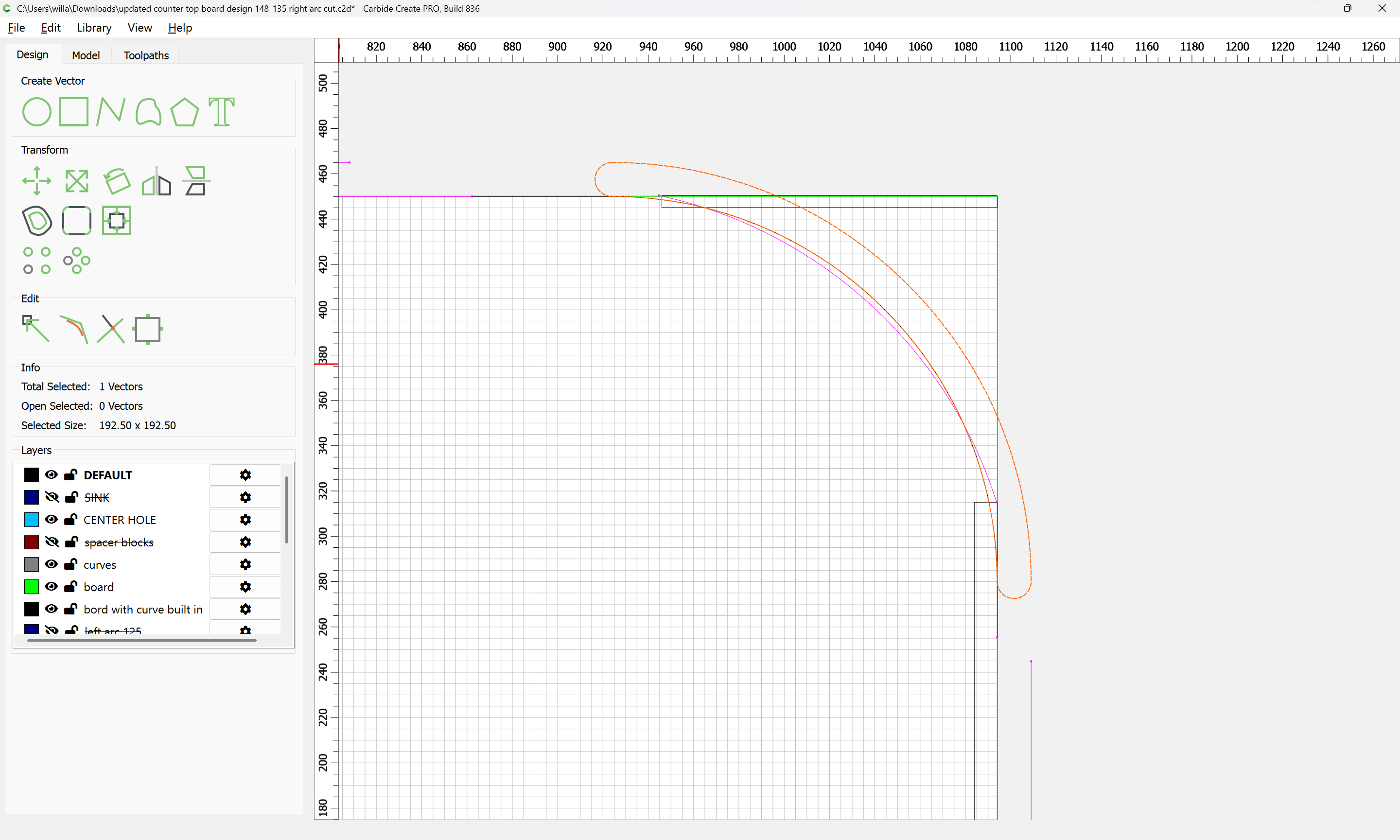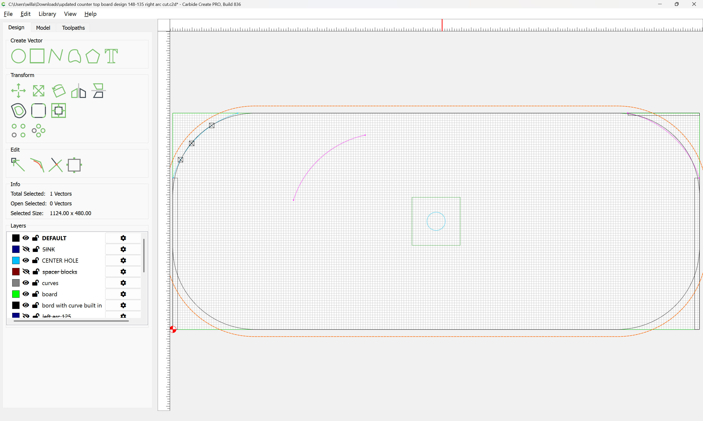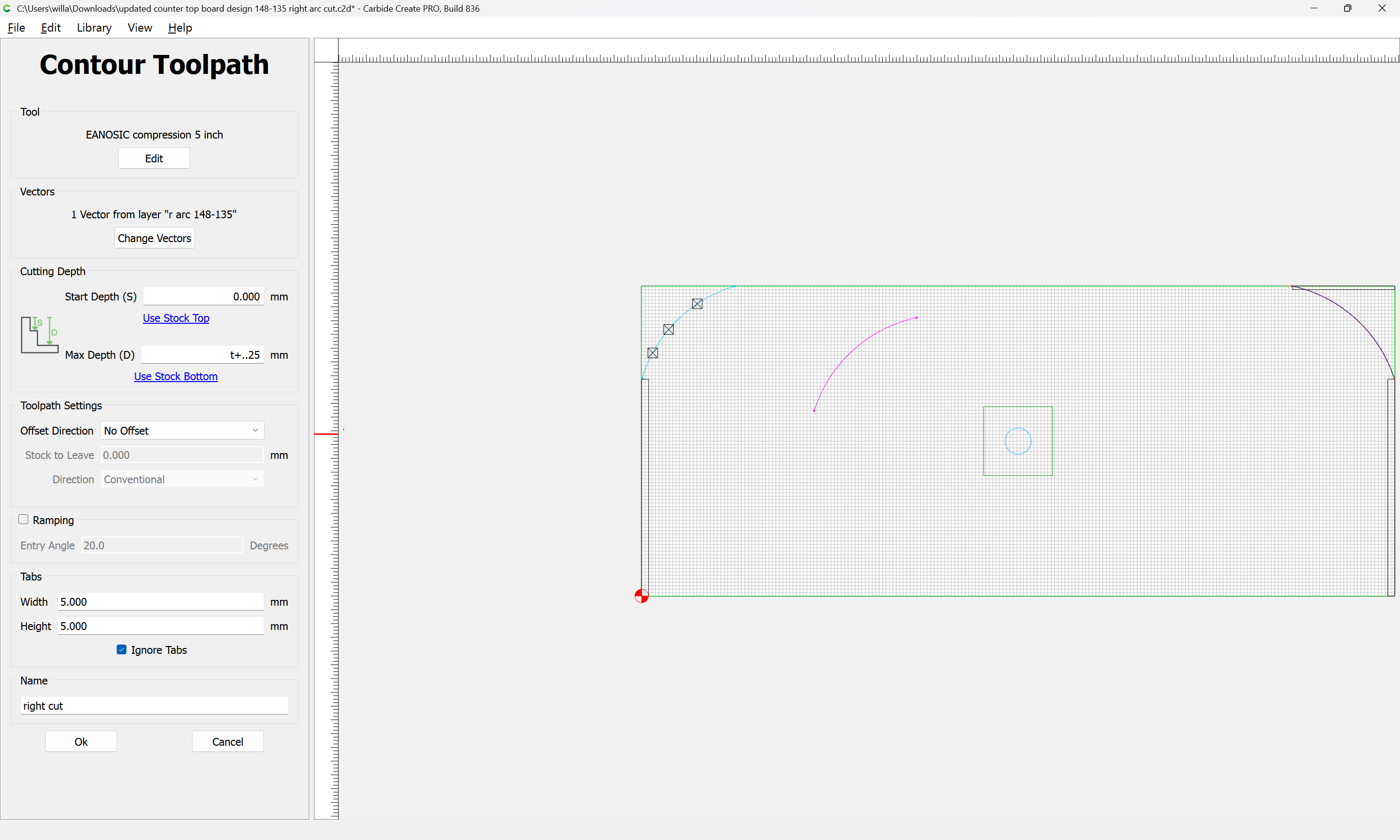 I am trying to cut a curve on each end of a 2" thick wall nut board I am designing for a counter top. The arcs are in top 2 corners. I designed this as an arc so that I dont have to cut the entire board, just cut off the arcs so that I have curved corners.