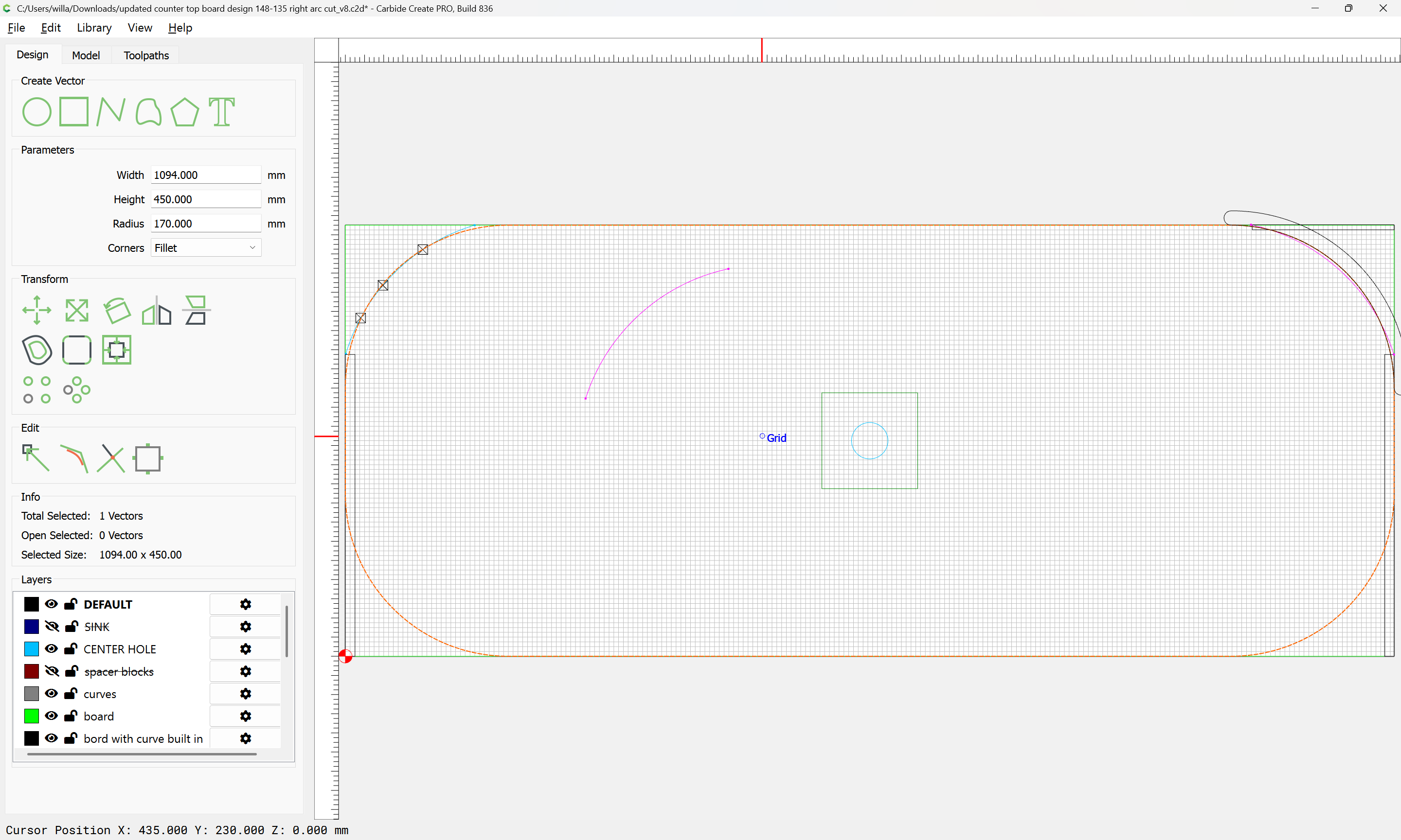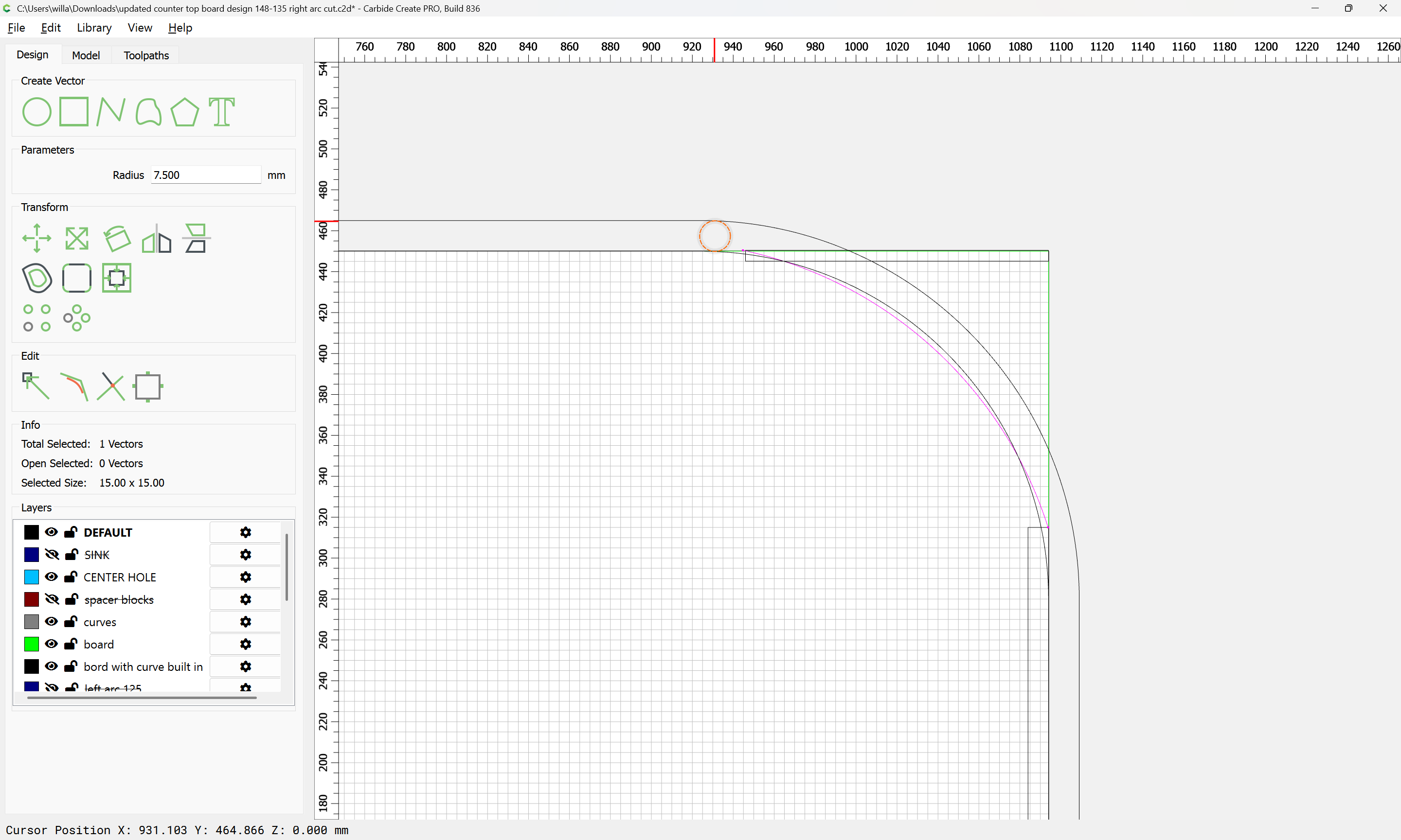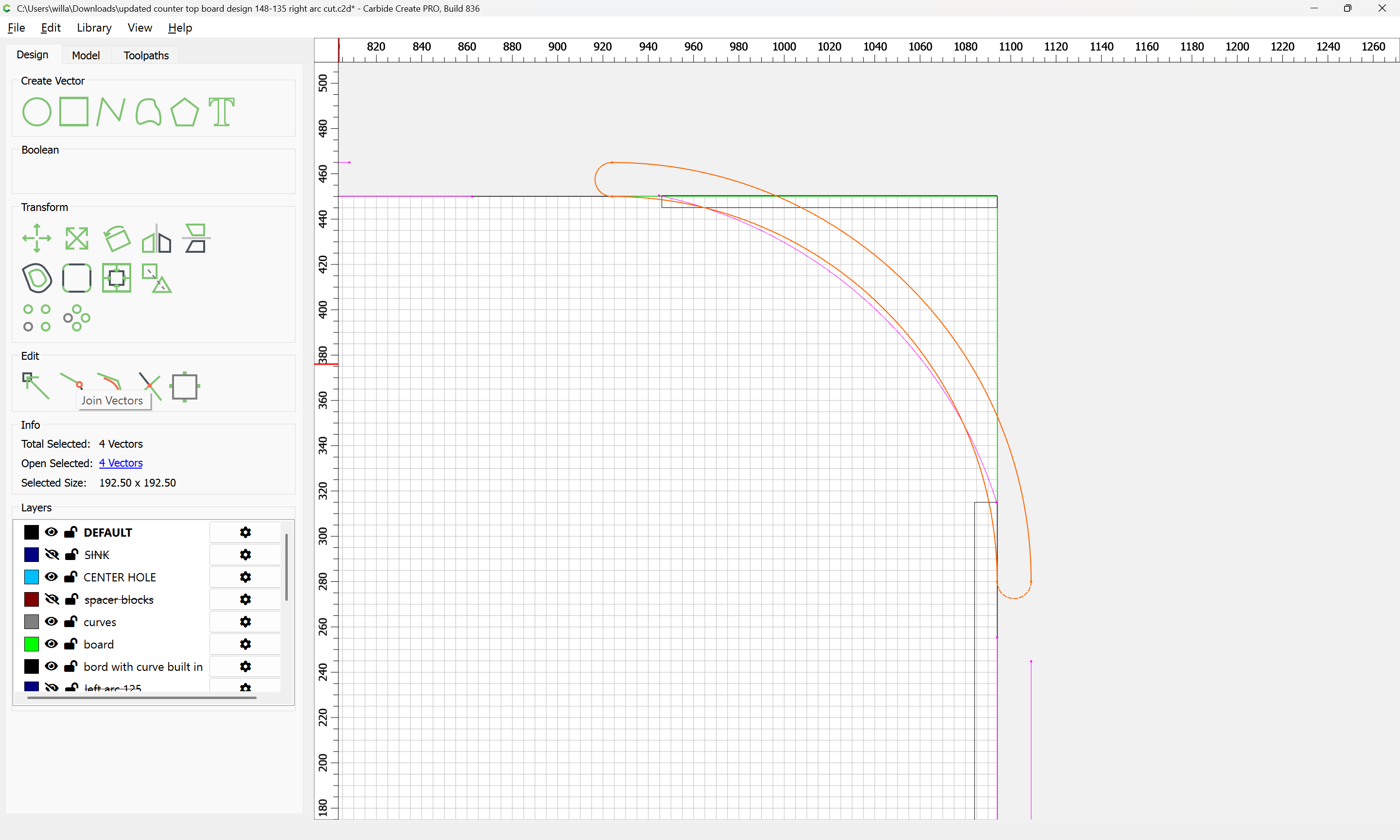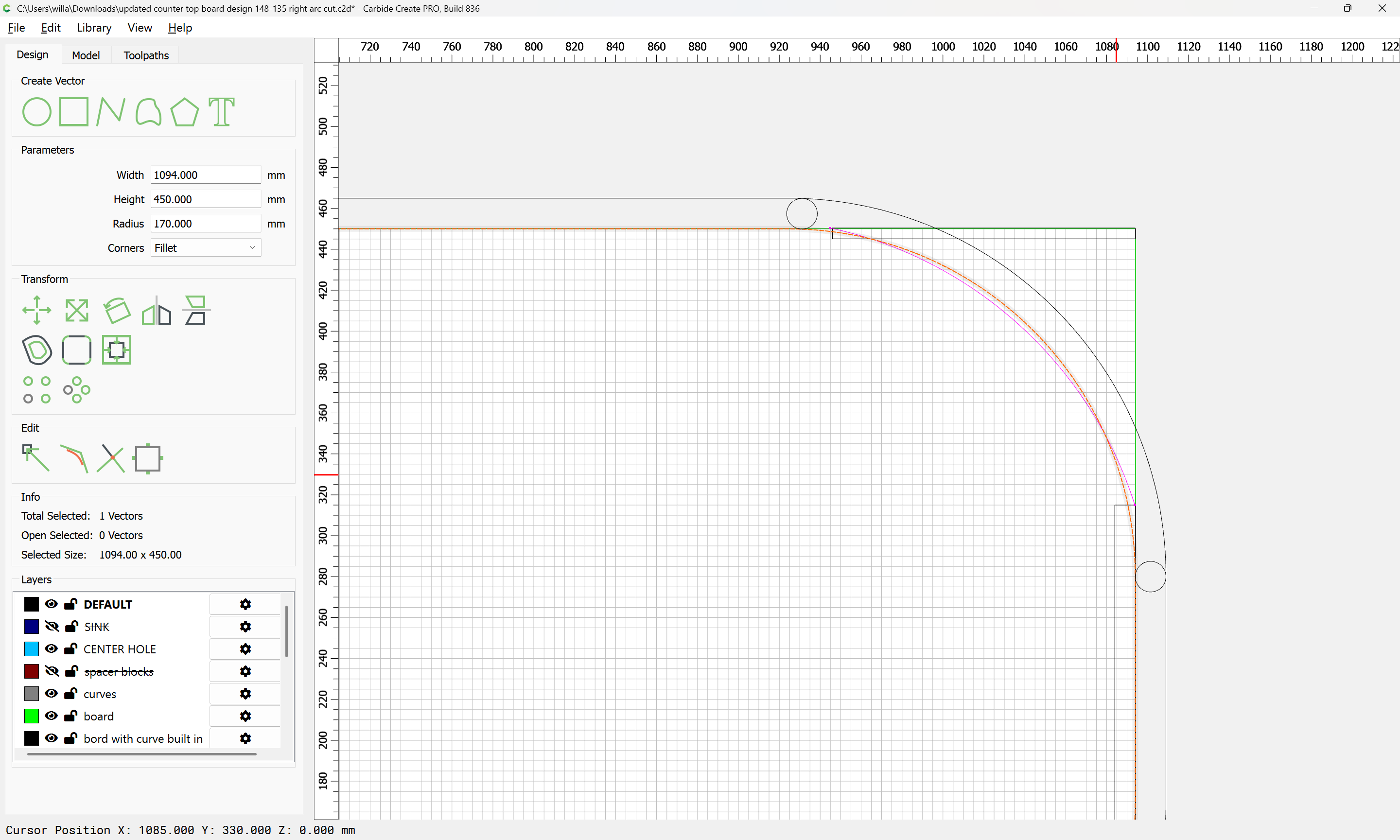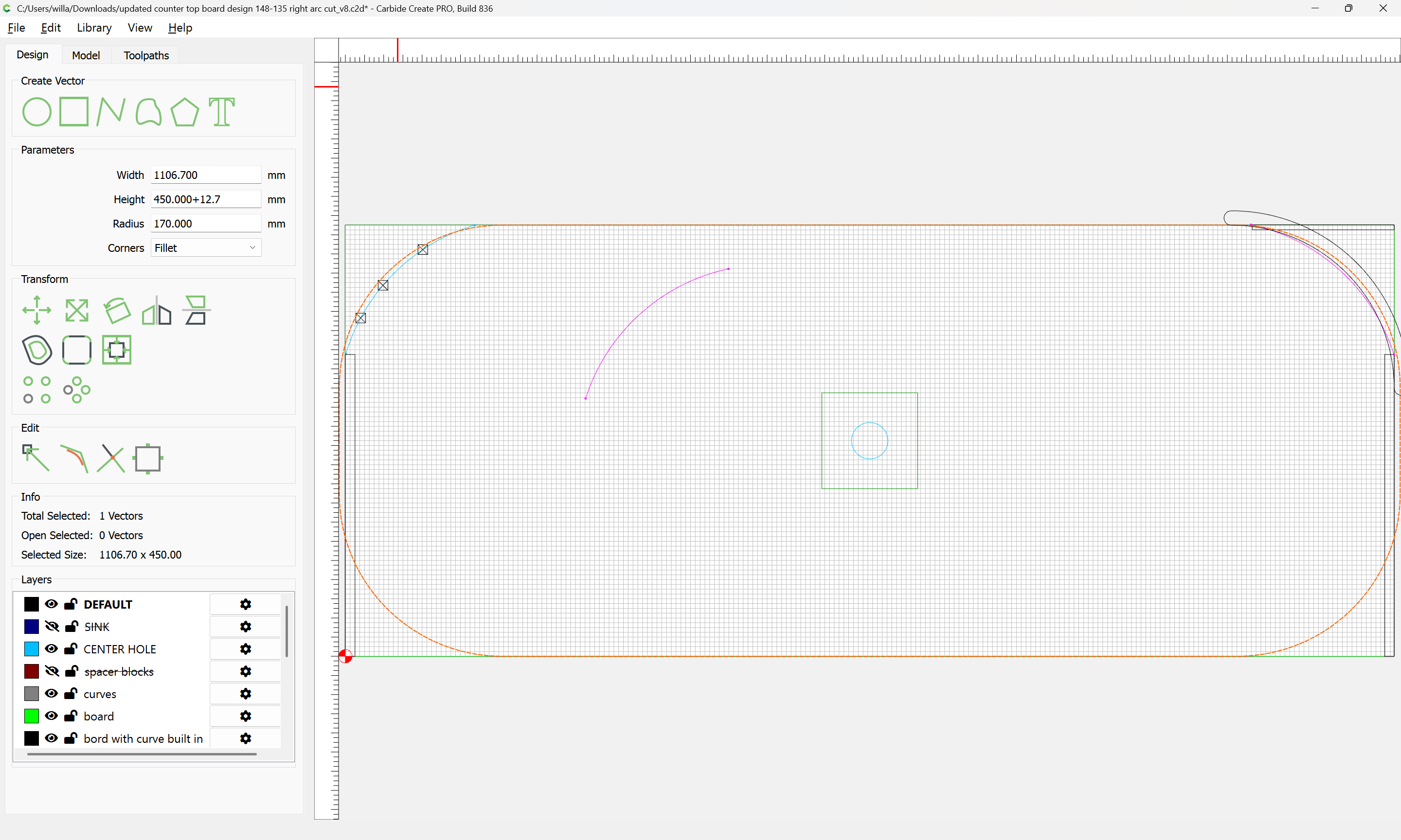 I am trying to cut a curve on each end of a 2" thick wall nut board I am designing for a counter top. The arcs are in top 2 corners. I designed this as an arc so that I dont have to cut the entire board, just cut off the arcs so that I have curved corners.