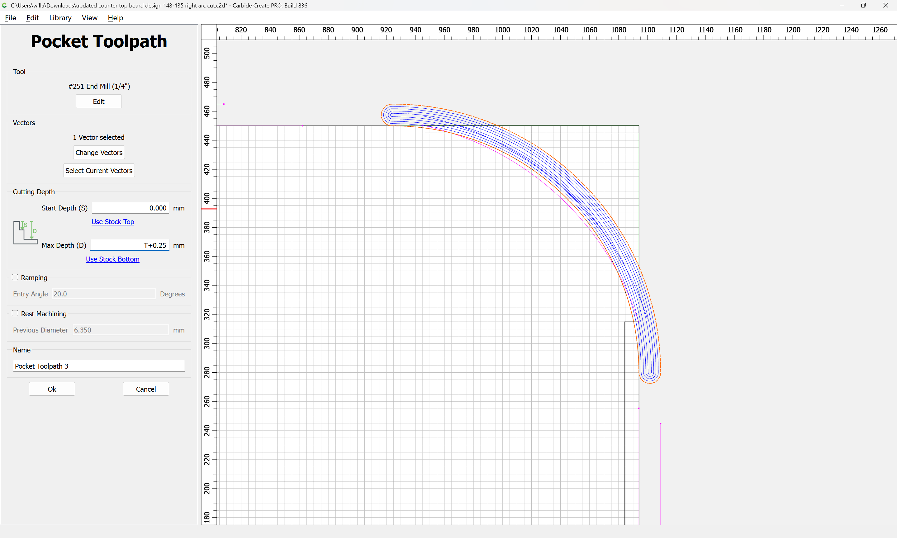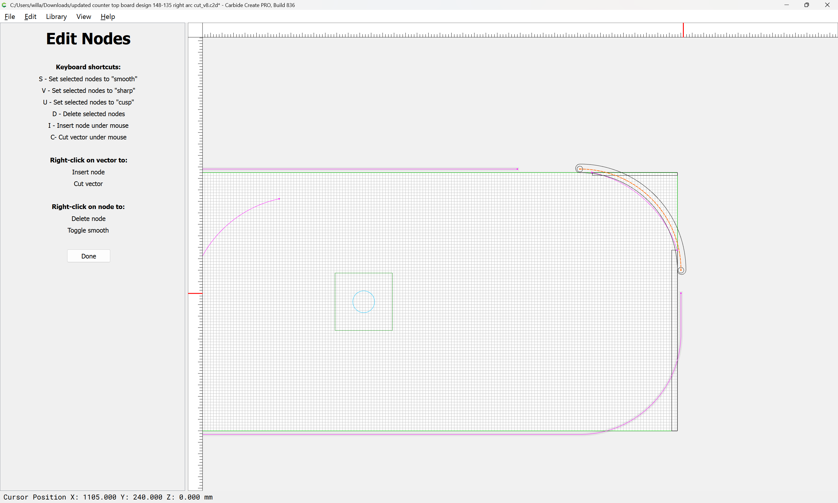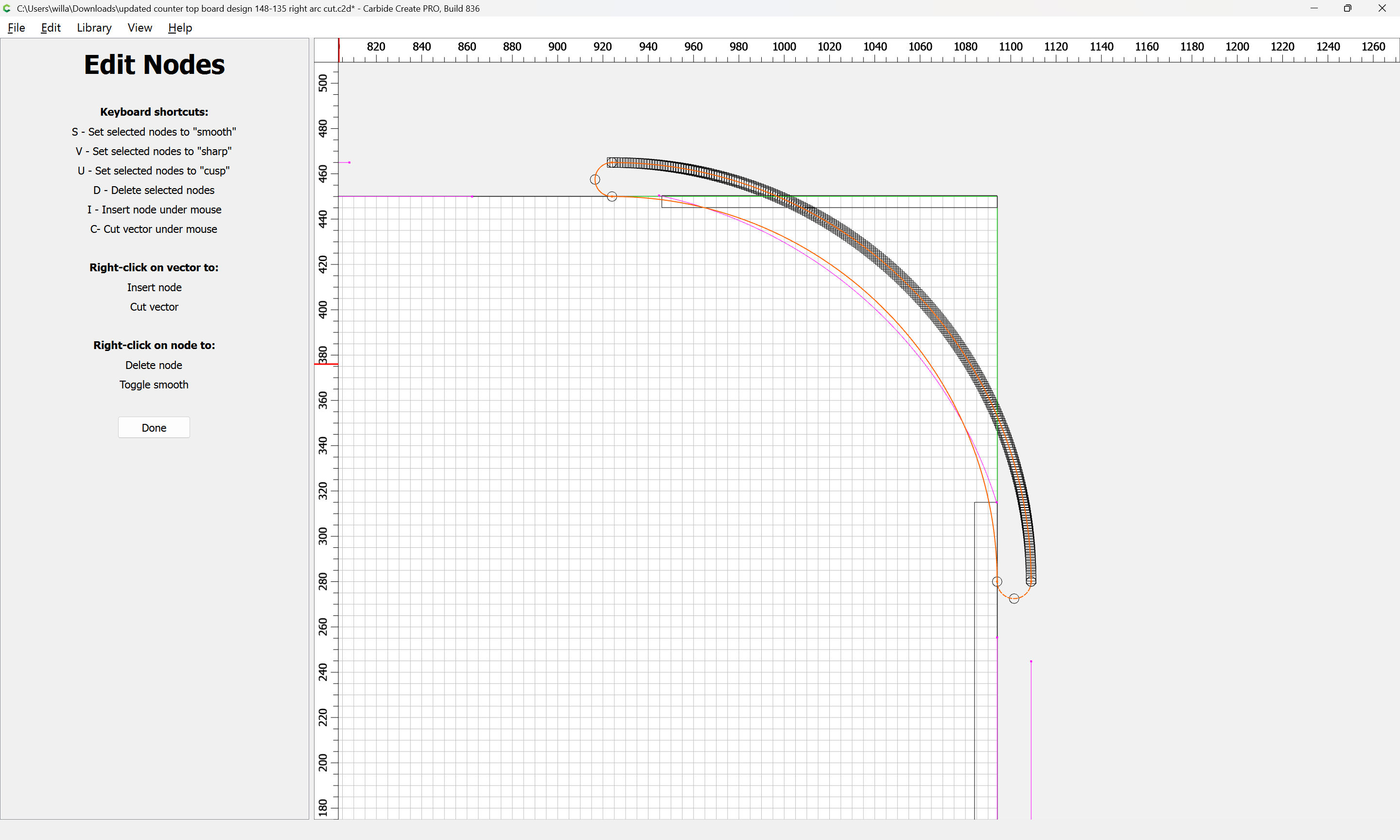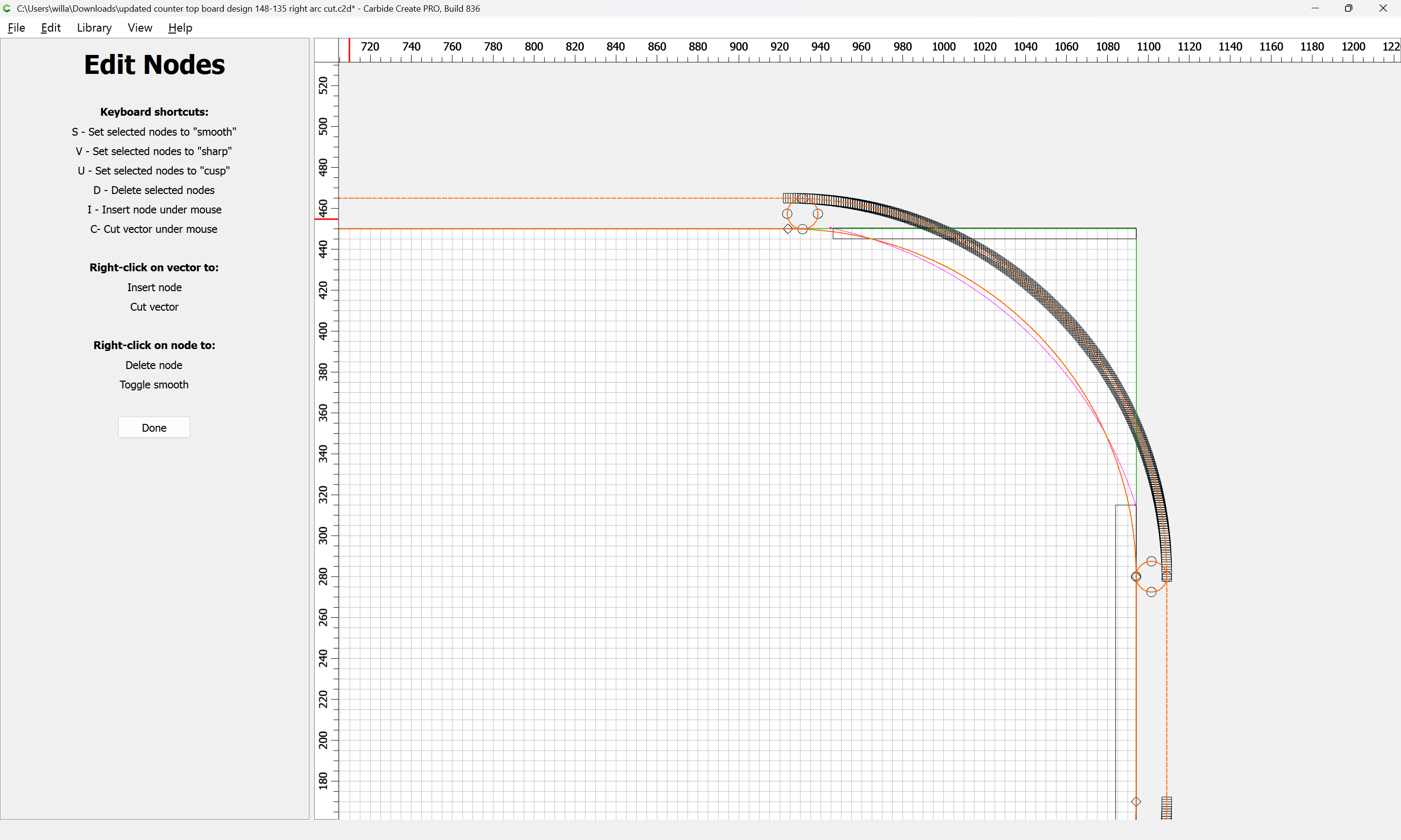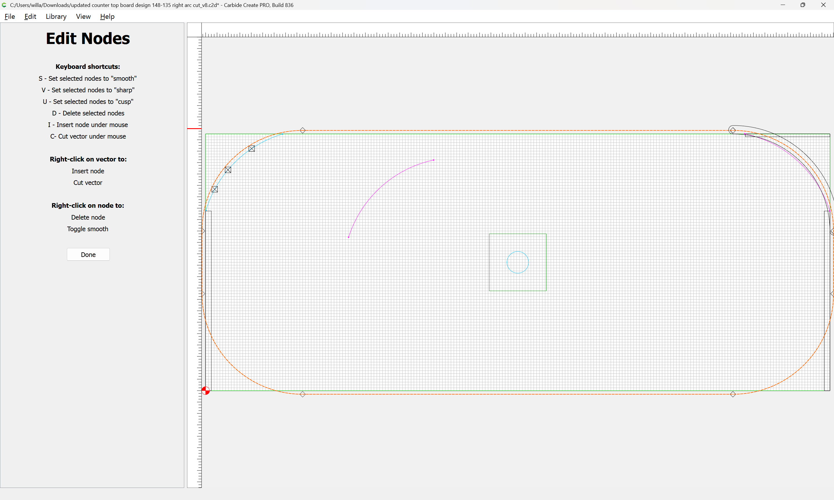 Following your earlier response, I made the 2 corner curves using 2 concentric circles and a small circle between them as in your response and edited out 2 pockets to cut. Then I used the node editeor to make it better fit the cut I wanted as I was fixing the cut I already made to rid of the lips. I get it that the pockets are better way to go about this but it does take longer in thicker boards.