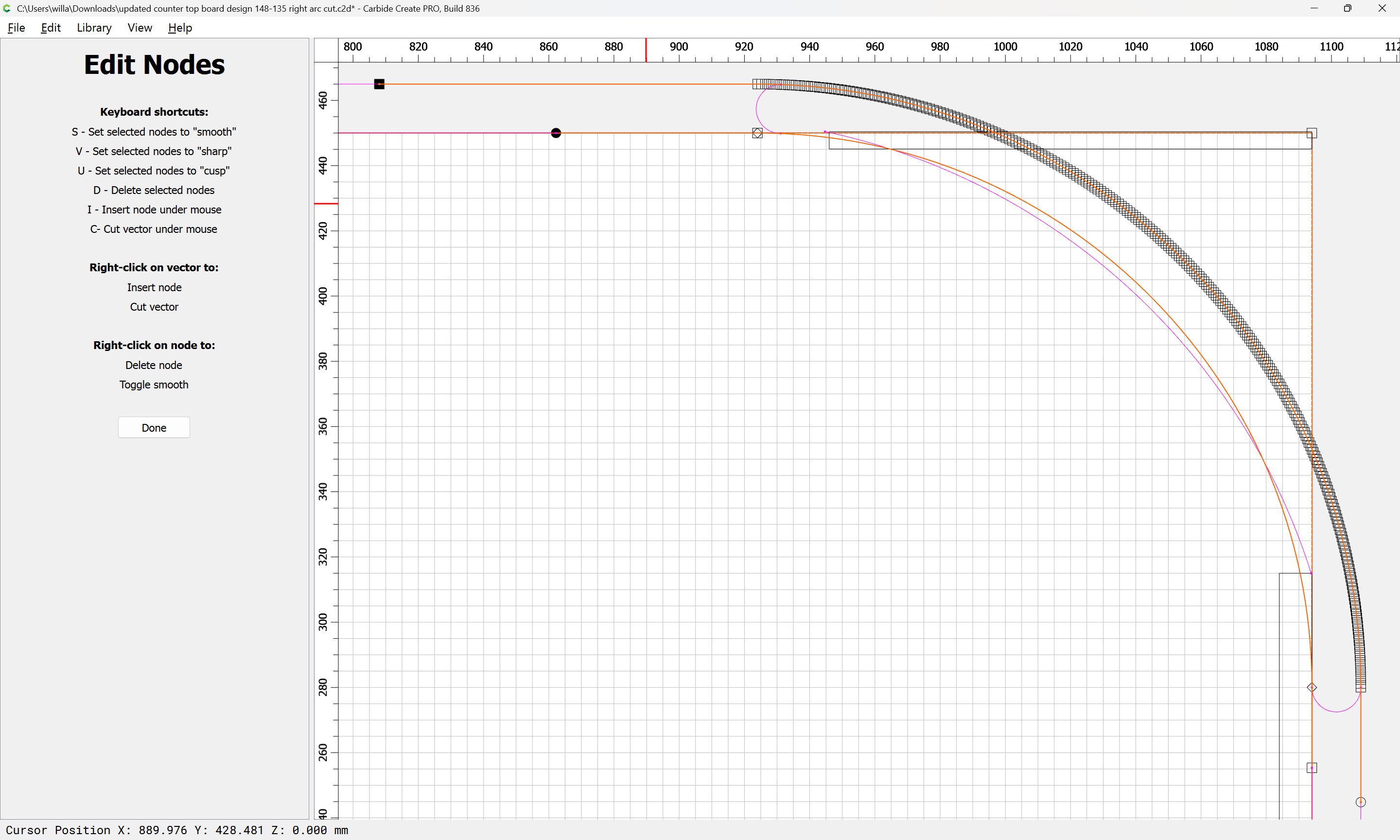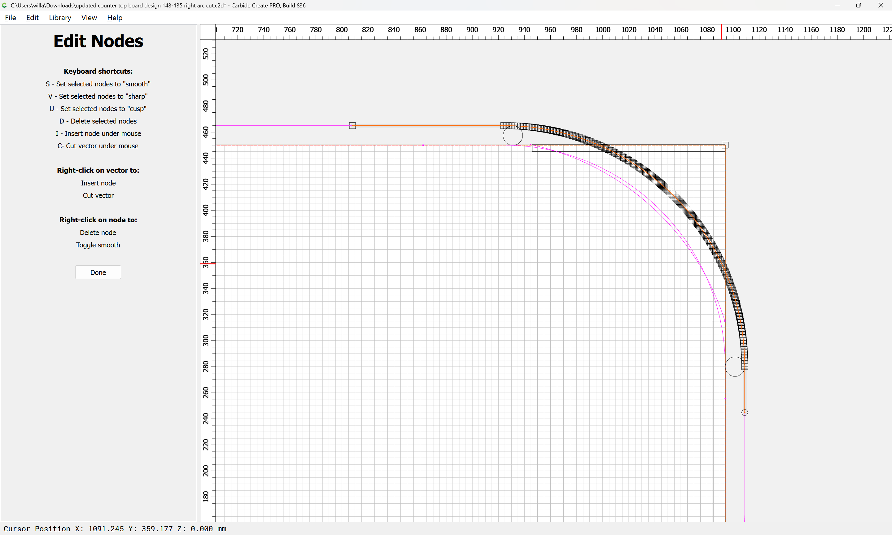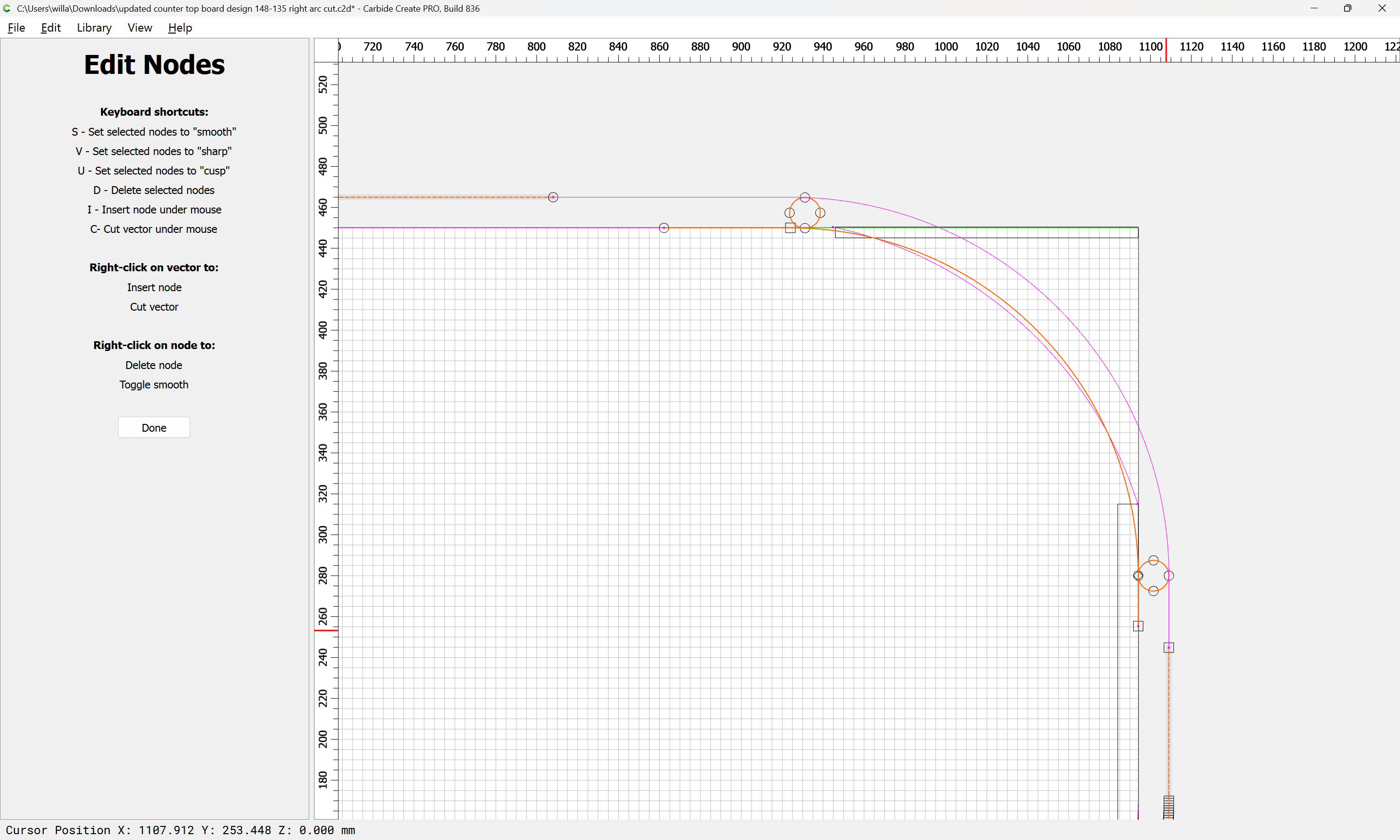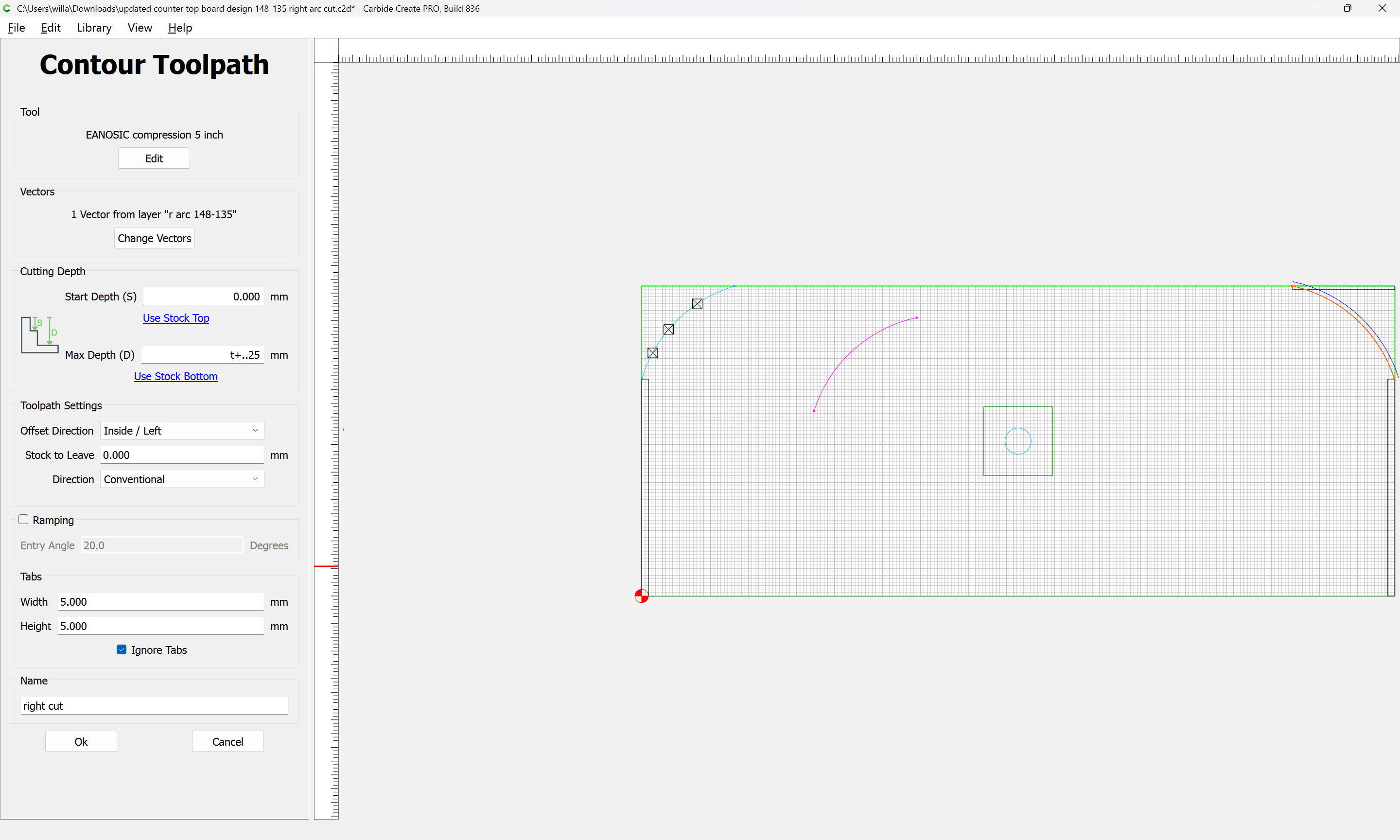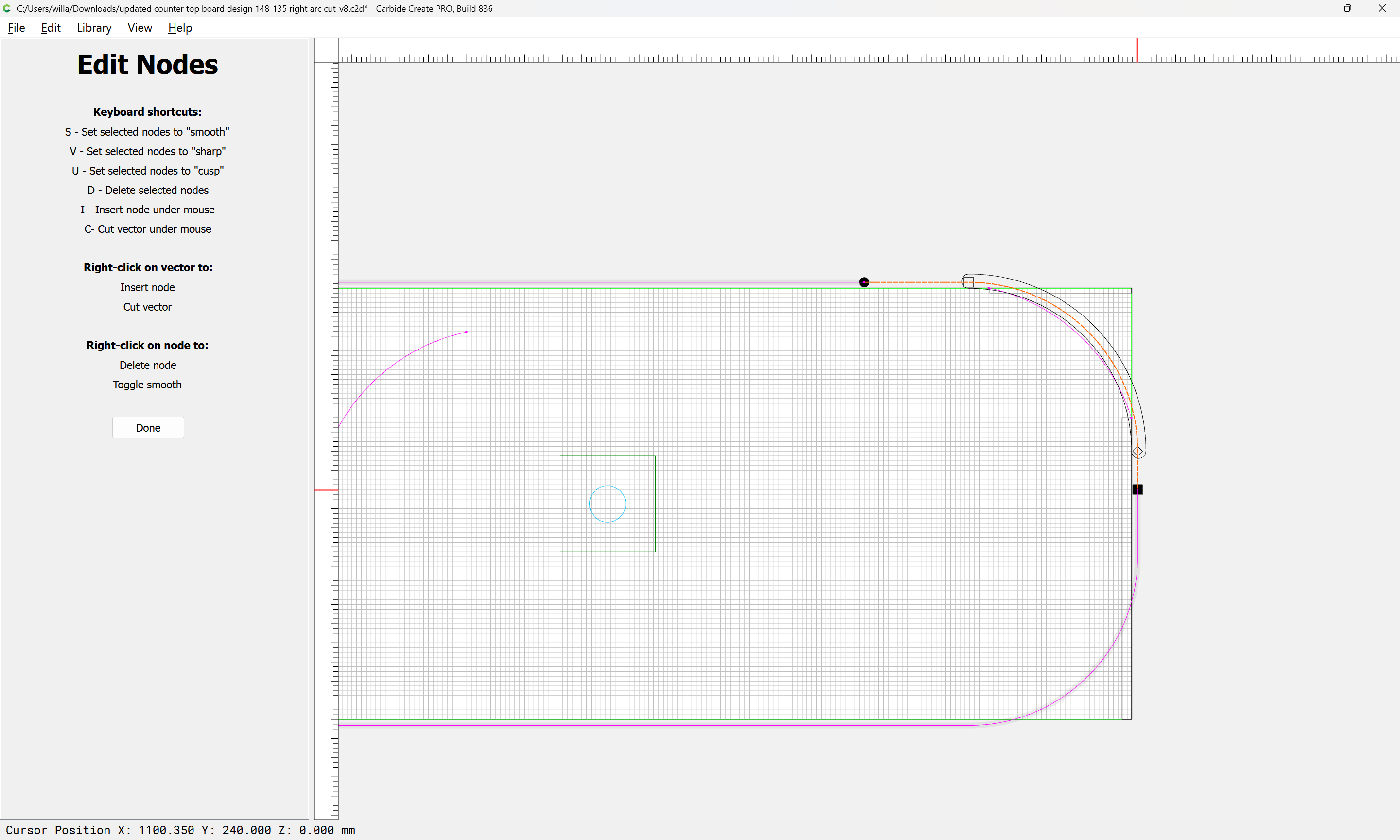 Following your earlier response, I made the 2 corner curves using 2 concentric circles and a small circle between them as in your response and edited out 2 pockets to cut. Then I used the node editeor to make it better fit the cut I wanted as I was fixing the cut I already made to rid of the lips. I get it that the pockets are better way to go about this but it does take longer in thicker boards.