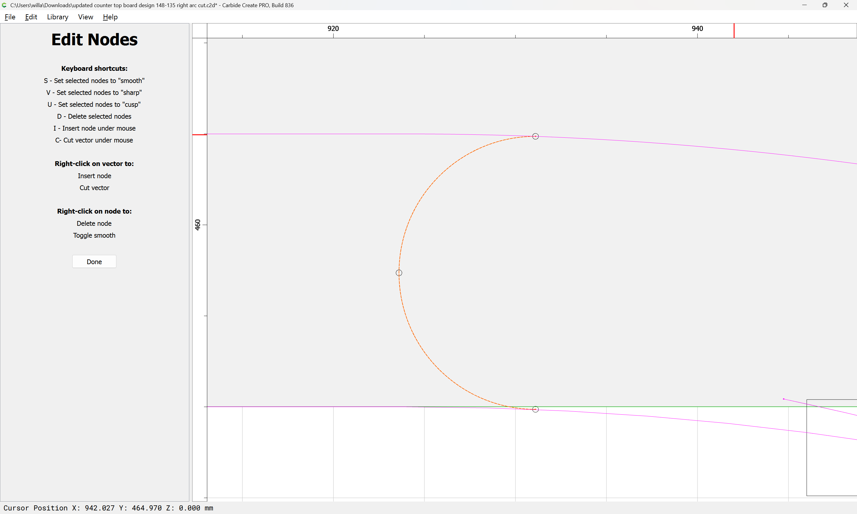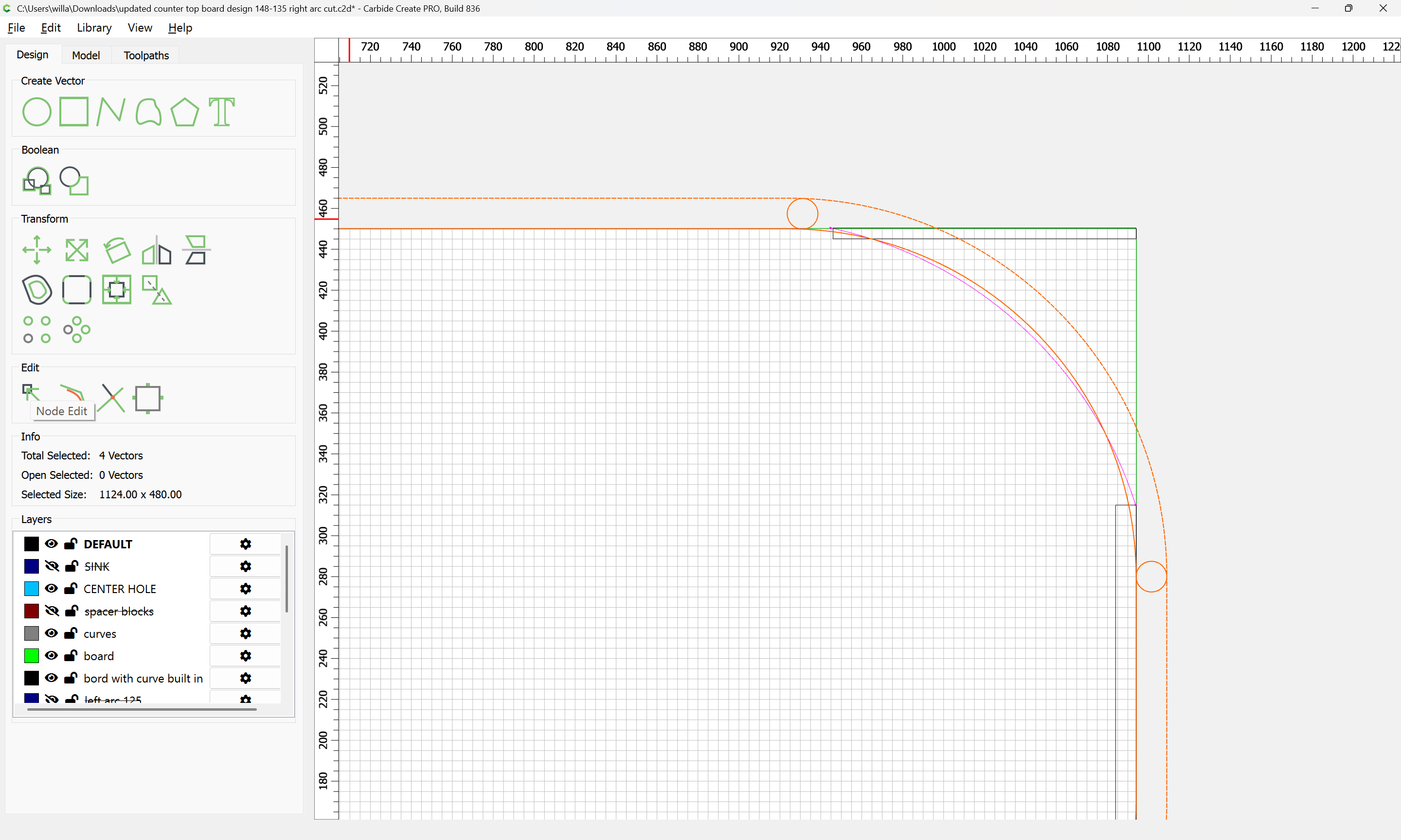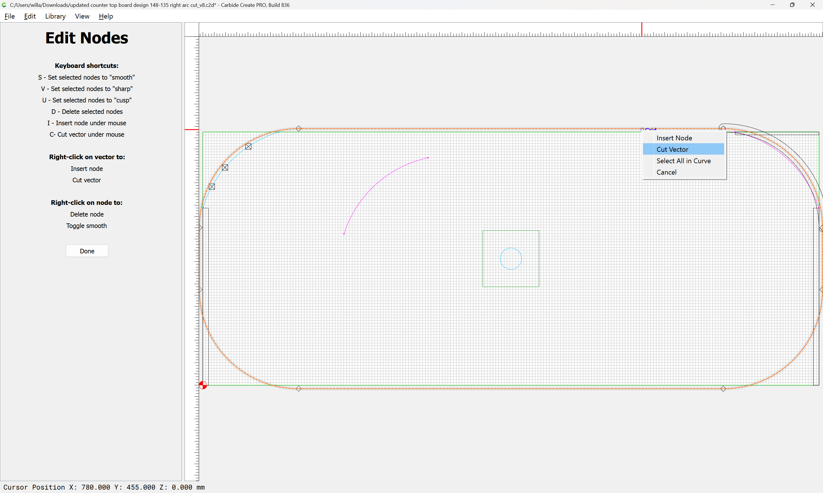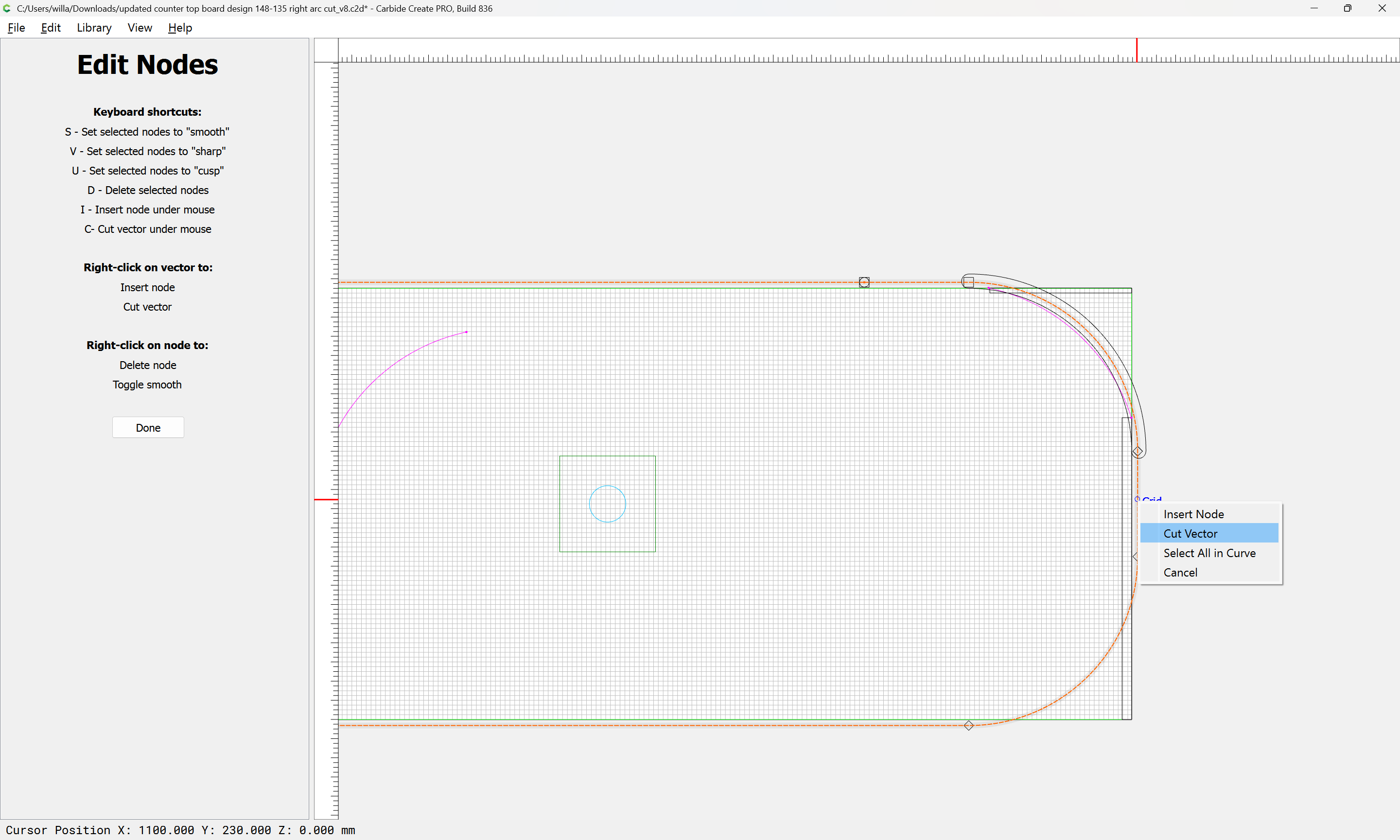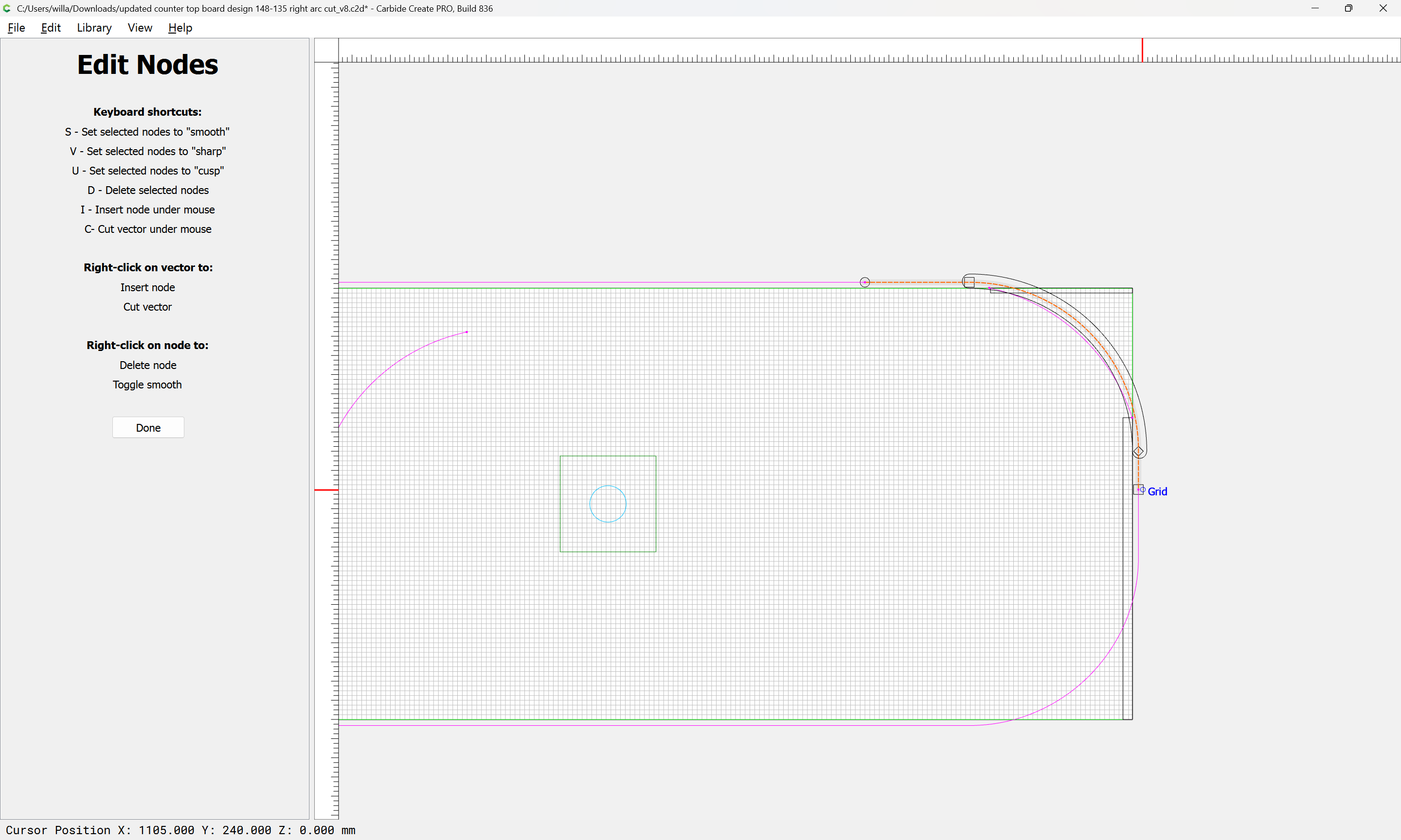 Following your earlier response, I made the 2 corner curves using 2 concentric circles and a small circle between them as in your response and edited out 2 pockets to cut. Then I used the node editeor to make it better fit the cut I wanted as I was fixing the cut I already made to rid of the lips. I get it that the pockets are better way to go about this but it does take longer in thicker boards.