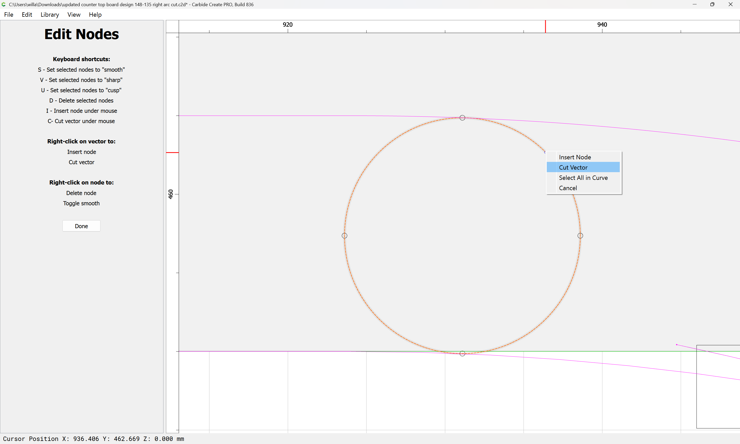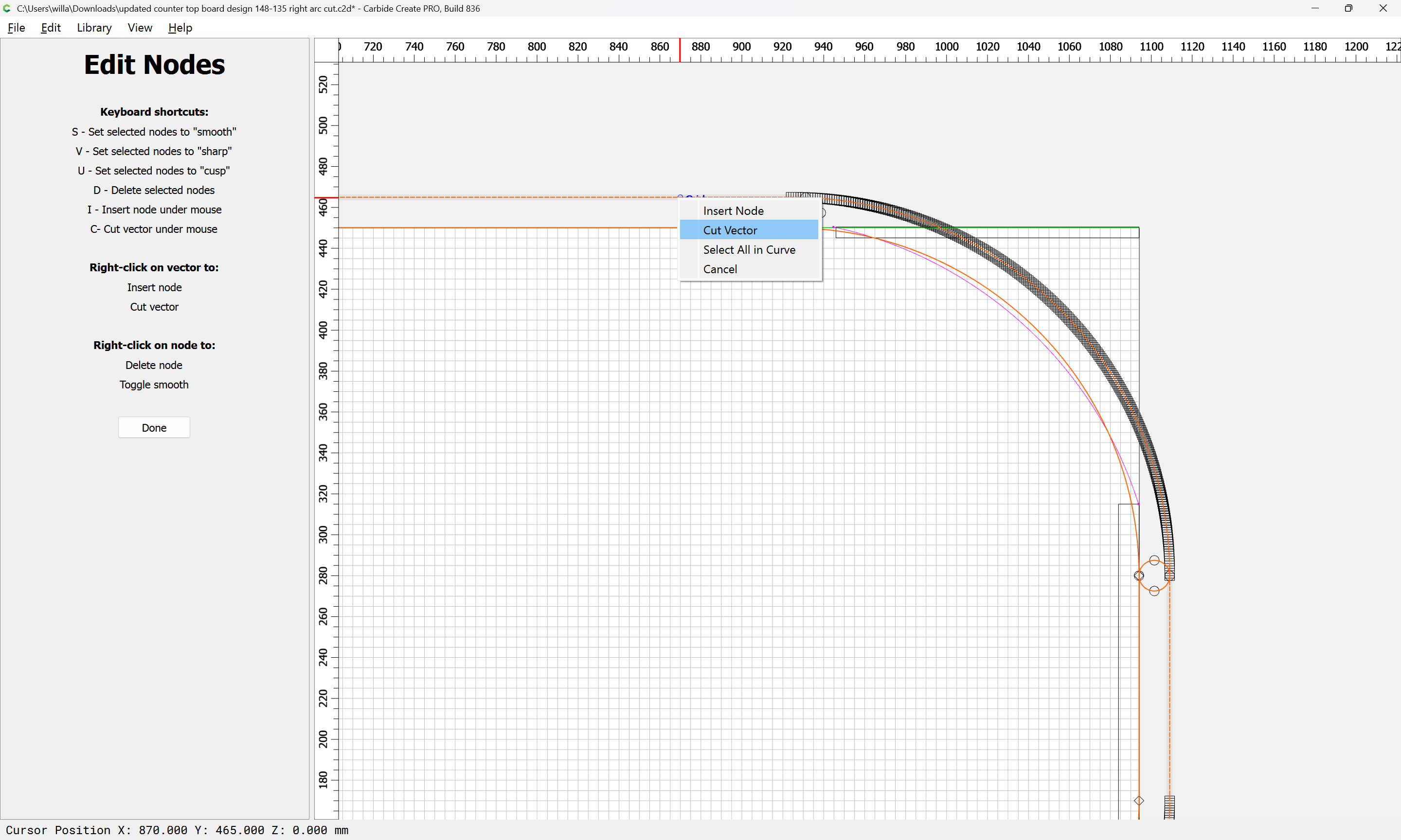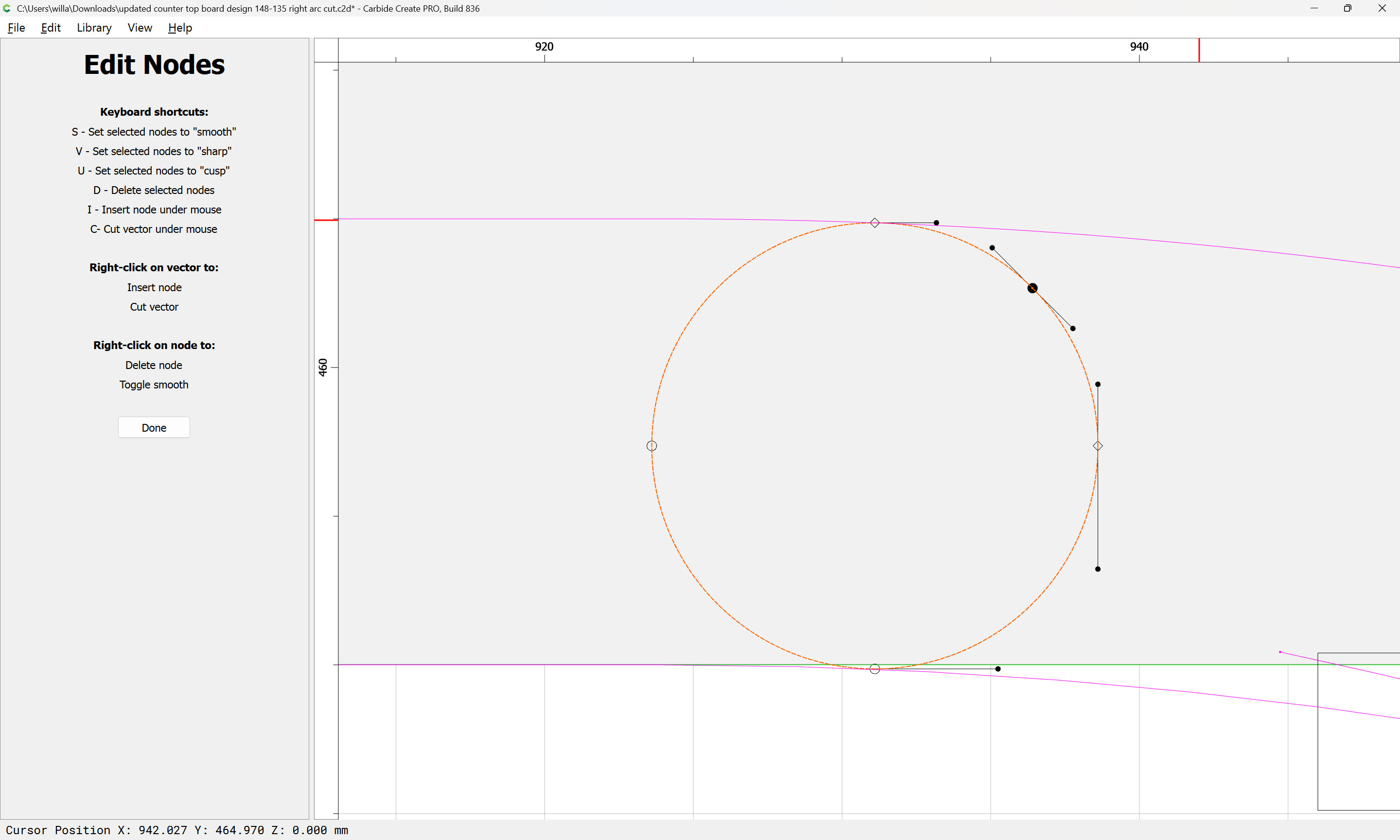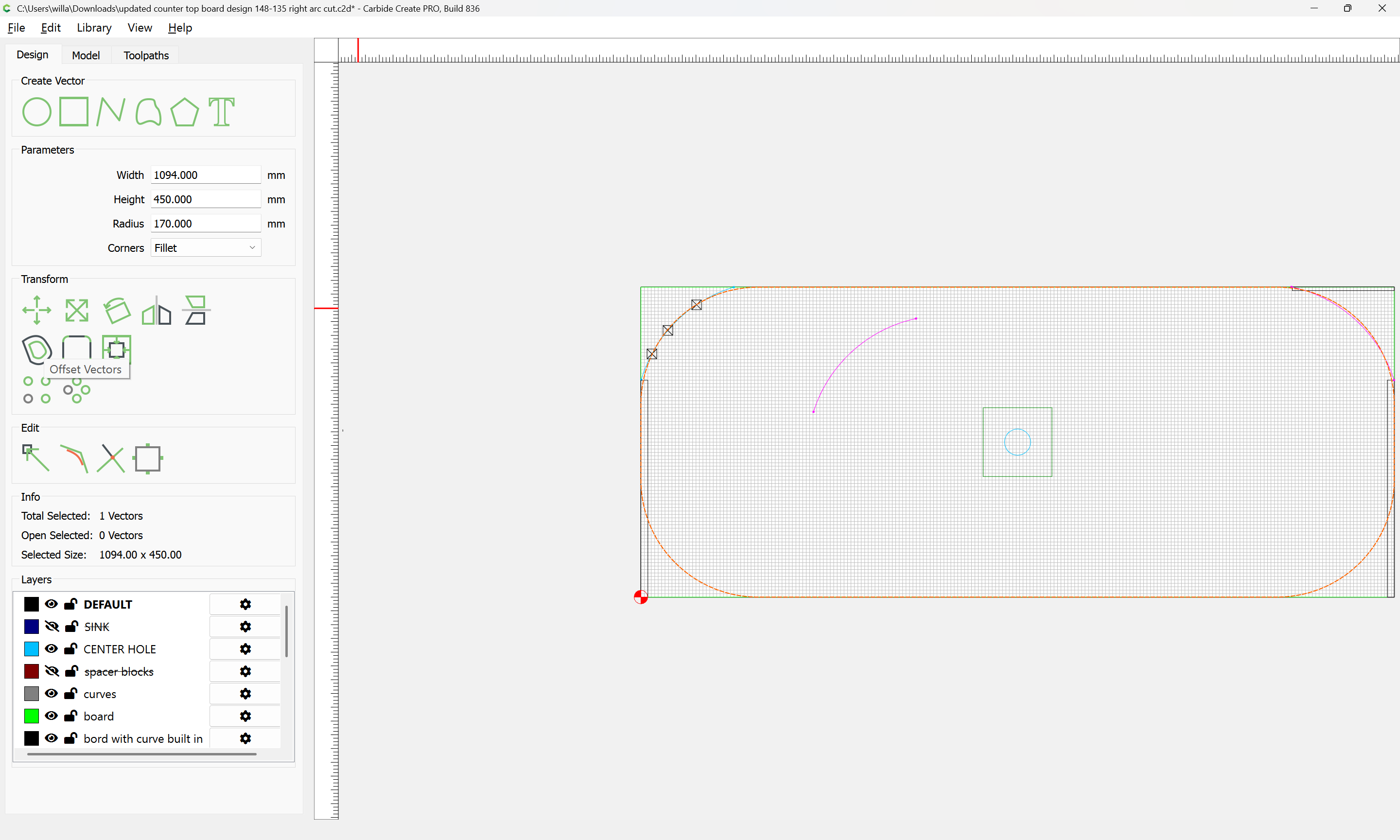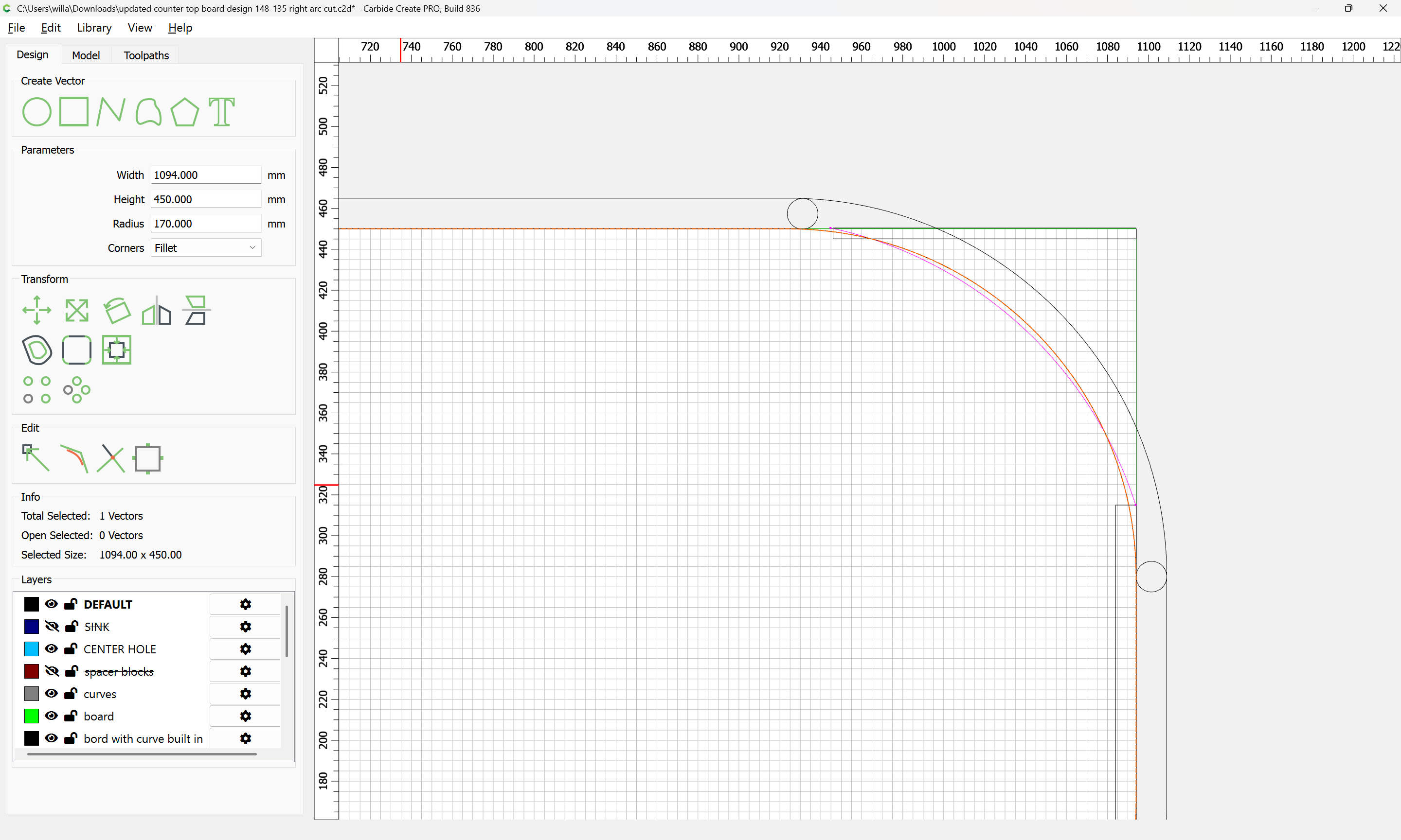 Following your earlier response, I made the 2 corner curves using 2 concentric circles and a small circle between them as in your response and edited out 2 pockets to cut. Then I used the node editeor to make it better fit the cut I wanted as I was fixing the cut I already made to rid of the lips. I get it that the pockets are better way to go about this but it does take longer in thicker boards.