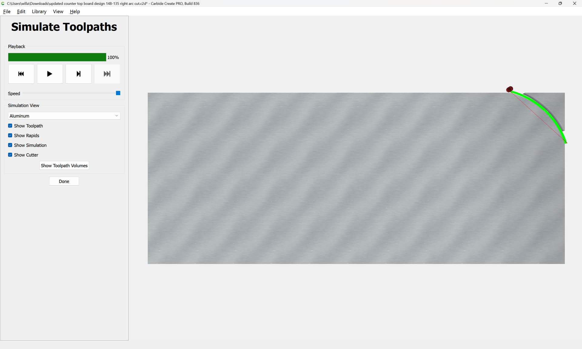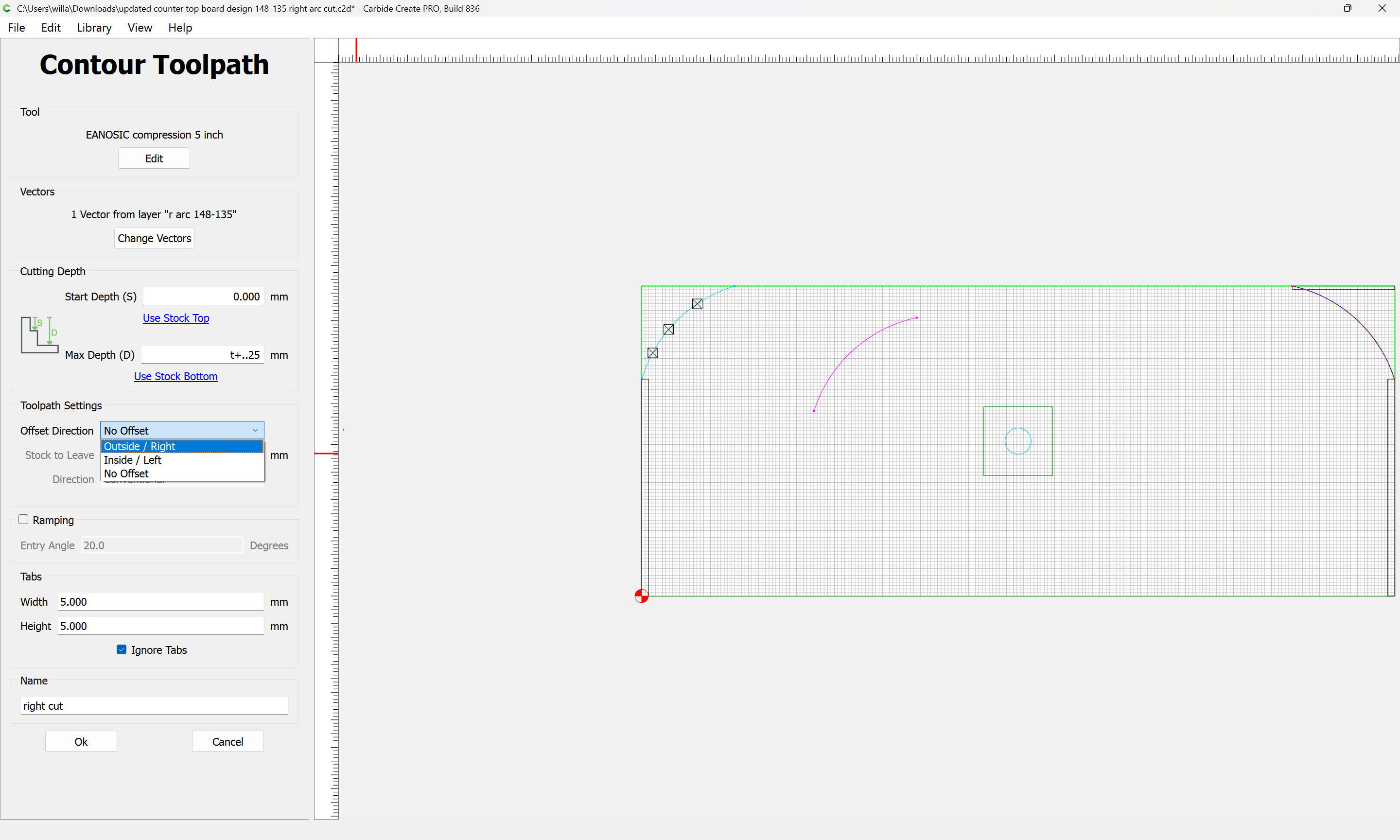 I am using a 1/2" shank Spiral compression cutter. It cuts the curves well, but leaves a lip at the end of the arc. I like to smooth out the ends. I tried rotating the curve to make it shallower at the end, but it still leaves the lip - which appears to be 1/2 diameter of the endmill. I used contour path with outside on the left corner and inside on the right corner. Is there a way to simplify this and any tricks? Attached is the CC file and a couple of pictures of the actual cuts. The lip seems prominent at the end of the cut and thus the right corner shows up more on the top. attachments.zip (364.1 KB)