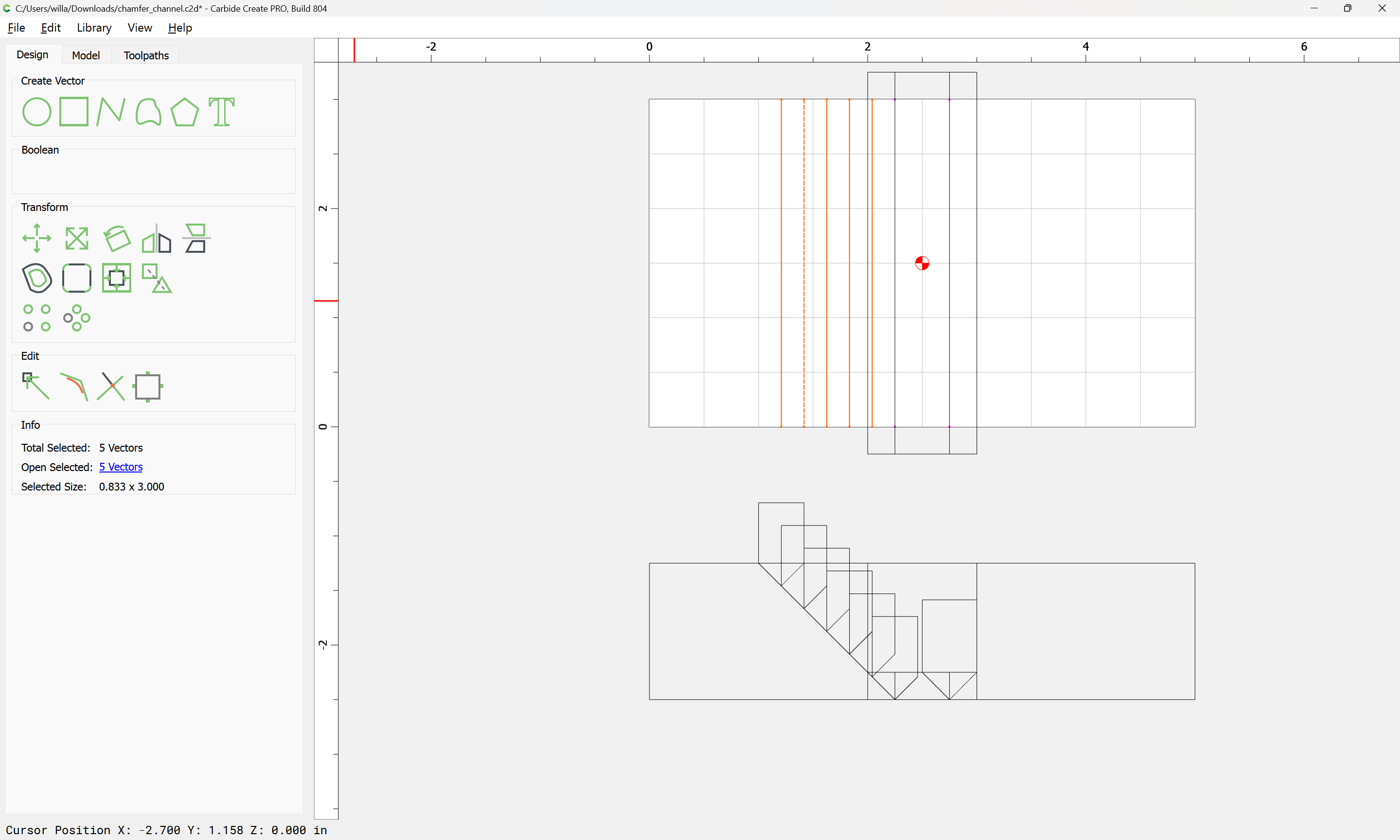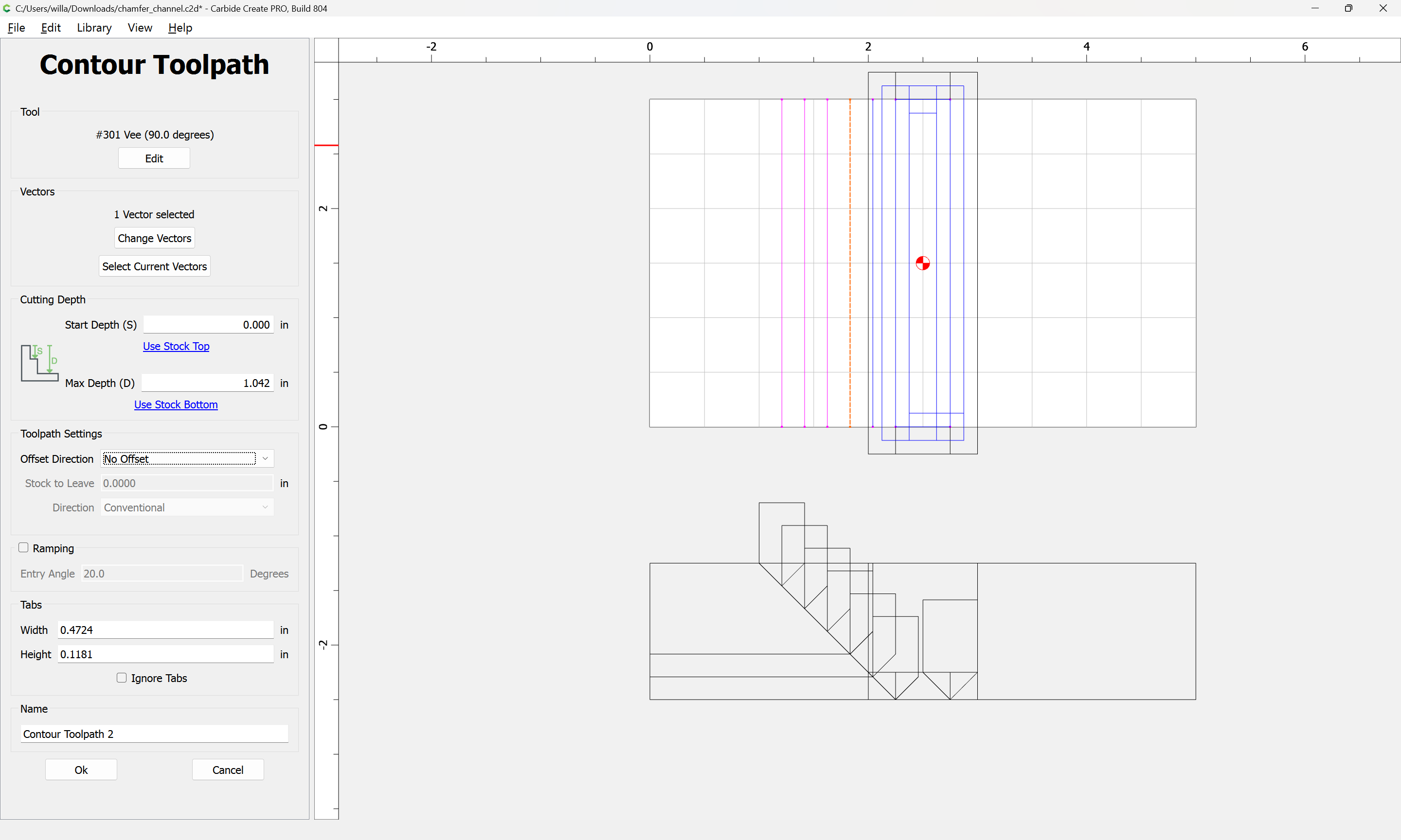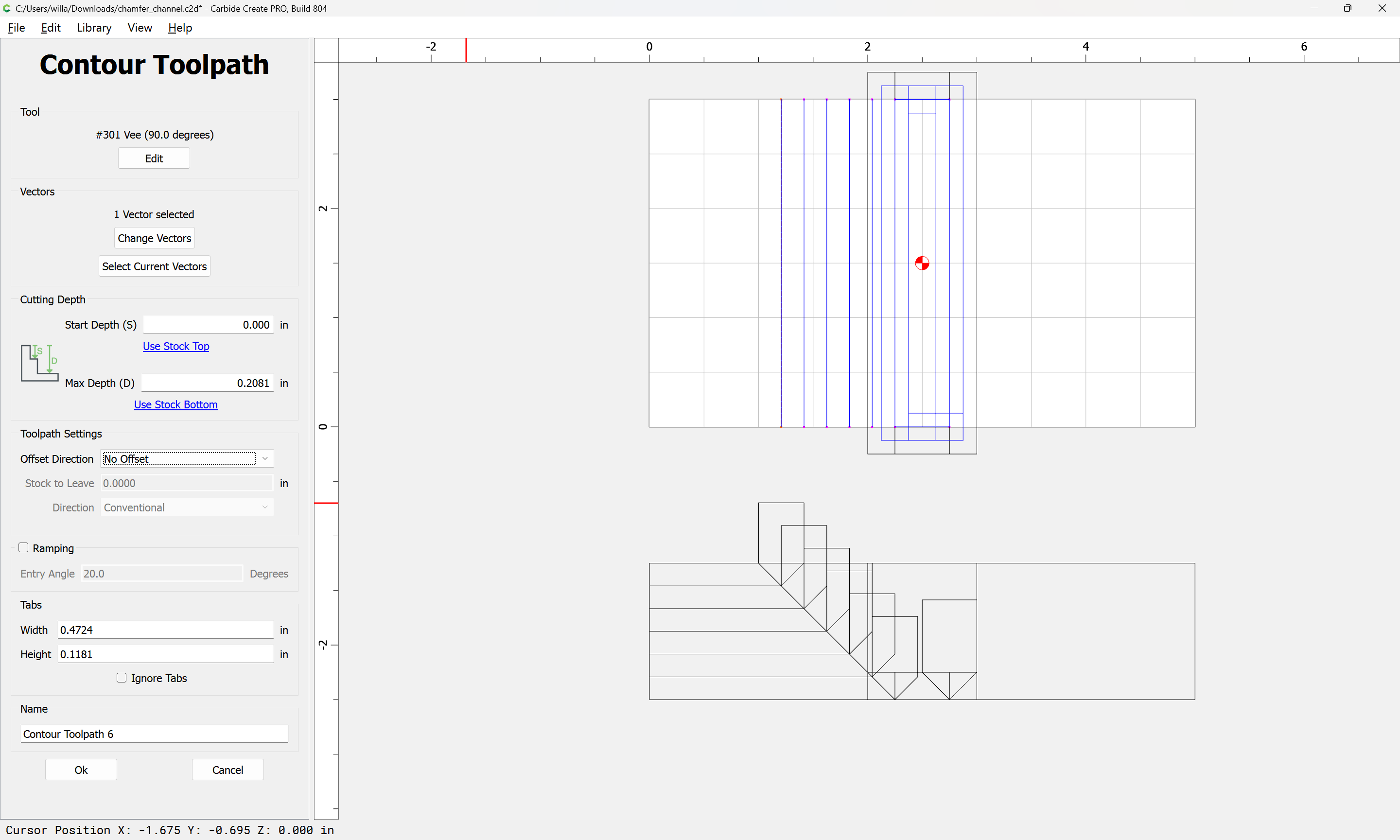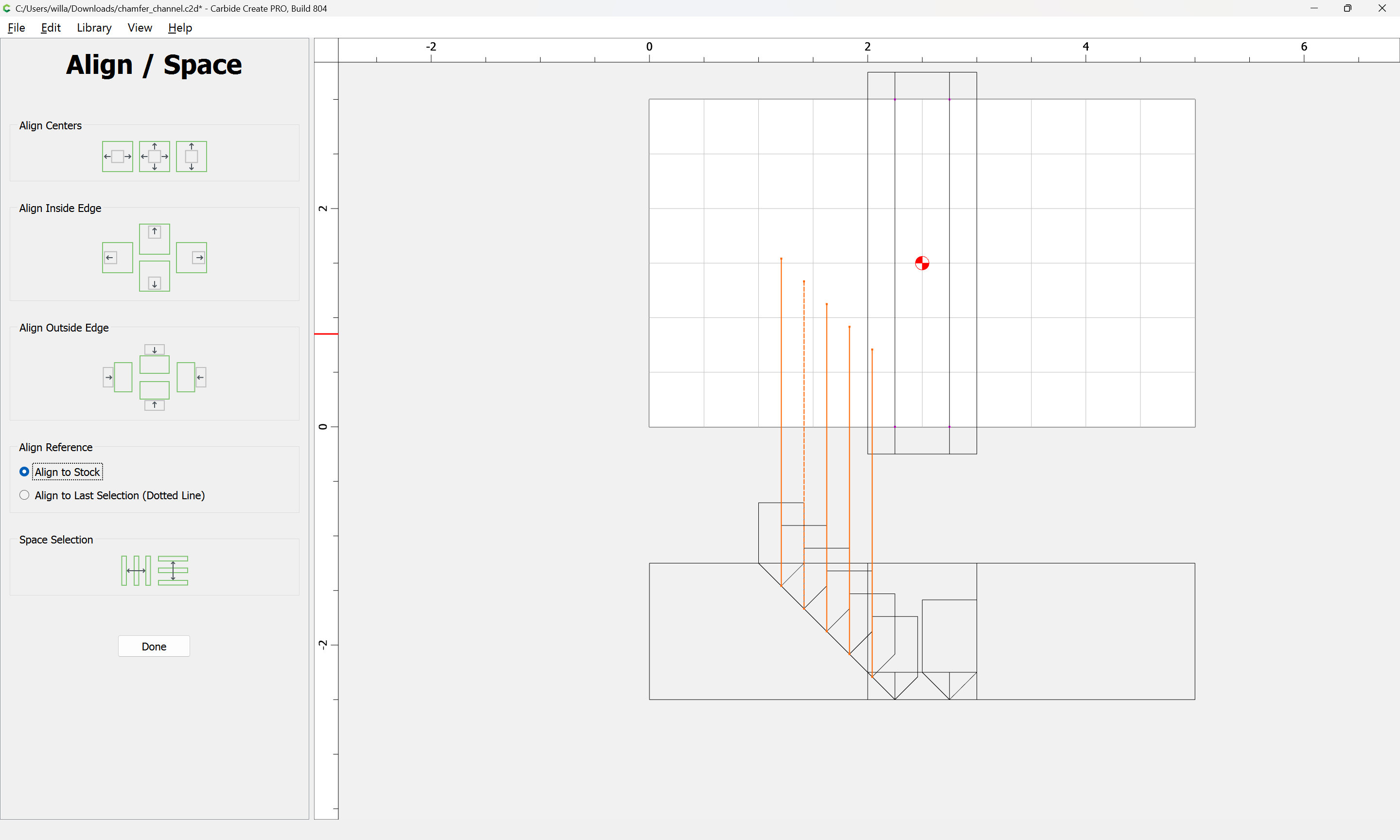 If you need to cut an angle longer than the length of the cutting flutes you will need additional lines — draw/position them in the profile and assign cuts to a suitable depth.