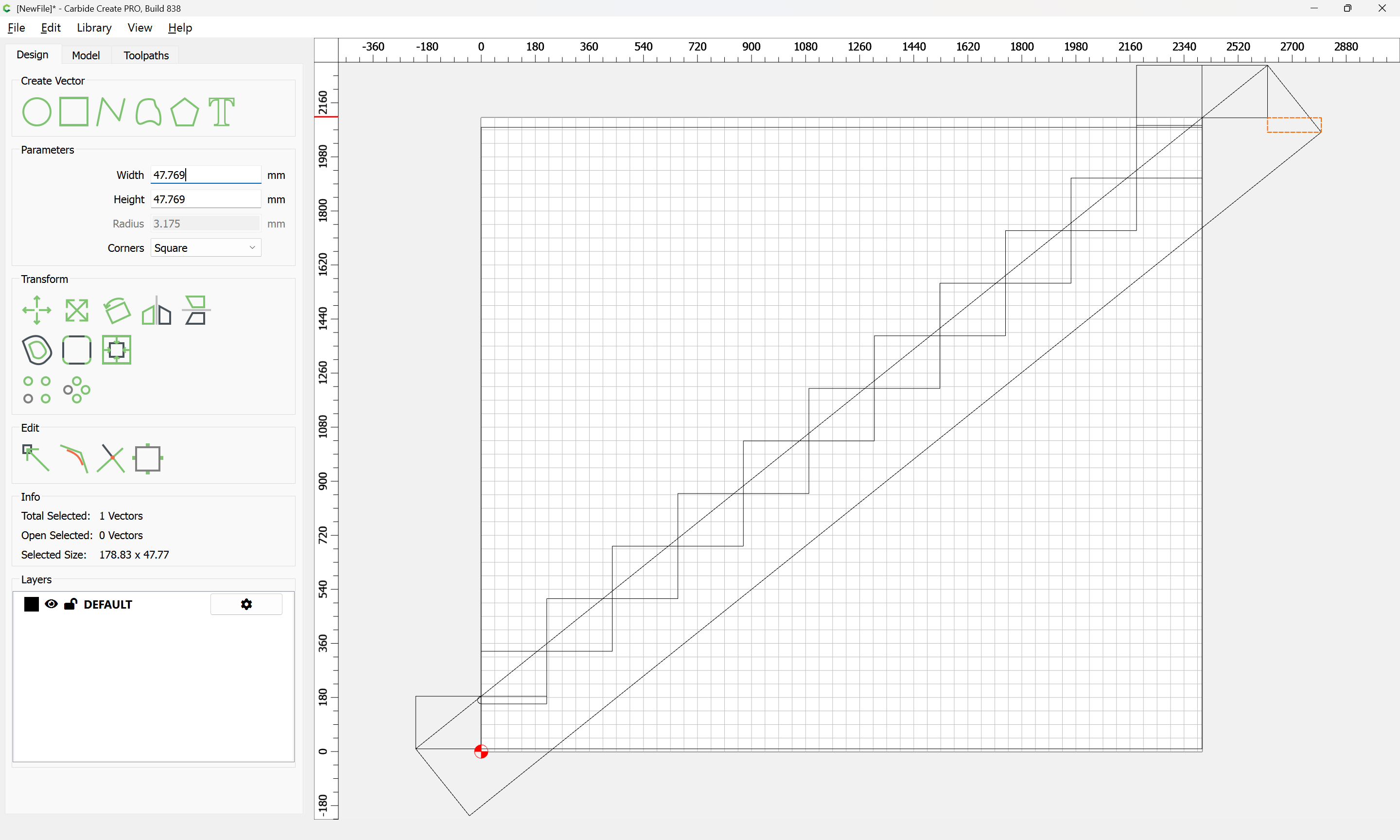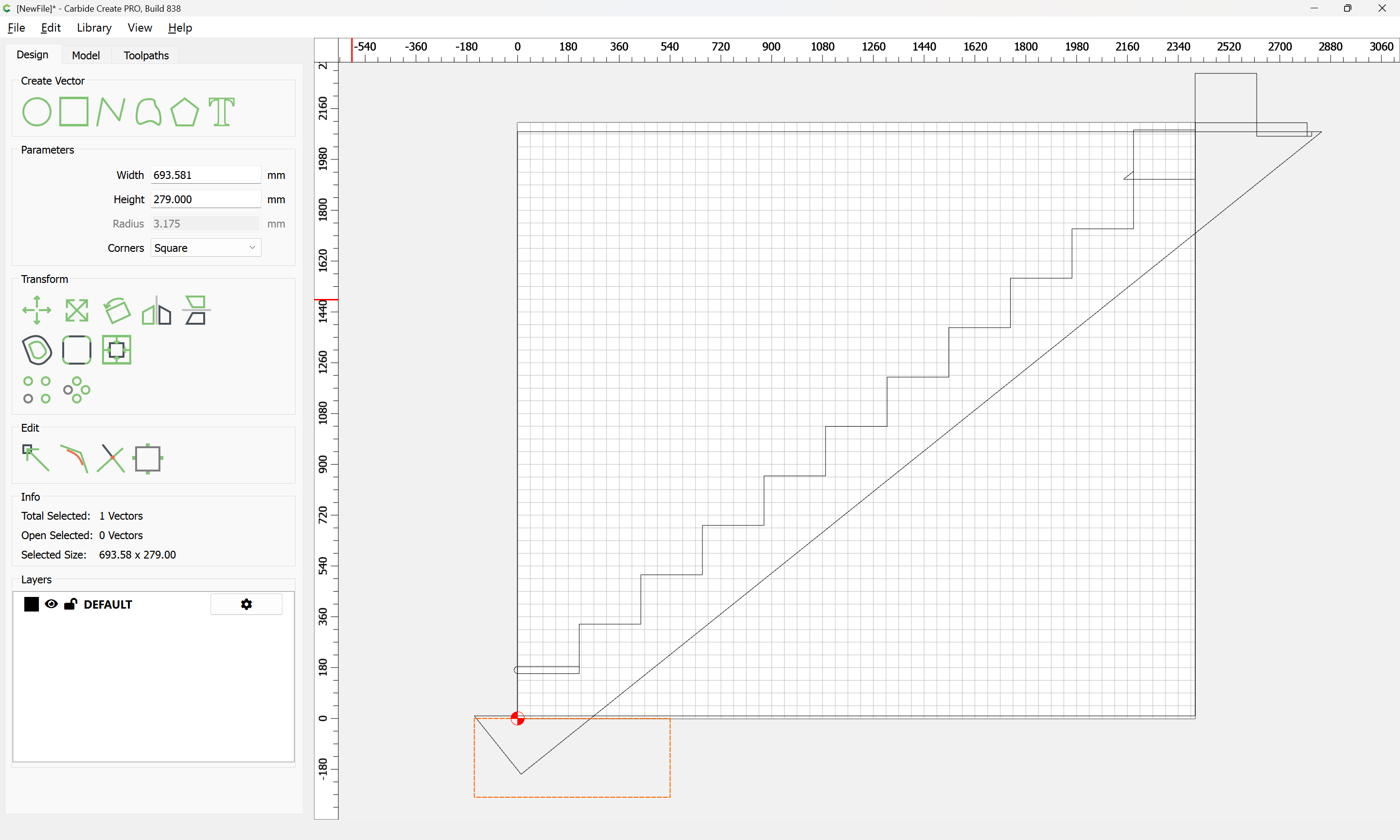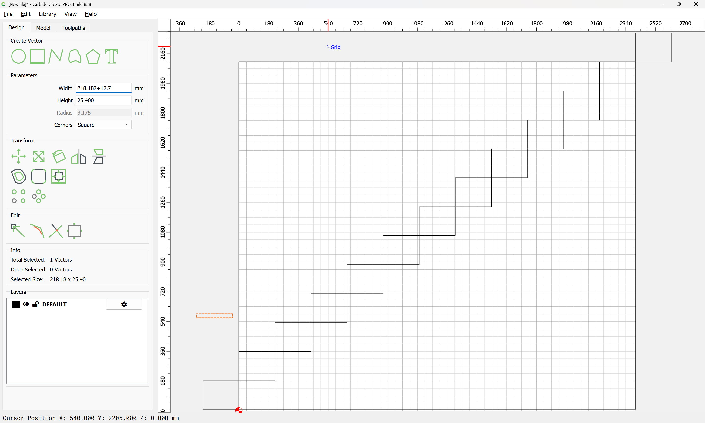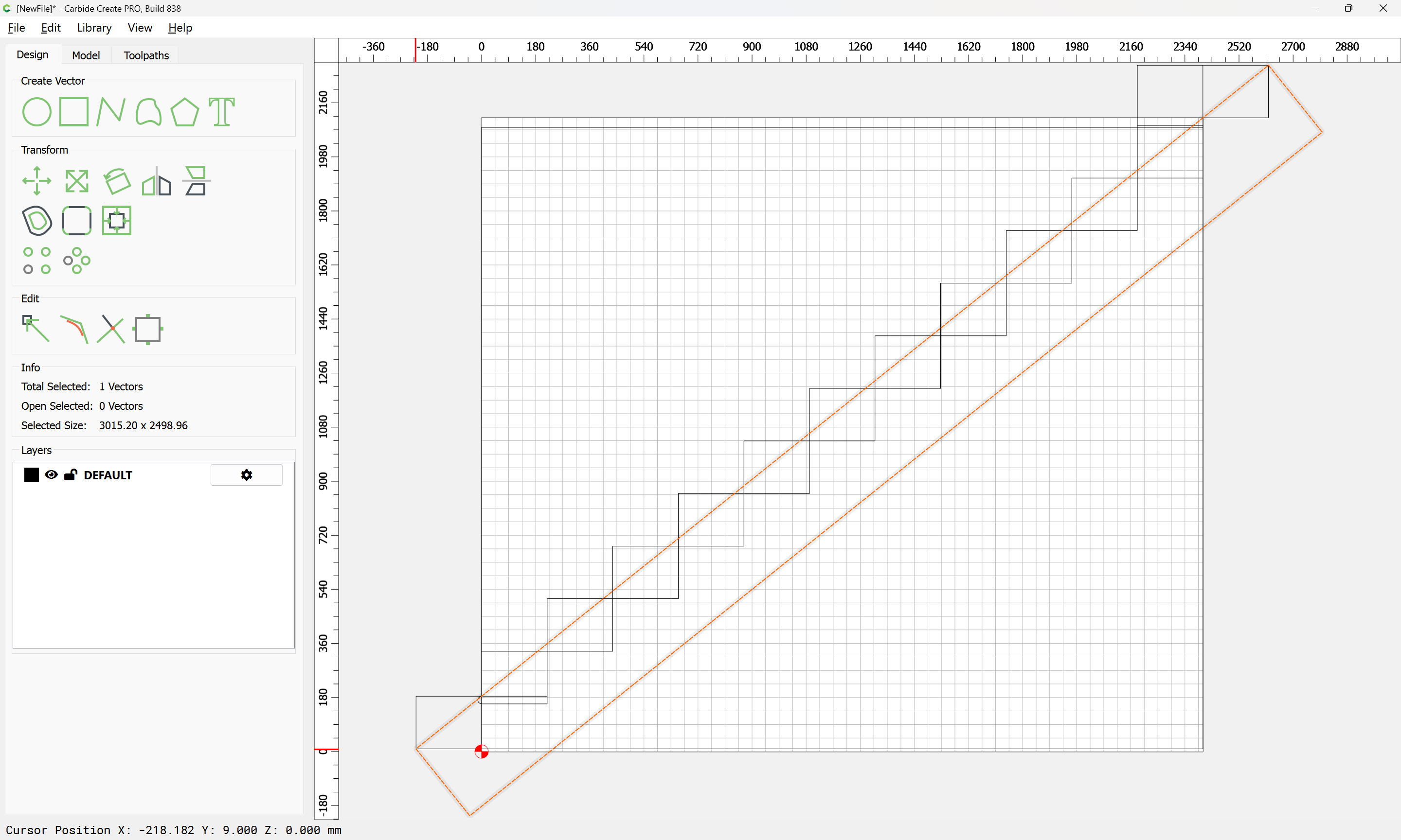 Given all these, it should be pretty straight-forward to just draw up the profile of the stairs and the matching structure, use the Measure tool to get some dimensions, then use Linear Array to duplicate Stair Treads (or a proxy for same), then finally, use the measure tool to get the angle of rotation for a 2x12 and Boolean subtract the stair treads (and the space above) so as to arrive at a stair stringer which may then be measured and cut traditionally, or if one wishes to go the full monte, cut on the machine using tiling if need be (but of course that would then require a bit of adjustment in the stair treads (rounding over the bottom edge to match the radius of the tool used) as well as sourcing a “long reach” tool to cut through 2" construction lumber.