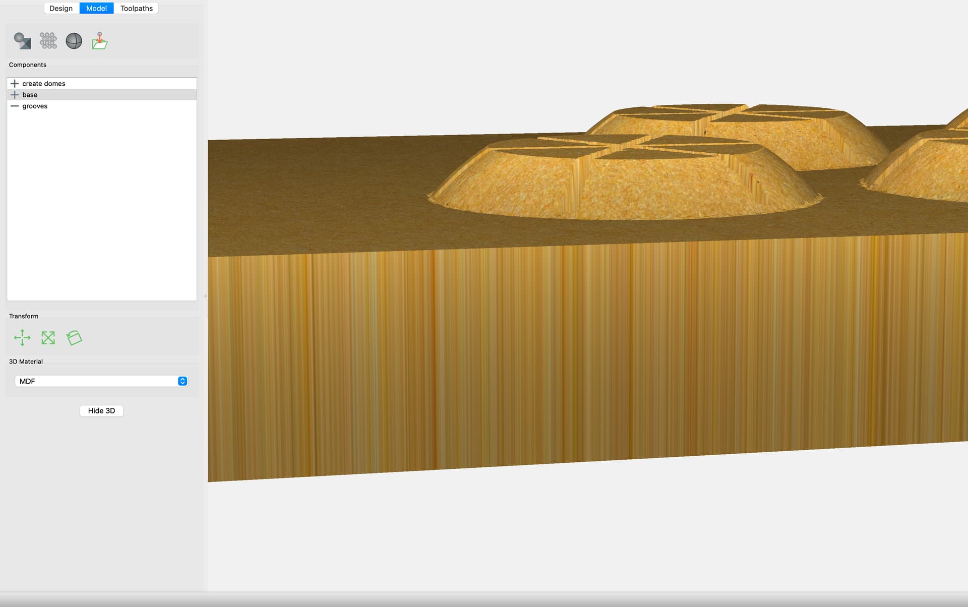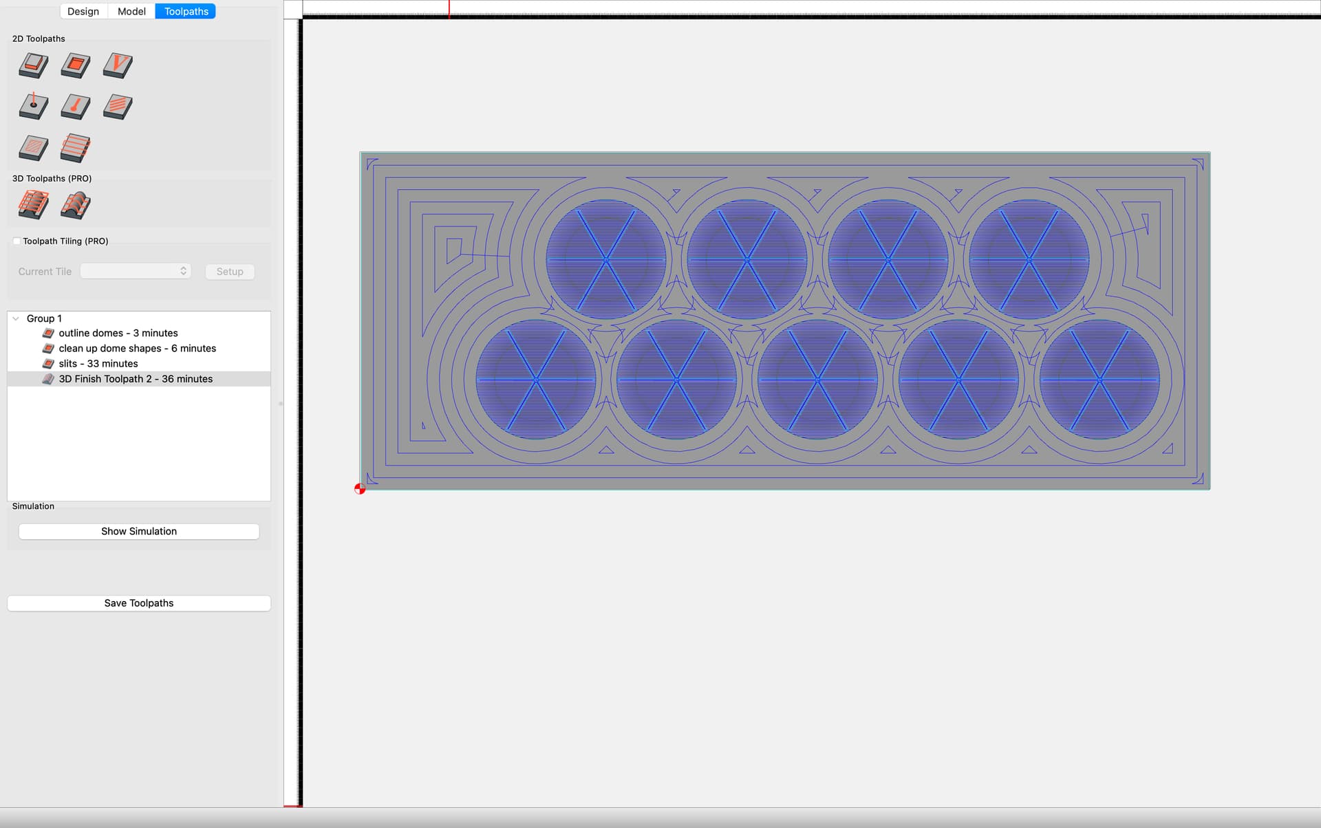 Any advice will be greatly appreciated. I’m also not at all sure how thick a piece of stock I need to start with or what thickness to input into Carbide Motion, as the process, as I got it from the tutorials, was to start with a stock thickness then extrude the flattened domes on top of it.