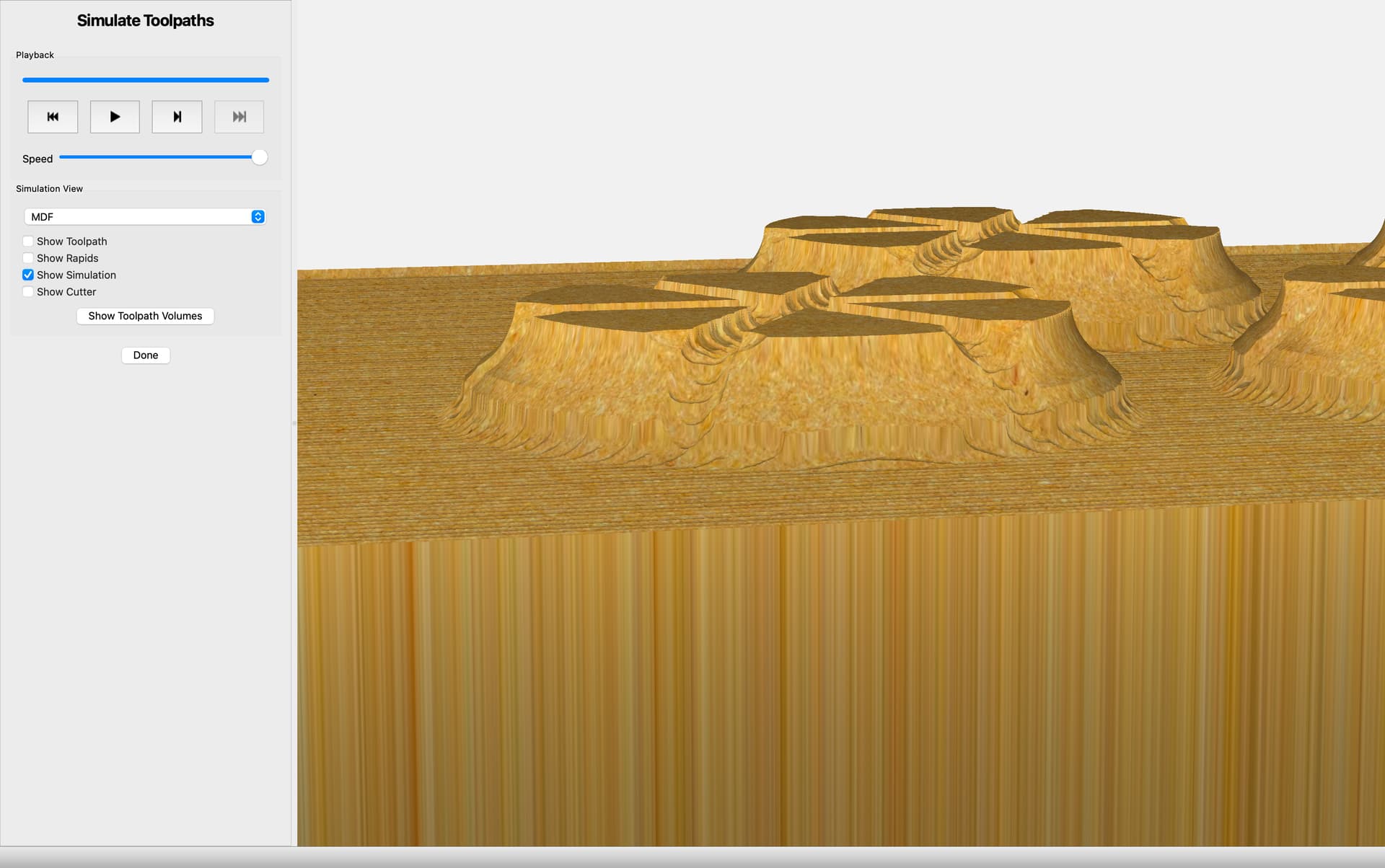 Here’s what I got after applying toolpaths; the edges now have a weird ogee shape rather than a smooth curve, the grooves are much wider than expected, and it all looks pretty ragged