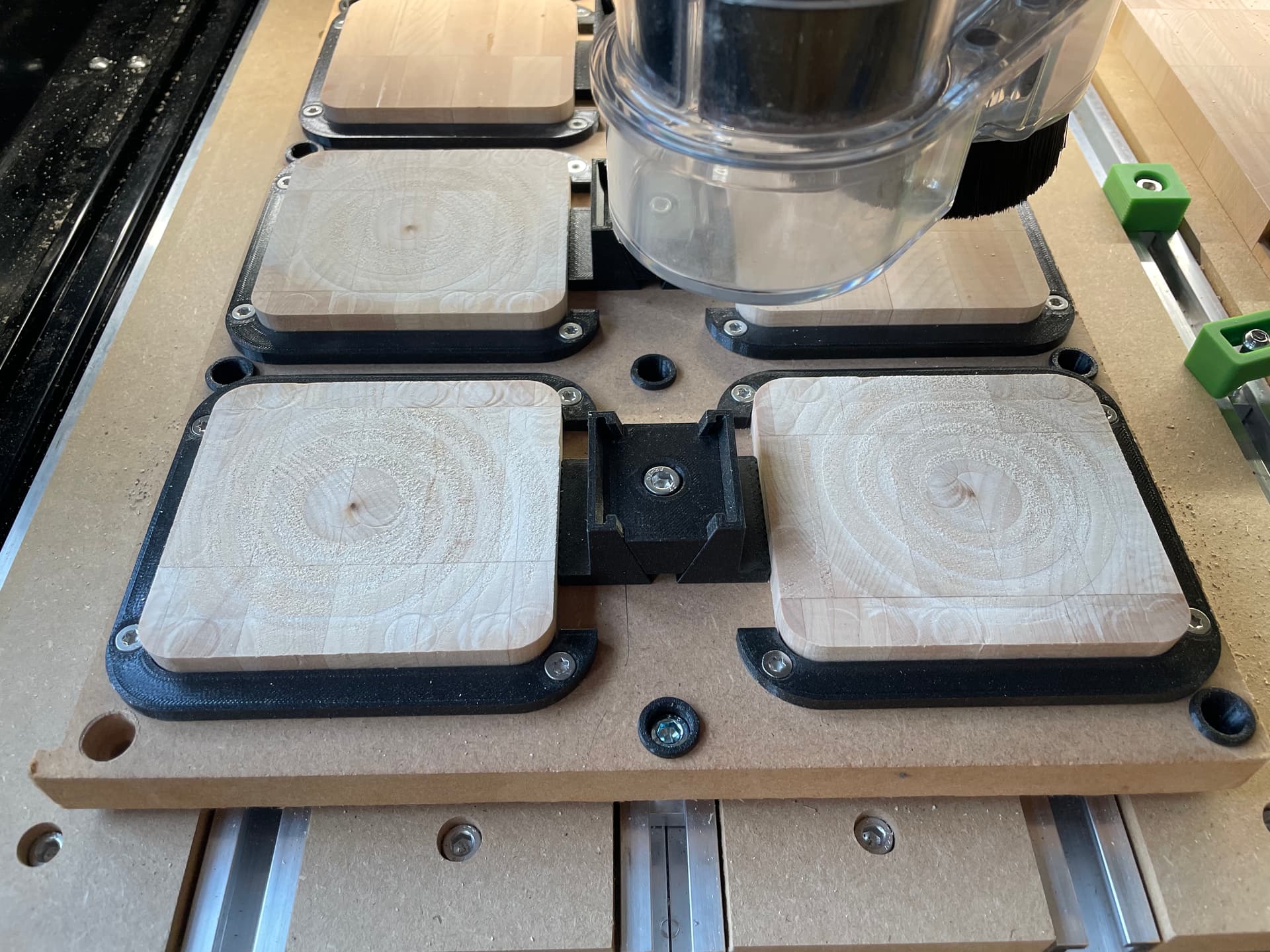 My Jig for clamping them in place is clamped to the shapeoko workbed using the t-track down the center using the lowest torque on my dewalt drill of #1 so not to cause any uneven deflection of the 25mm MDF base