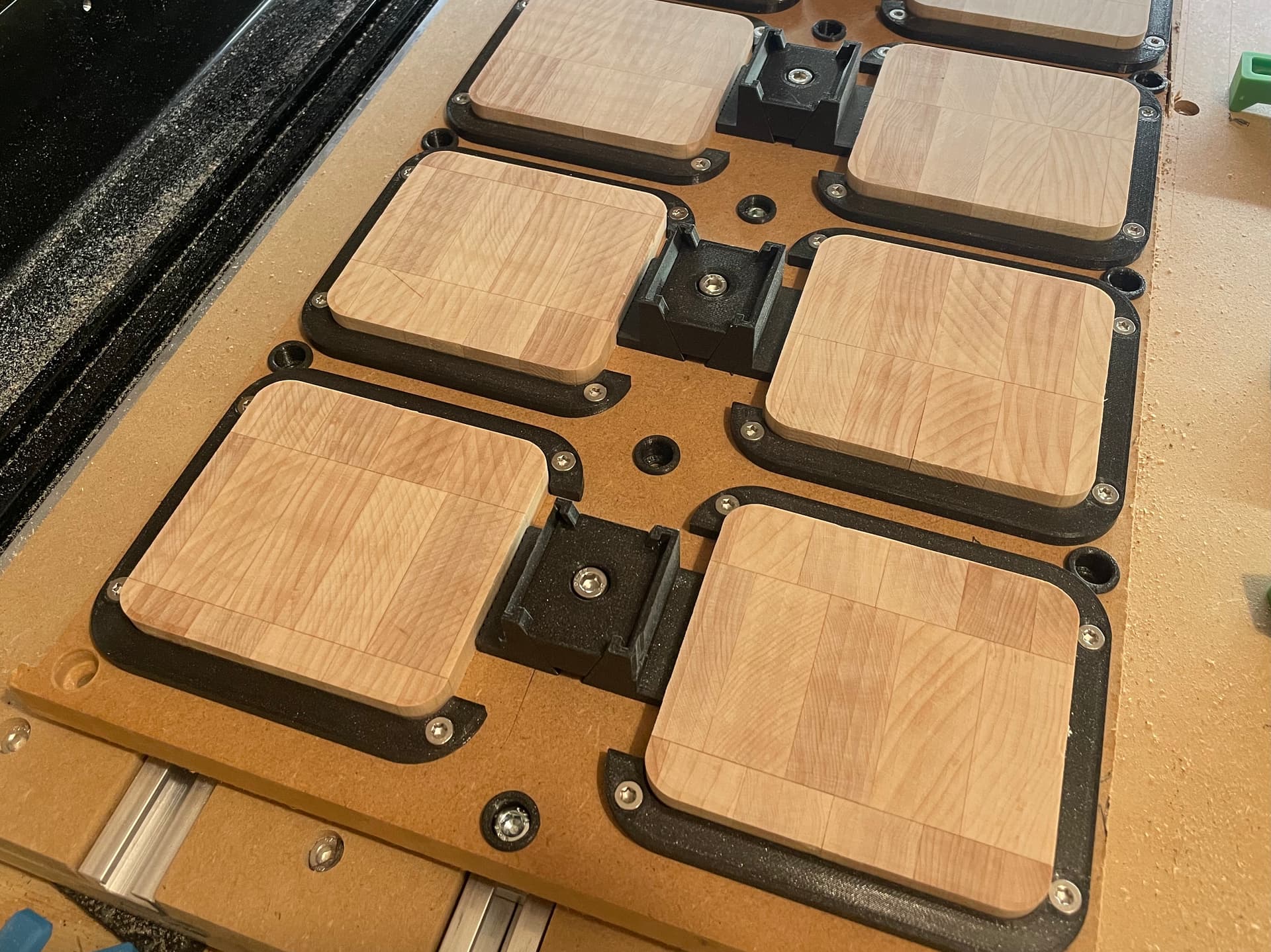 Clean up the glue and flatten both faces of the inlayed 100 x 100 in a surfacing jig on the cnc I’ve made that clamps them in in repeatable positions quickly.