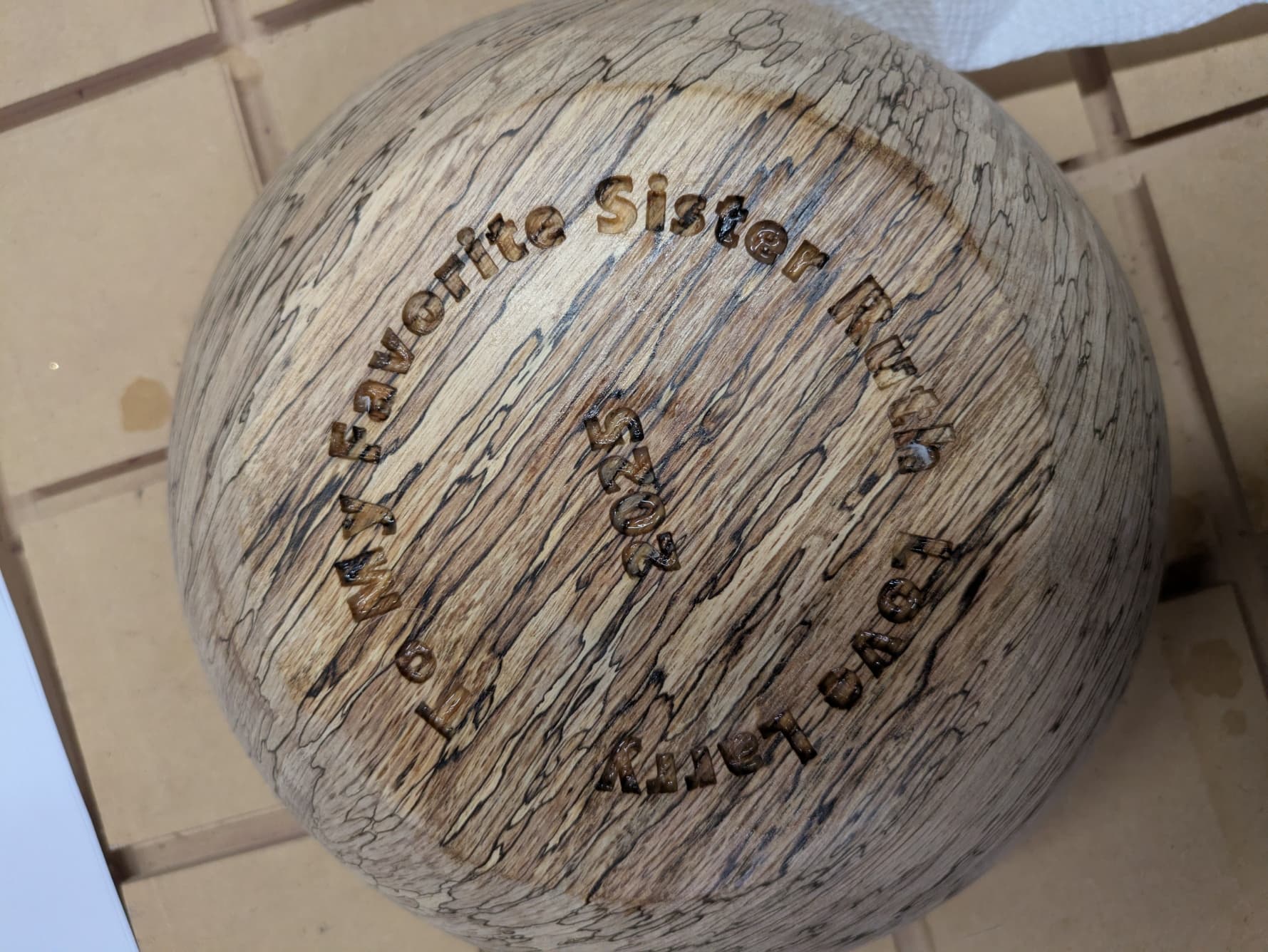 I turned a spalted oak bowl on my lathe. I put an engraving on the bottom. I placed the bowl on the spoilboard and slowly jogged to make sure the bowl would not hit the bottom of the Z. It just barely cleared. I did the engraving and put some sanding sealer on it and will paint it tomorrow.