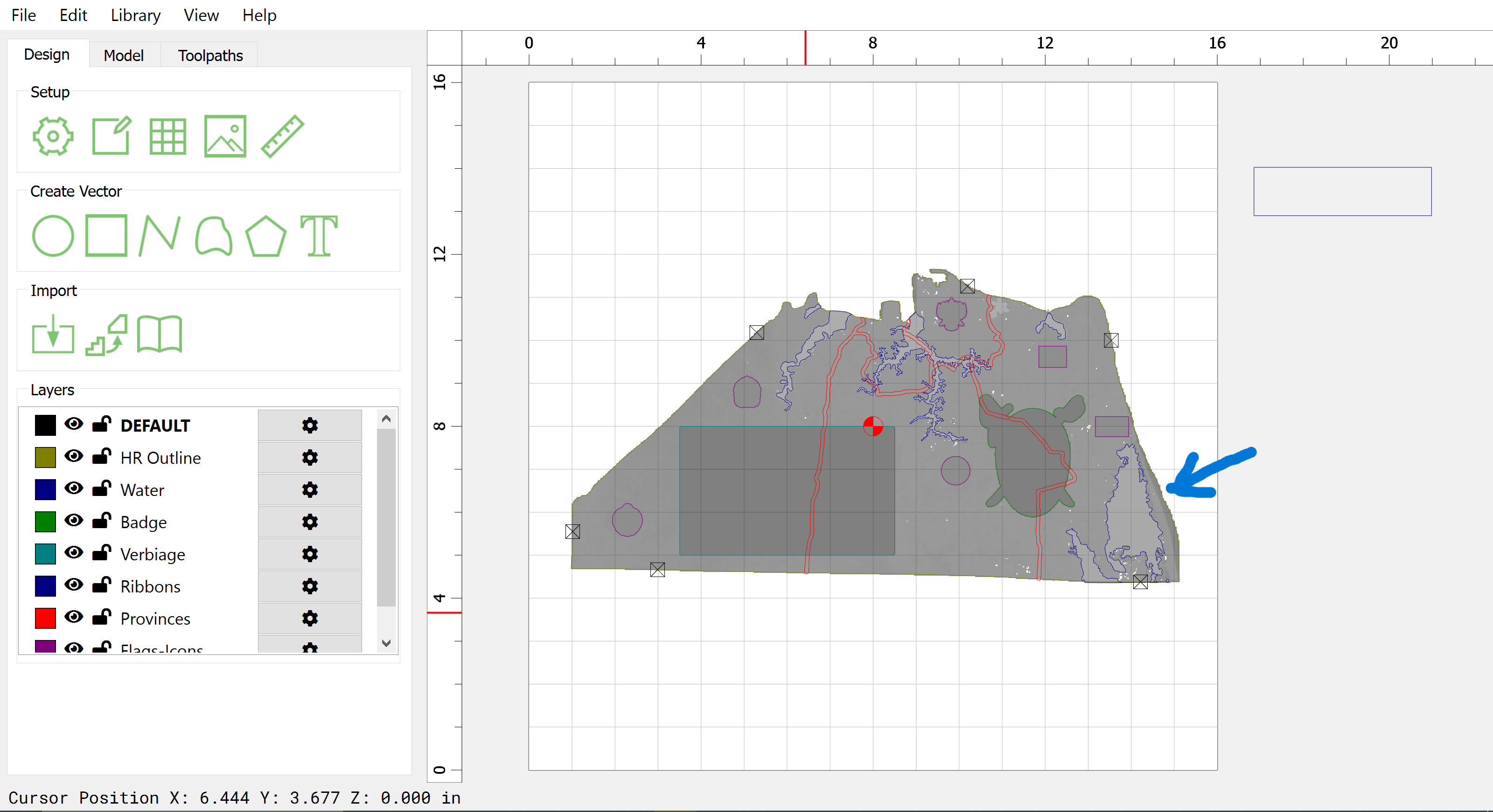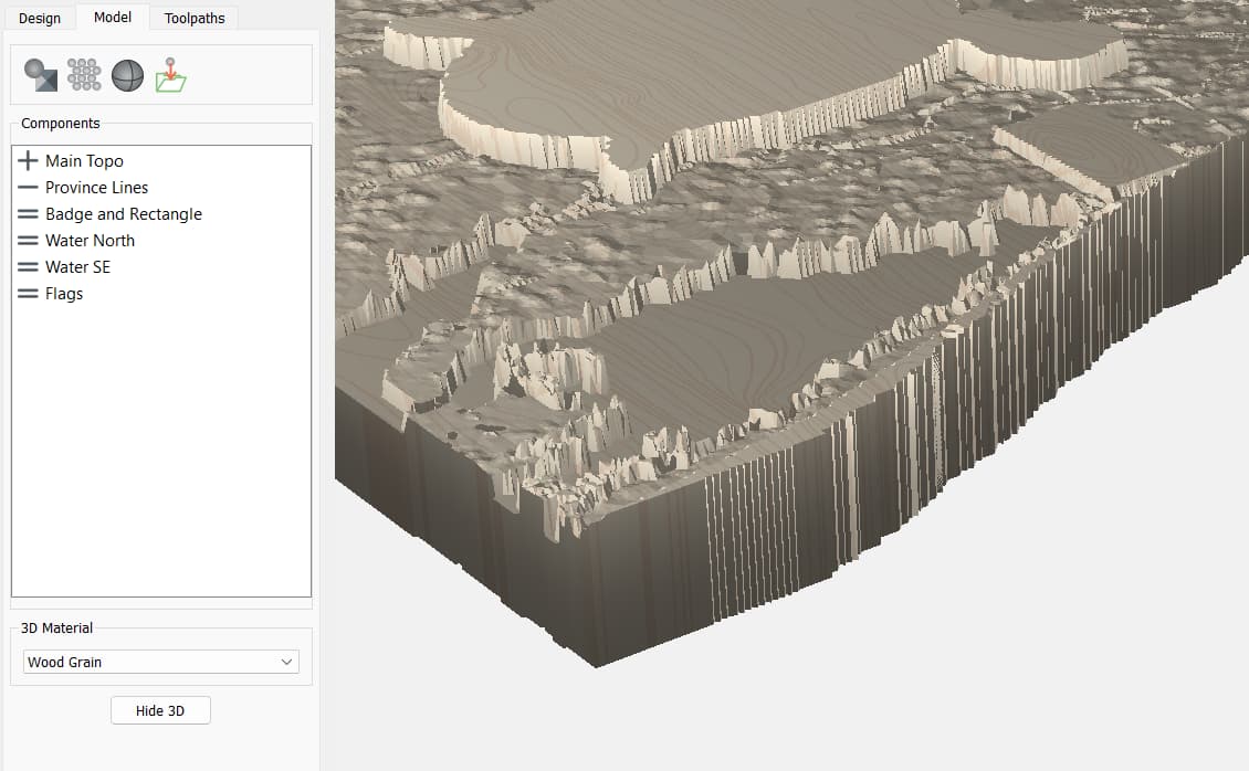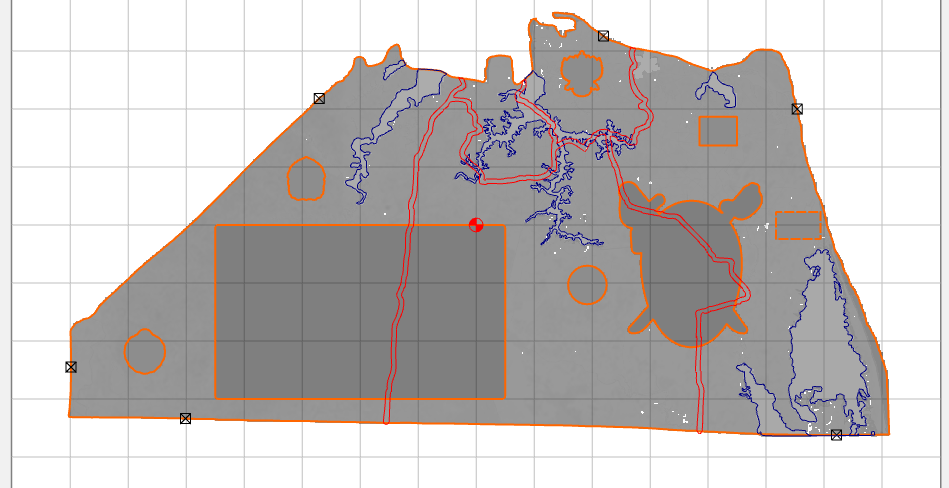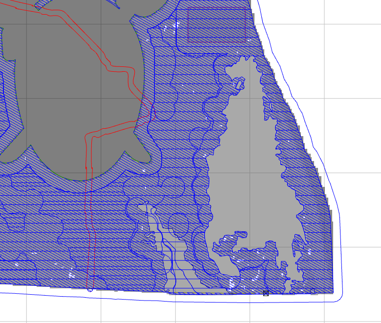 I am having a problem with one area of a 3D model I am trying to create. I am trying to get the lake at the bottom right (blue outline) to sit just below the terrain (about 2-3mm) so that I can put a thin layer of epoxy in there. I am using the EQUAL merge and starting it at a base height of 3.5 inches and then just adding about .1 inches to it (none of the other merge options seem to get me an even shallow bowl).