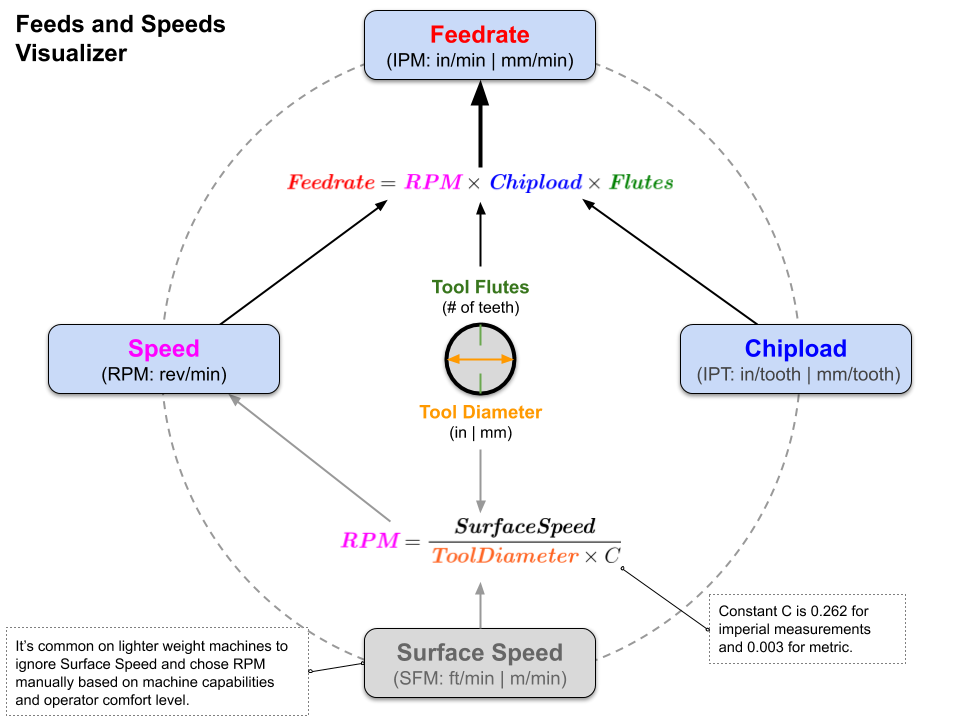 I am trying to get a better intuition for how the various feeds and speeds parameters interplay. And being a very visual learner I created a diagram for myself and figured I would share in case it helps others.