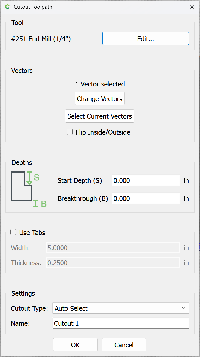 Note that the Stock Thickness matches the Cutting Flute Length of the tool in question — you’ll want to be careful of rubbing the collet against the top surface.