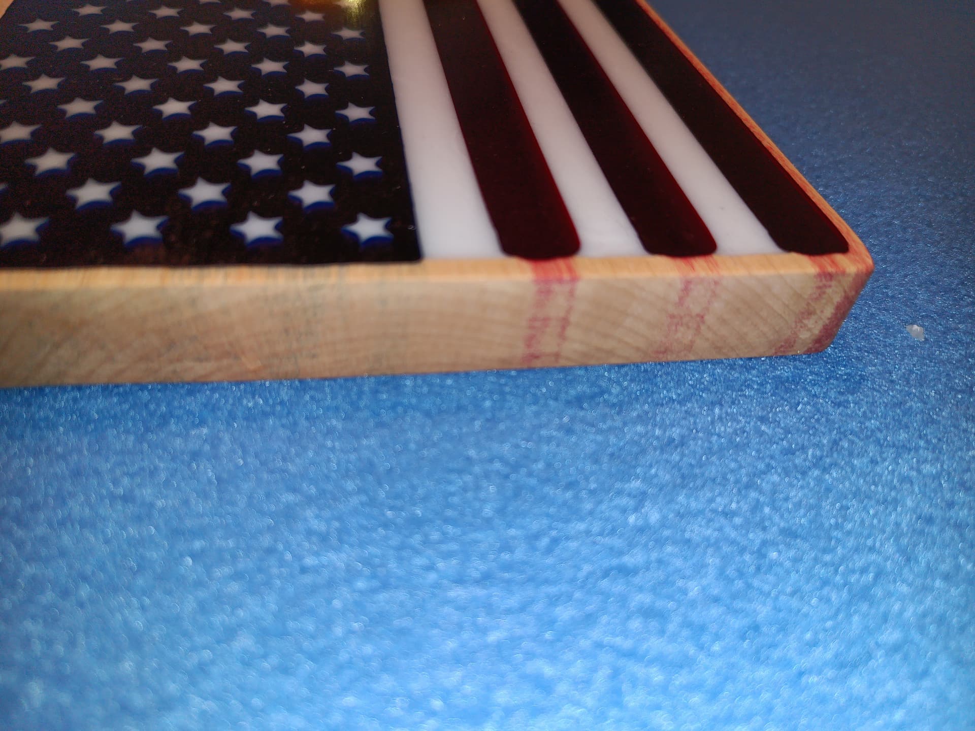 probably shellack coat? Adds another step to the plenty. And: with that penetration it indeed disappeares in the wood, after some minutes the surface of the just cast resin is sunk. If one tries to cast a “heap” of resin, because it appears so viscous: the resin decides now to become fluid, and flows around everywhere, and just a painters’ tape is by far not enough to hold it: resin will find tiny holes to escape. - there are translucent dyes, if one does not take those the resin will not be translucent (the blue isn’t)